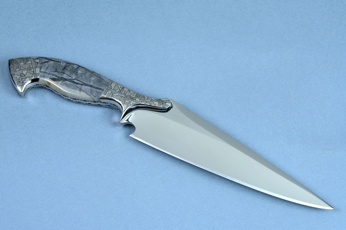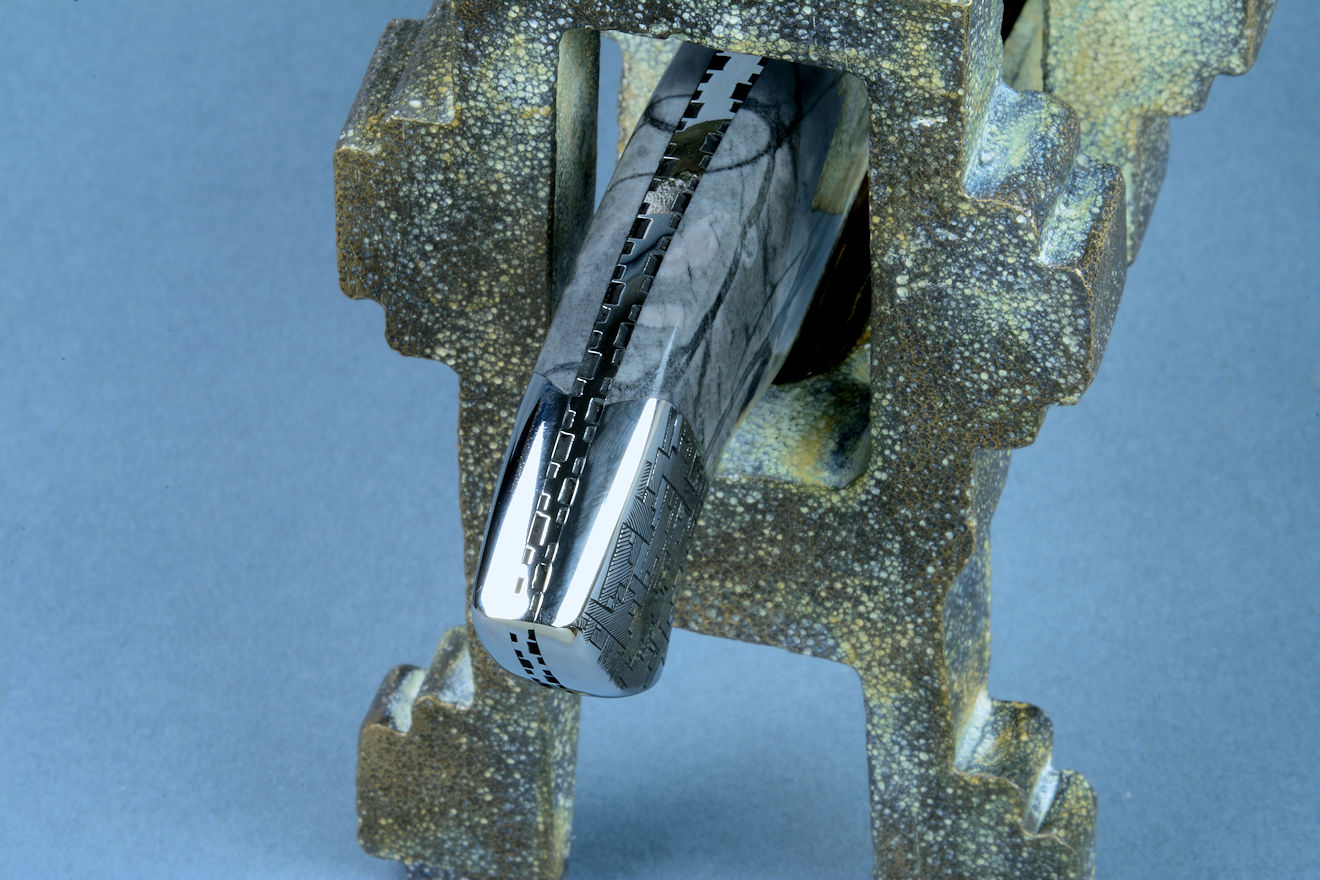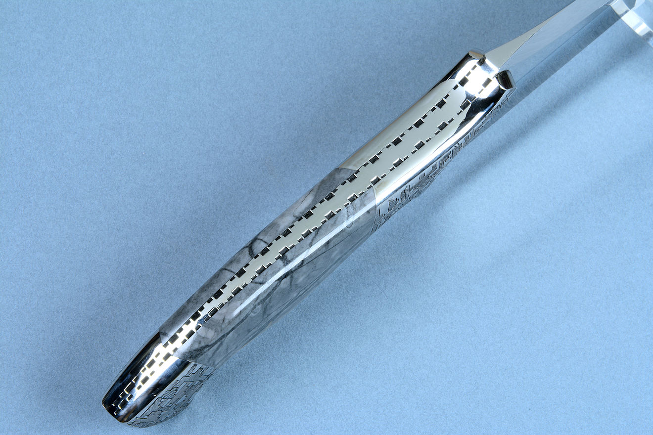 The Picasso Marble displays hard angles, straight and geometric forms, gentle changes in tone in distinctive grays and hints of gold. The closest artistic style would be art deco, with almost an architectural regularity of hard-angled shapes. I followed this design idea into the geometric squared forms of the filework, and displayed it in the hand-engraving of the bolsters, and blossomed the form in the bronze sculpture. Even the very complex patina of the bronze with grays, whites, and golds follows the form and idea. The patina was accomplished with potassium sulfate, bismuth nitrate, and titanium dioxide. I included a polished gemstone on the nameplate with rough, cleaved surface for contrast. The nameplate details the intense age of the rock, 270 million years ago. It's just astounding to think that was was once mud and remains of tidal pools was forced into beautiful gem.