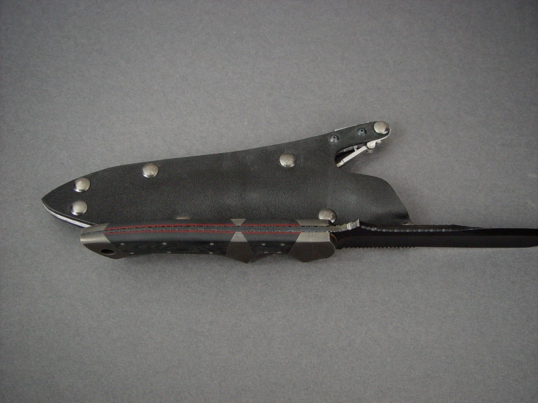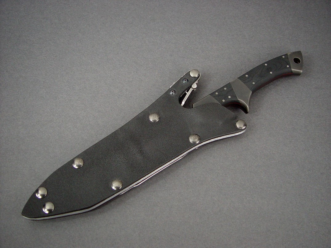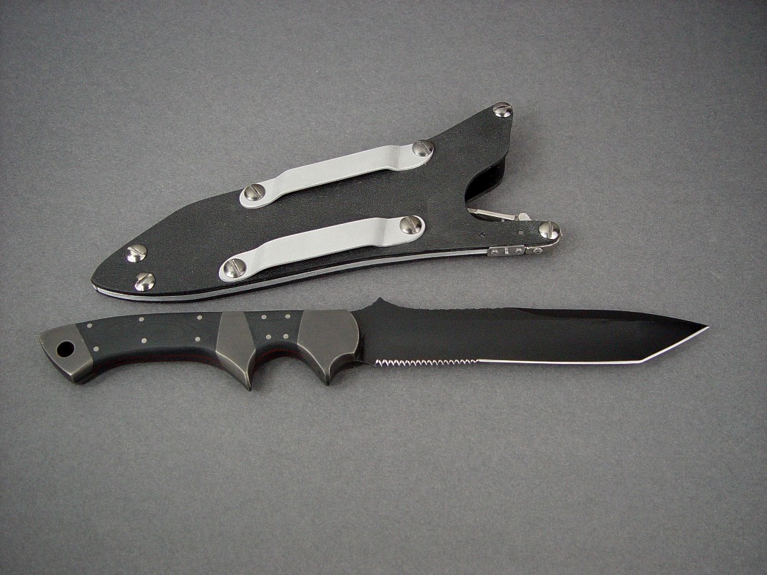 This Minuteman is all business, with a hollow ground tanto blade in bead blasted and hot-blued O1 high carbon tungsten-vanadium tool steel, with a top half-length swage to reduce point profile while preserving strength in the spine of the blade. The blade has several inches of standard serrations, and is a full tang knife: one solid piece of tool steel from point to butt. The knife is bolstered with corrosion-resistant nickel silver bolsters, all dovetailed, and all six bolsters are cold blued to mute the finish. The bolsters bed two pairs of paper Micarta phenolic handle scales that are bead blasted to match the blade and are secured with ten nickel silver pins for absolute rigidity. I included a hint of deep red color in the vulcanized fiber spacers against the tang, which is fileworked. The sheath is one of my positively locking kydex, aluminum, blued steel models with all stainless steel locking mechanism. A great tactical combat knife.