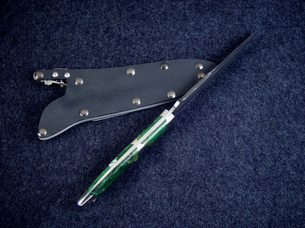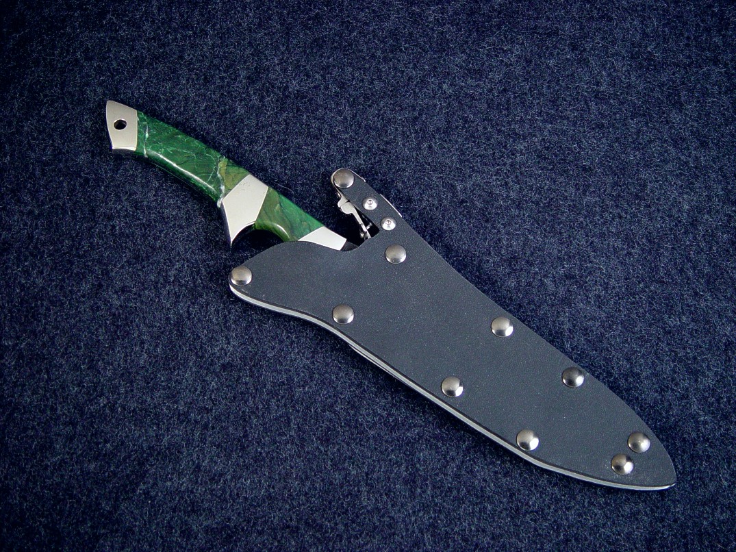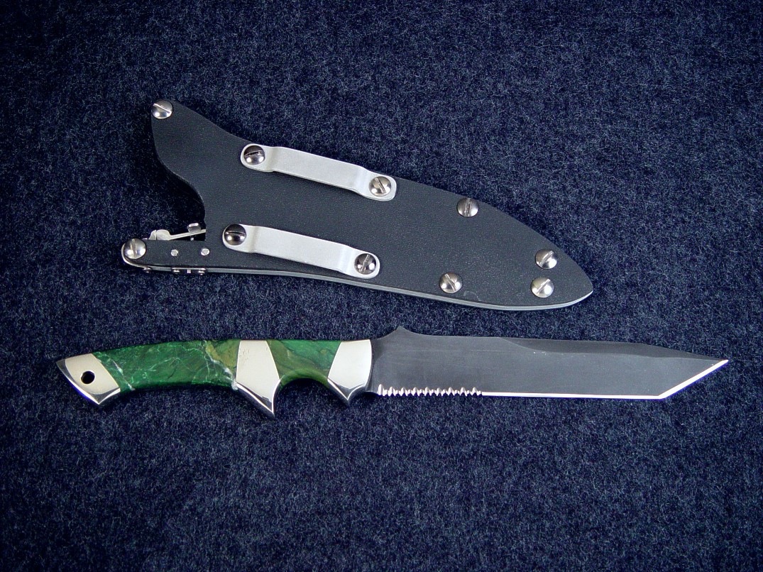 The Minuteman is a large tanto that I typically make for servicemen in combat, but it also is deserving of collector's status because it's a beautiful knife. This one has a bead blasted and hot blued O-1 high carbon tungsten-vanadium tool steel blade, with two inches of aggressive serrations and a half-length top swage. The bolsters (three pairs) are brightly polished nickel silver, and the handle is striking Budstone (Verdite) gemstone from Africa. The sheath is one of my locking models, in double thick kydex, corrosion resistant high strength aluminum, and all stainless steel locking components with blued steel Chicago screws. A beautiful and durable knife.
