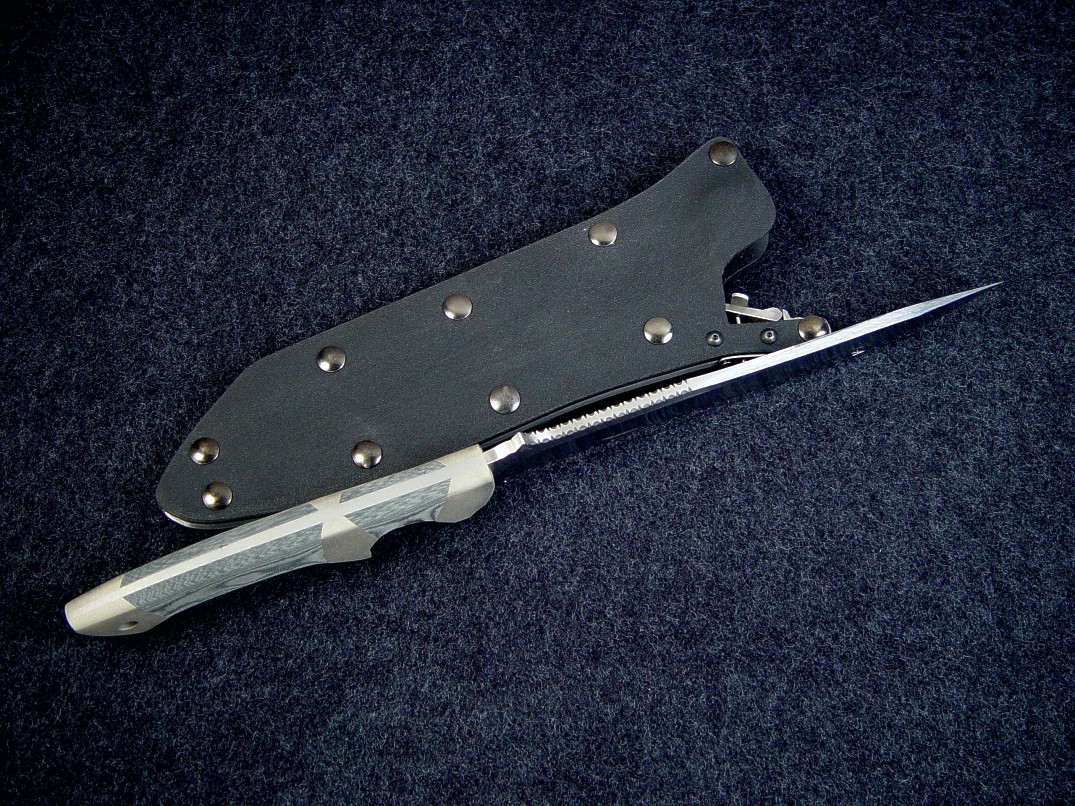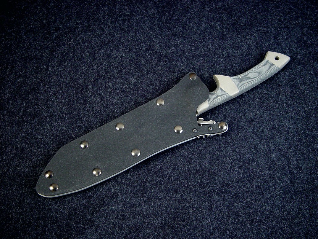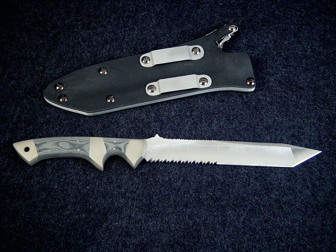 The Minuteman is a proven combat grade tactical knife, and this one is going into battle with one of our army soldiers. This is a serious large knife; the "EL" designation is for the extra length blade, a derivative of my standard Minuteman pattern. The soldier who commissioned this knife wanted an extra super hard and tough blade, so the knife is made from D2. D2 is an extremely high carbon die steel, one of the highest performance rated tool steels, designed to cut and punch out other metals in die use in the machine tool industry. It's expensive, hard to machine, tough to finish, and has the reputation of "holding an edge forever and being impossible to sharpen." Though this is an exaggeration, usually only power equipment and a lot of elbow grease can accomplish a good sharpening. The advantage of this is extremely high wear resistance. With 12% chromium, D2 is corrosion resistant, but does not quite classify as stainless steel. The blade is finished with a satin look, for a clean blade that the client will not be afraid to scratch. The soldier wanted plenty of canted, aggressive rip teeth, an the central bolster sub-hilt handle arrangement helps deliver the power to pull and cut. The blade has a bit of filework, just enough for traction on the blade spine in front of the thumb rise, and the handle has a fully tapered tang for weight balance. The knife has nickel silver bolsters for corrosion control, and a micarta phenolic handle, all bead blasted for good tactile grip. This knife is carried locked into one of my fine military grade locking sheaths, a waterproof combat sheath made of 40 components, double thickness kydex, 5052H32 corrosion resistant aluminum, 302, 304, 440c and 410 stainless steel mechanical components, and blued steel fasteners. For the field of combat, this is about as serious as it gets!