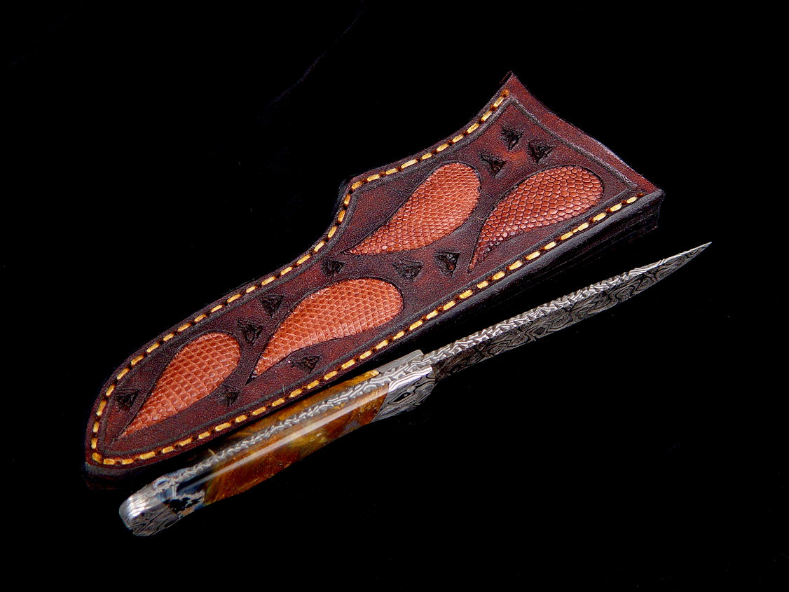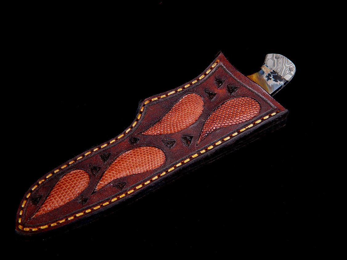 The "Mizar" is named for the one of the double stars in the handle of the big dipper constellation. This is an older knife, and I made the blade in pattern welded damascus with O1 oil hardening tool steel and A36 structural steel. I also made the bolsters in the same steel and etched the entire knife. The handle is made of African Pietersite, a brecciated tiger eye gemstone with an inlaid escutcheon plate with my maker's mark. I made the sheath in hand-carved leather shoulder inlaid with Tegu lizard skin, hand-stitched with polyester sinew.