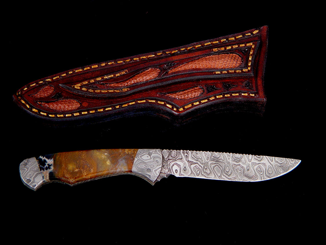 This was an unusual endeavor into bowie-land, and I made it many years ago (in the last century!) and the knife is displayed here in a "day of the dead" type of setting. Based on my Southern bowie pattern, the blade I made in 440C high chromium stainless steel. I hand-engraved a vertical sliced scene of the Mohave desert. I selectively electroplated 24 kt. gold over some of the creatures, not easy to do in 440C, which is resistant to all types of plating. I made the guard, pommel, and spacers of brass, and hand-engraved them. The handle is starburst jasper gemstone from Mexico, and the stand I made from Ocotillo cactus skeleton inlaid with genuine turquoise gemstone and stand caps of starburst jasper. The base is red oak with an etched steel nameplate. The display was temporary and not a permanent part of the artwork, with carved rosewood skulls and miniature mums and zinnias for that bright Day of the Dead holiday appeal, long before the style was popularized in the United States! A nice older work to visit.