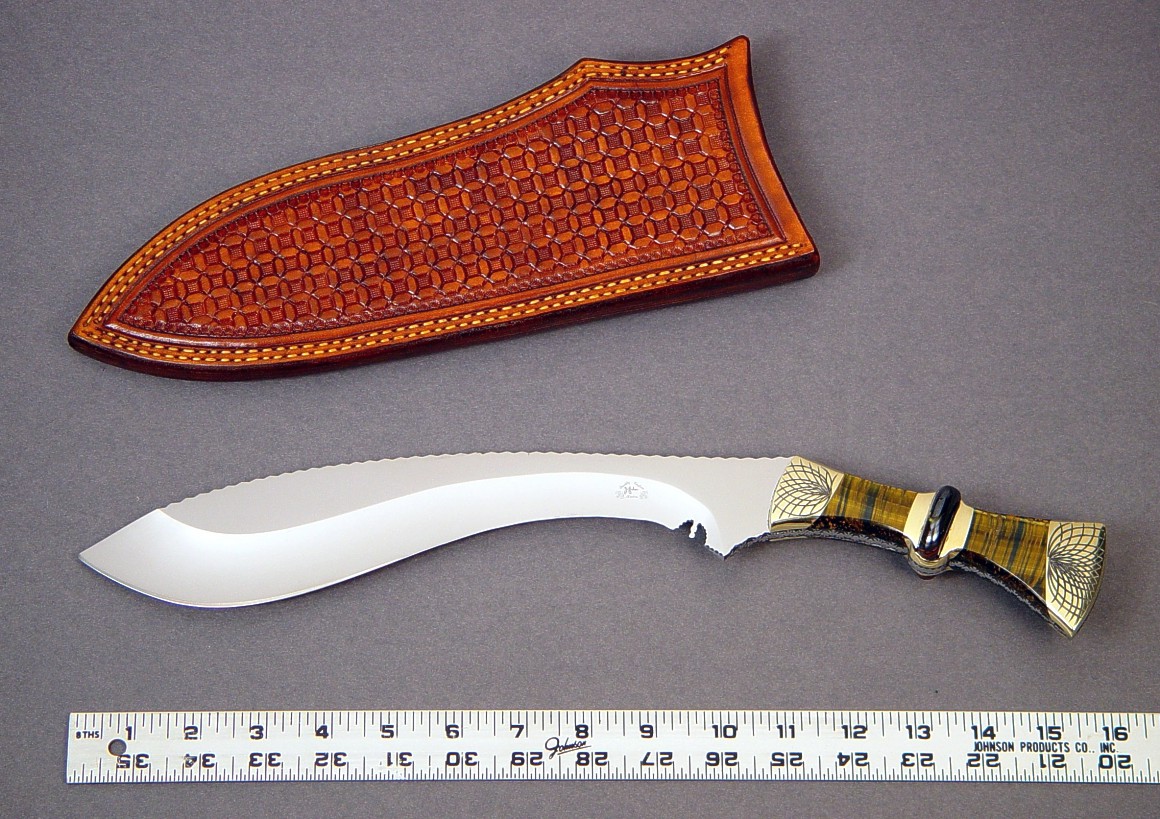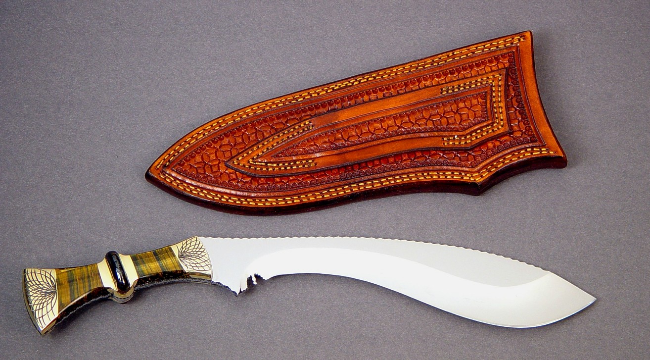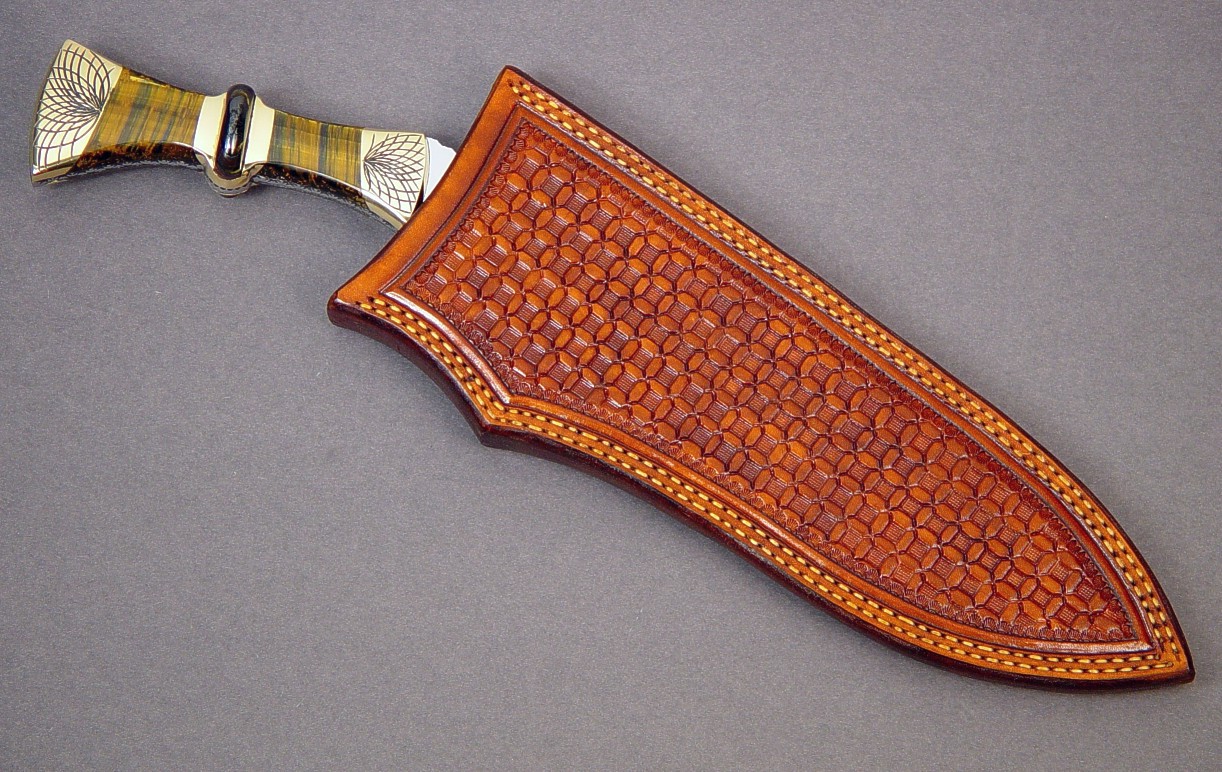 central brass bolsters. The sheath is double stitched hand-tooled, and made of 9-10 oz. thick leather