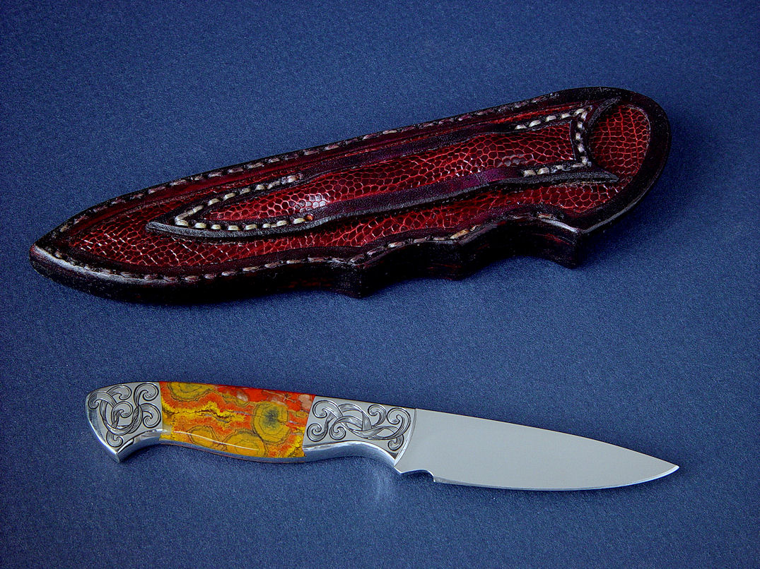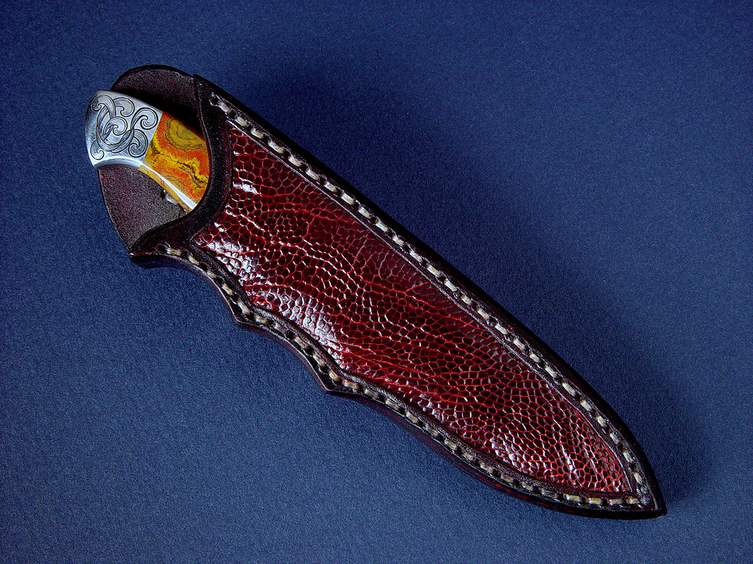 Sheath: Hand-carved Leather inlaid with Burgundy Ostrich Leg Skin