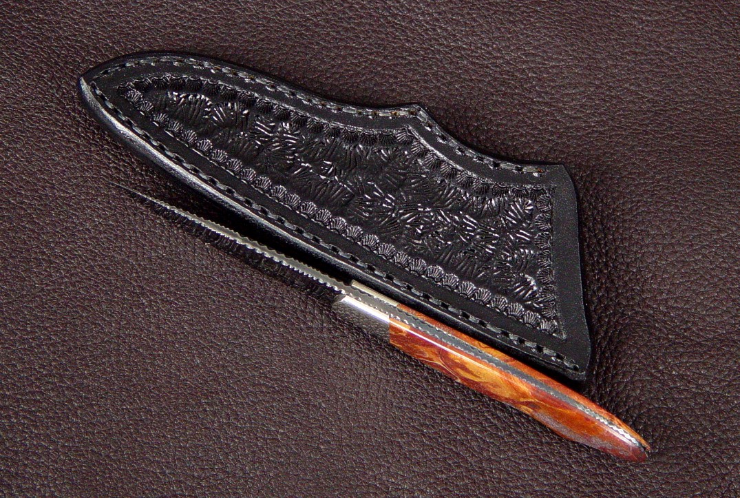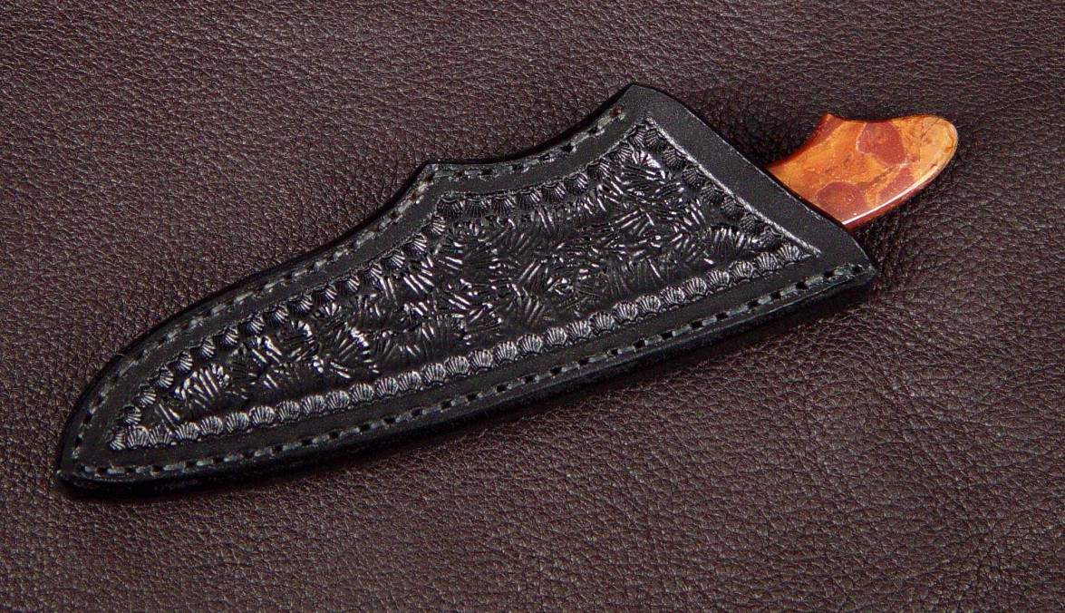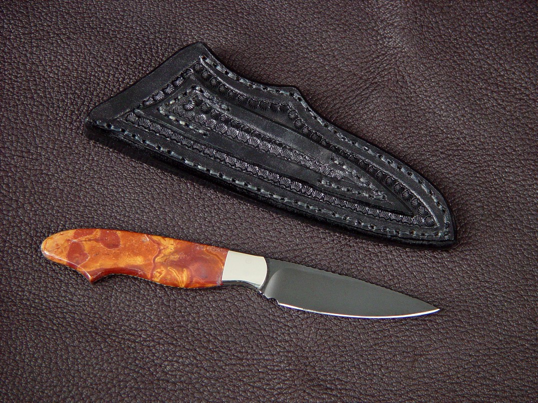 Named for a star in the constellation Lepus (the Rabbit) this is a legacy knife pattern originally designed by Gerry Hurst. This knife is an older/early work of mine; note the maker's mark. I don't make many small knives, but the Nihal is a workable, clean design. Just under 6.5" (16.5 cm) length overall and with a 2.5" (6.4 cm) blade, this Nihal has a mirror polished O1 high carbon tungsten-vanadium tool steel blade, hot blued for a jet black glassy appearance. The blade has full filework, and bolsters of 304 austenitic high nickel, high chromium stainless steel. The handle is Wonderstone Jasper, actually a rhyolite with swirls and twists of reds, oranges, and sunset colors. The sheath is hand-stamped, hand-stitched leather shoulder, dyed black. A great working knife or collector's piece.