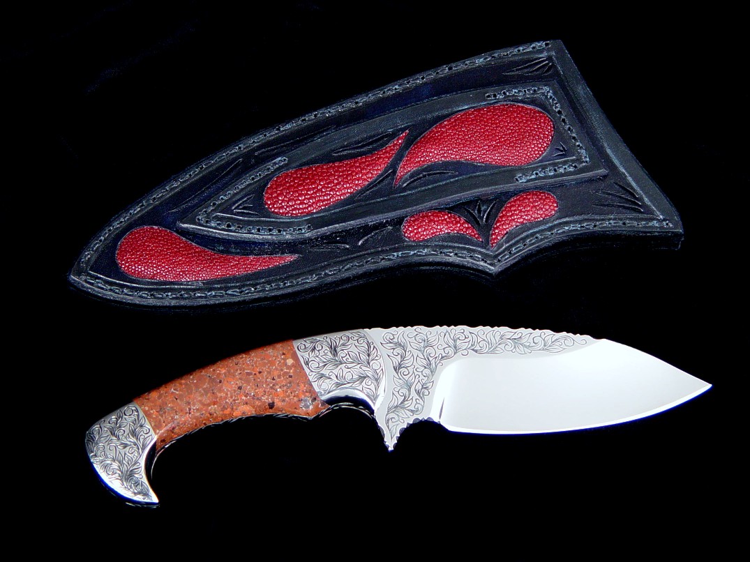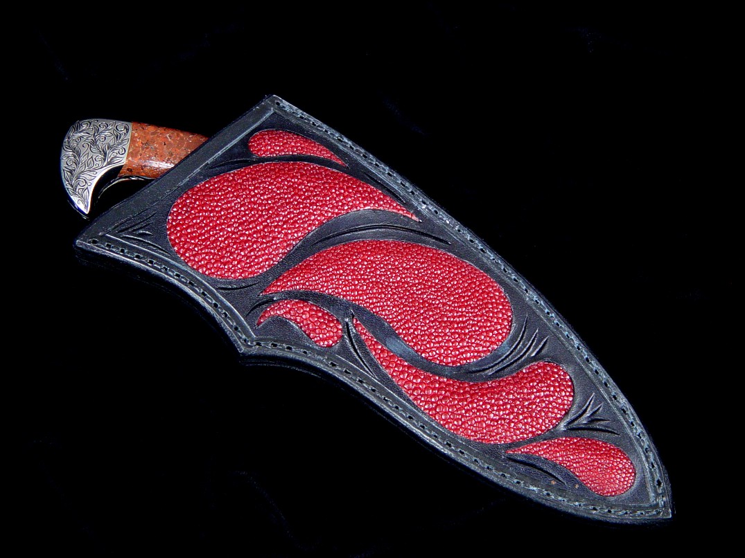 The knife sheath for this one is bold: multiple inlays of red stingray skin inlaid in hand-carved leather shoulder, hand-stitched with nylon, dyed black, lacquered, and sealed.