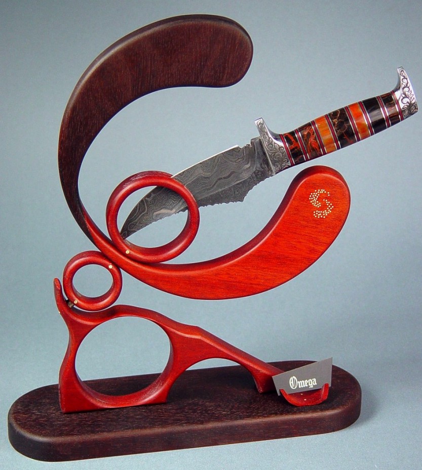 The display stand for the Omega is as intriguing as the knife. I made it from Bloodwood and Tropical Walnut hardwoods, with brass fittings, axles, and pins as well as intricate brass pique work. The stand is articulating, and the knife swivels around in the central ring, while the omega lobes swivel around the outside of that. This allows the knife to be displayed in a wide variety of positions. The base is tropical walnut, and the stand has a machine-engraved black lacquered brass nameplate.