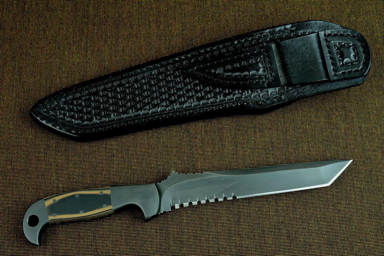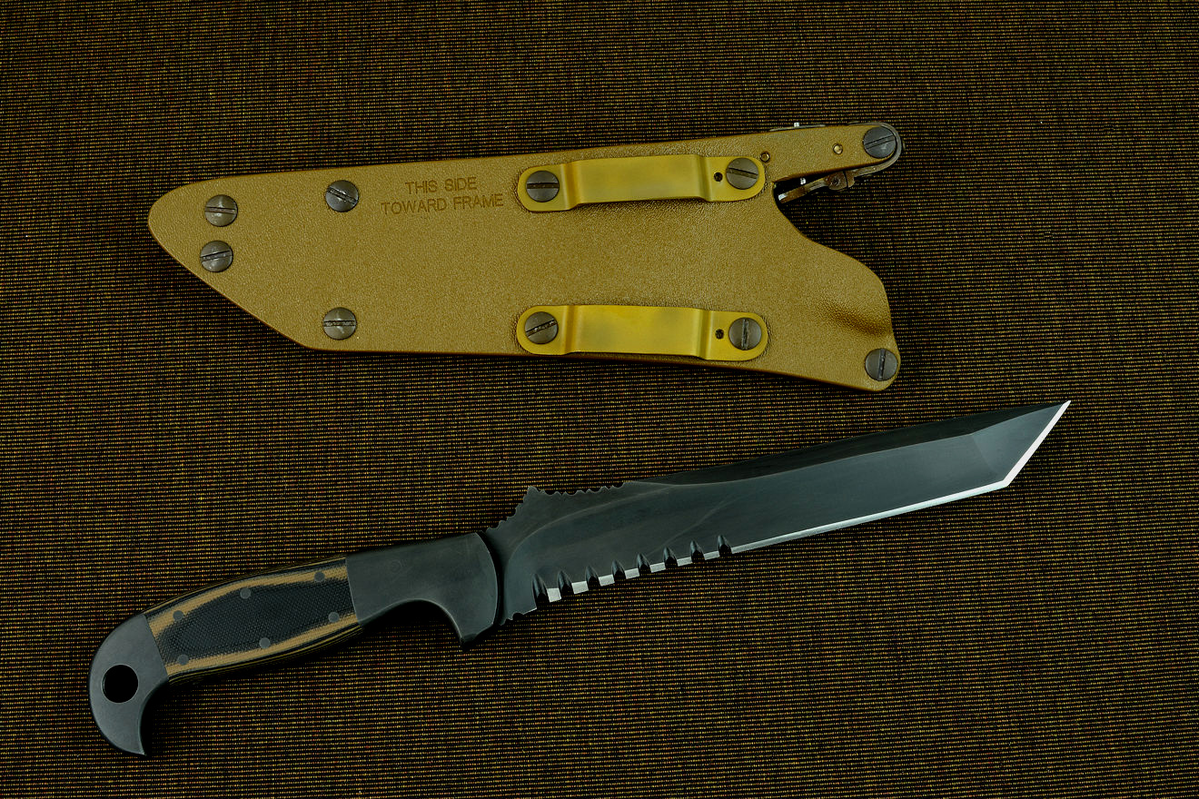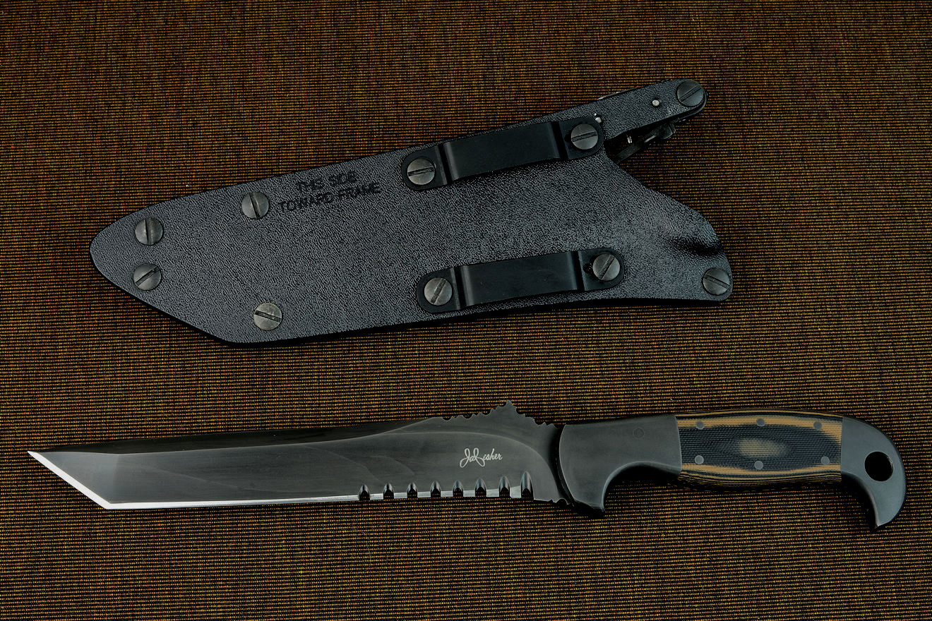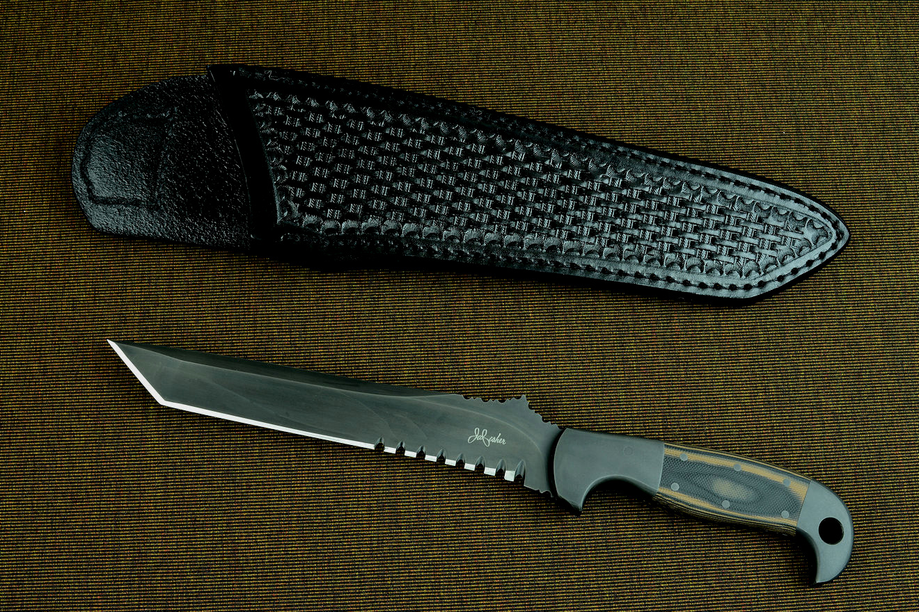 This is a sophisticated evolution of my counterterrorism, survival, and combat knife line, one that is as wide ranging in application as a knife can be. This is my PJ (Pararescue Jumper), originally designed with direct input of decorated United States Air Force Pararescuemen for their use and carry in combat, tactical operations, Combat Search and Rescue, and counterterrorism needs. This is a tremendously robust knife, with over 1/4" in thickness, a long tanto blade with extremely aggressive and tough hammerhead serrations. The tanto style is a knife with a lot of reach, and this aggressive point with a top length swage means the blade has substantial strength in piercing geometry with durability. This is a serious tool, working across many spectrums from survival and stealth to counterterrorism combat. The PJ is my flagship knife for combat, search and rescue, and the progenitor of my "PJLT" (Pararescue Jumper Light), the most popular and desired knife design I've ever made. This PJ incorporates a new and exciting progression of this distinctive type of knife with specific features and modular sheath wear system highly detailed below.