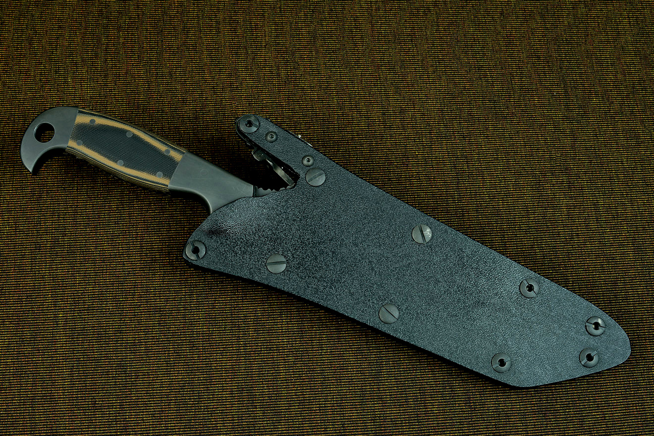 My professional locking sheath is absolutely the finest made in the world today, and has been for many years. I first designed these by request of USAF Pararescuemen in the early 1990s, for this very knife, and in the hundreds I've made, I've never had a failure of a single one. This is because they are extremely well-built, tremendously durable, and highly corrosion resistant. They are completely waterproof, with all surfaces and components either treated, naturally waterproof, or stainless steel. The sheaths are built of double thickness (.125" thick) kydex (methyl acrylate and polyvinyl chloride) over a welt-frame of black or coyote brown tan anodized 5052H32 corrosion resistant high strength aluminum alloy. I've meticulously anodized all of the aluminum surfaces, even through holes, of each welt component, mount, fitting, and fixture for extremely high durability, ultimate corrosion resistance, strength enhancement, and muted or matching camouflage appearance. If you're not familiar with anodization, it's a chemo-electric process that creates a near-ceramic hard surface on the aluminum alloy, a surface that increases wear resistance tremendously, and a surface that can accept permanent dyes that are sealed in place. For my black kydex sheaths, the anodized aluminum color is black for low reflectivity and matching appearance, and for the coyote brown tan sheaths, the aluminum closely matches the sheath kydex and modern desert camo gear. For high durability, the anodized surface is a full 1 mil thick, and is sealed with a process that resists sunlight bleaching to the highest degree. The sheath is bonded with high strength waterproof cement and bolted together with all appropriately colored or darkened 304 stainless steel slotted Chicago screws for zero care and extreme corrosion resistance while being minimized and non-reflective.