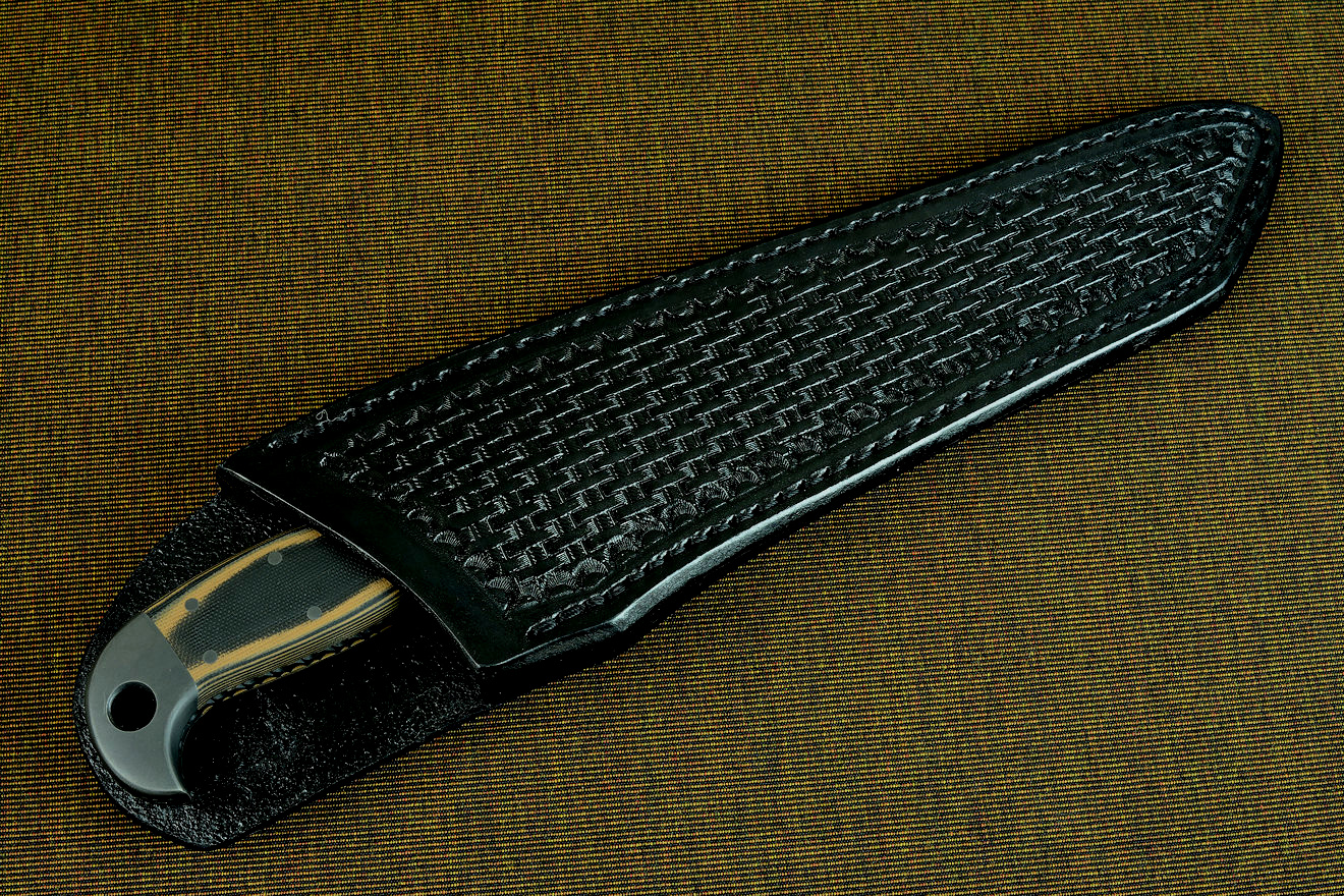This knife package also includes a basketweave pattern hand-stamped leather sheath, made of 9-10 oz. leather shoulder, dyed black and sealed. The sheath was included for quiet operations, when moving against hard objects (concrete or stone) could telegraph a position through noise. It's also useful for traditional and conventional wear options. The sheath has double-row stitching throughout, and at the belt loop with the toughest polyester thread, water and sunlight resistant. The knife fits deep and secure into the sheath, with the handle exposed and the back of the sheath rises high to protect the wearer. The entire sheath (body and welts) is double-row stitched for extreme durability. The sheath edges are dressed and smoothed for comfort; the entire sheath is sealed with acrylic for water resistance, permanence, and longevity.
