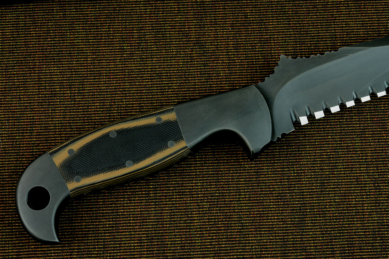 The feel of this knife is solid and tough with a long, determined reach and an unyielding straight-razor cutting edge. This is a tremendously adaptable professional wide-field knife, at home in marine or desert environments, from the arctic to the equator and every place in between. This is why USAF Pararescuemen have requested these so often, as their range of tactical and combat work is everywhere others won't go. The knife balances exactly at the forefinger placement, and feels completely useable with the very long and capable reach of the 7.5" blade length. The handle is large enough to accommodate tactical gloves in a large hand. The blade has almost 2.5" of my tough, tremendously popular hammerhead serrations, made to aggressively rip through heavy textiles, plastics, and even some light metals, the most asked-for serrations I create. Please remember that this knife has a proven record in the hands of many United States Air Force Pararescuemen, and is their number one primary edged weapon and tool. I've made this knife for PJs for over 20 years for a reason.