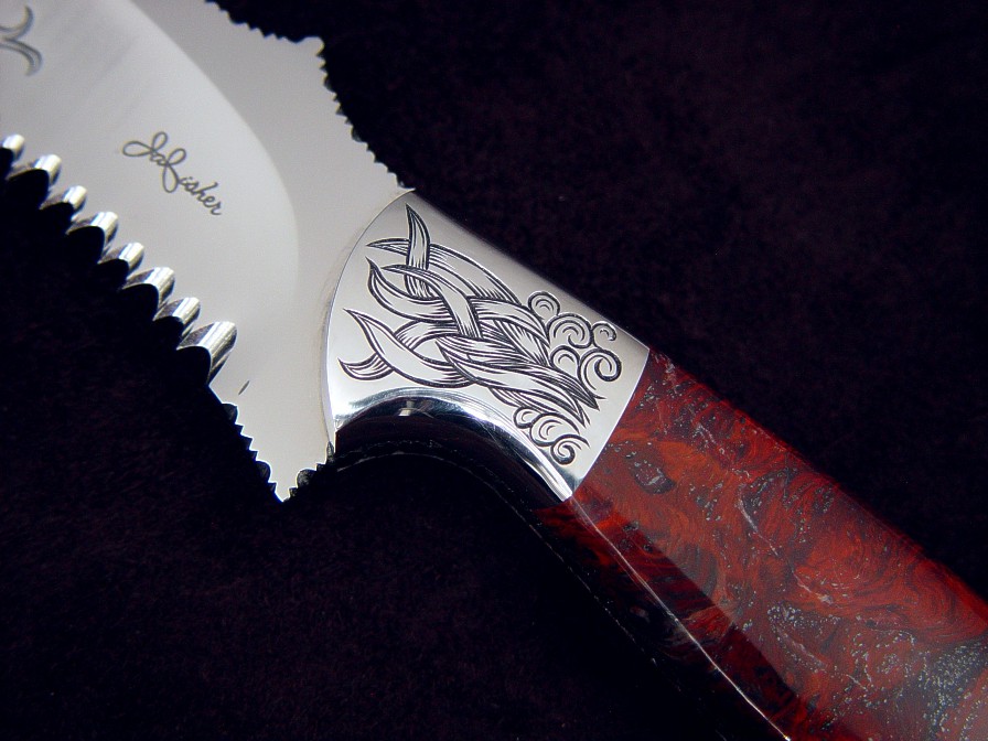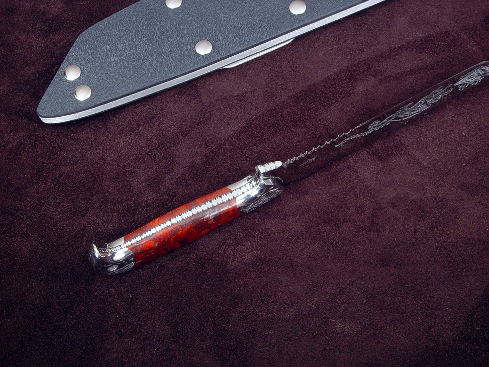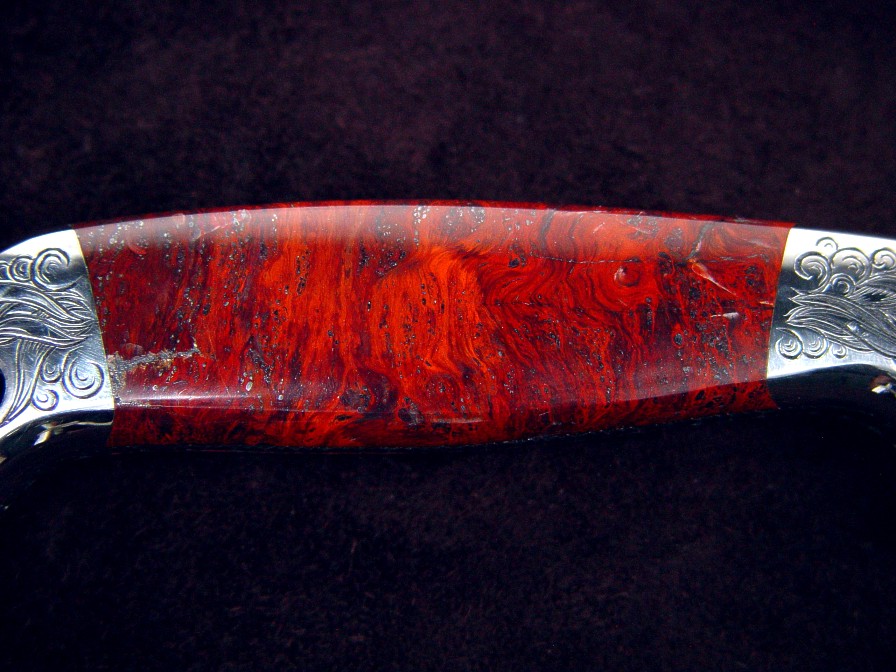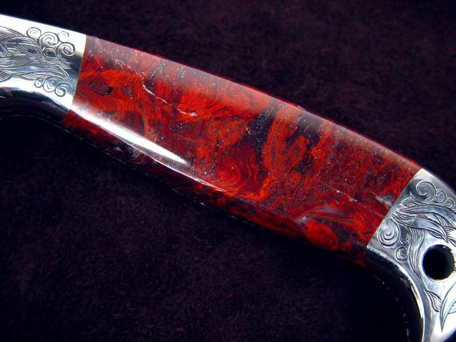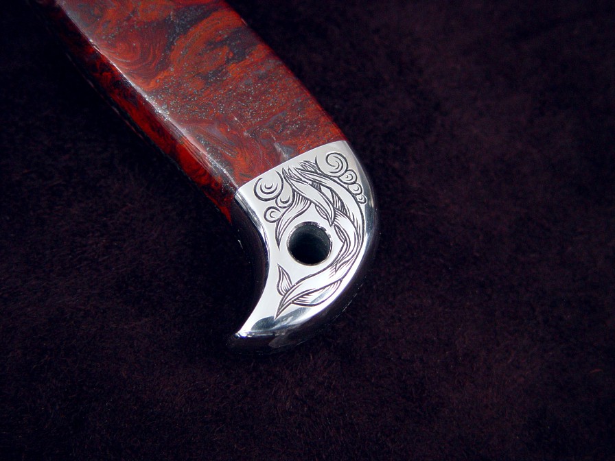 hand-engraved to match the blade. The polished bolsters bed a pair