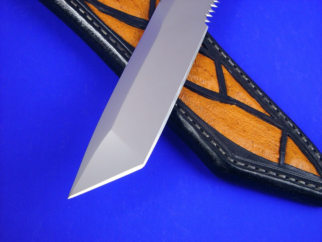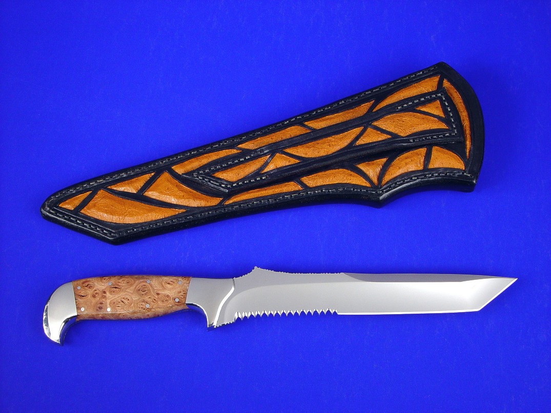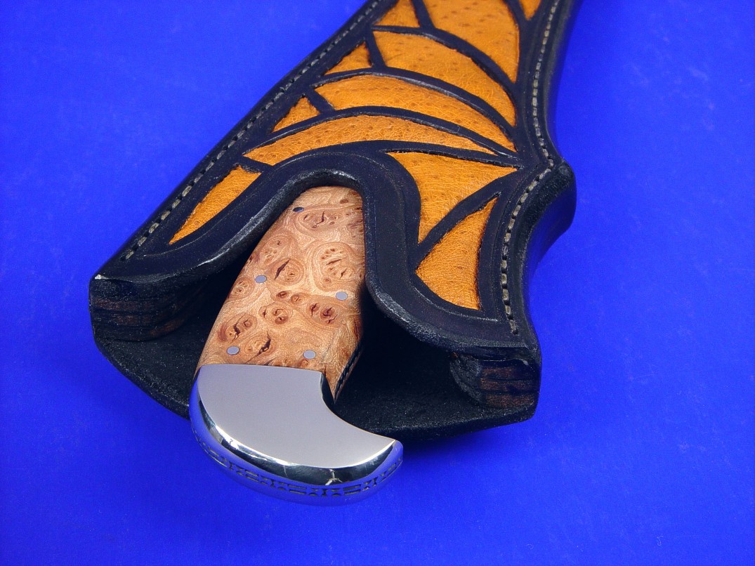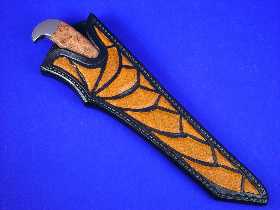 - Sheath: Emu Skin Inlaid in Hand-carved Leather