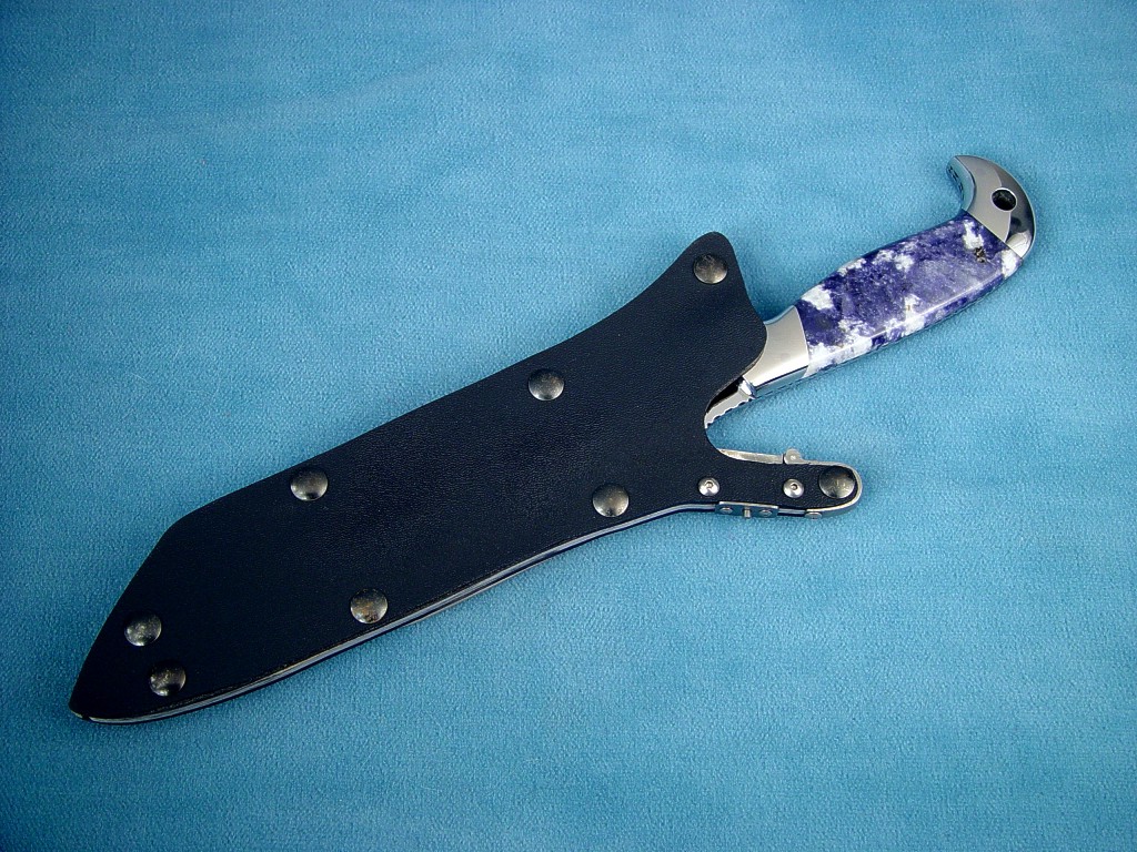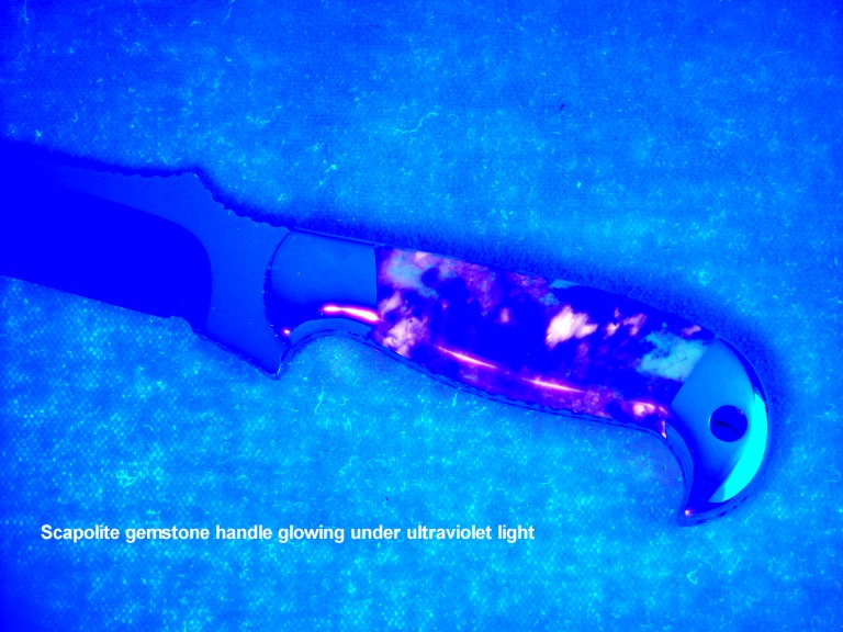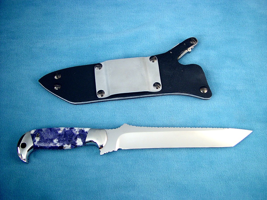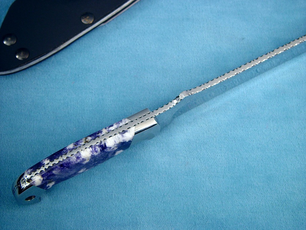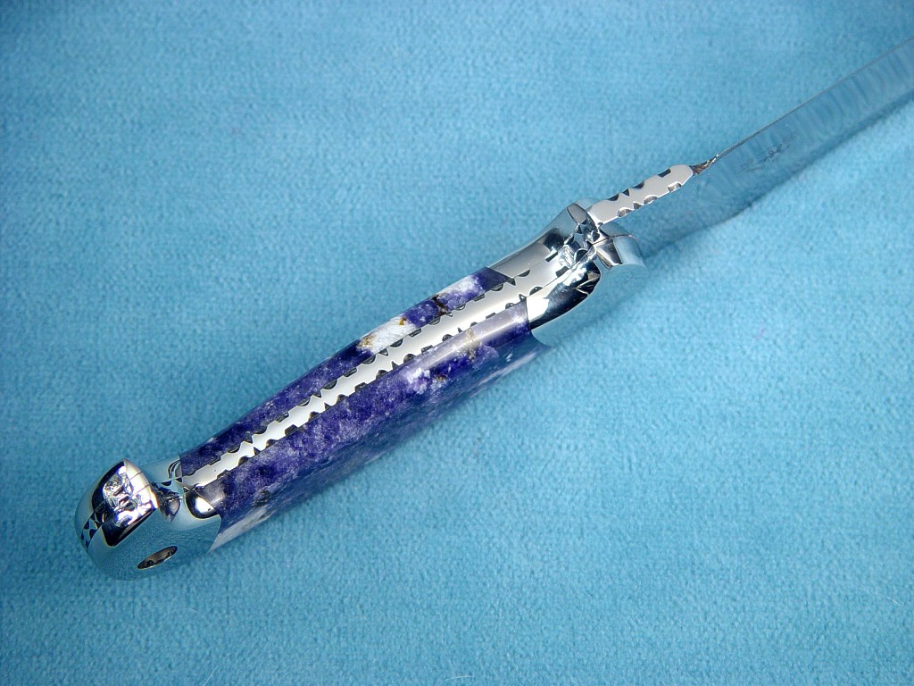 440C, the bolsters 304 stainless steel, and the handle is Scapolite in Sodalite gemstone.