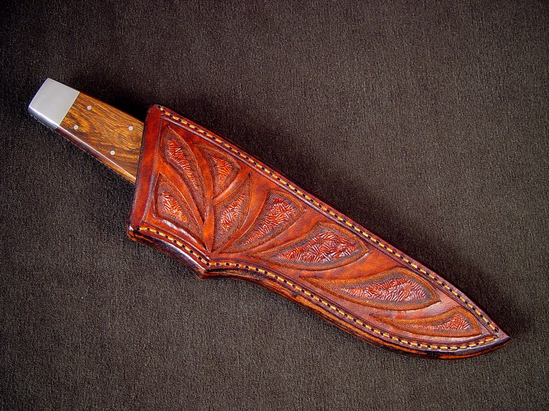 - Sheath: Hand-carved and tooled leather shoulder