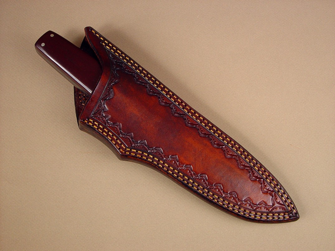 In the next photos, the knife is shown with the new leather sheath. I cleaned, sharpened, and waxed the blade, and that was all it needed! The leather sheath is simple and clean, in 9-10 oz. leather shoulder, died medium brown, border hand-stamped and hand-stitched with double rows of polyester sinew, lacquered and sealed.