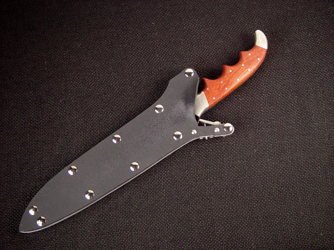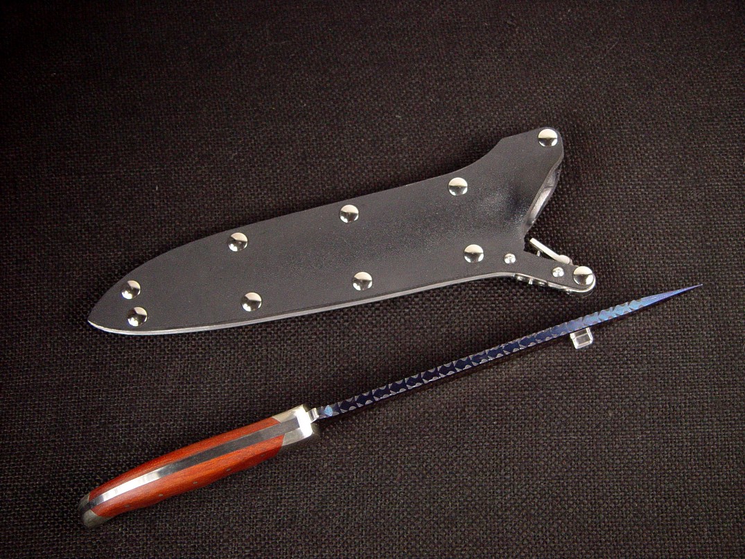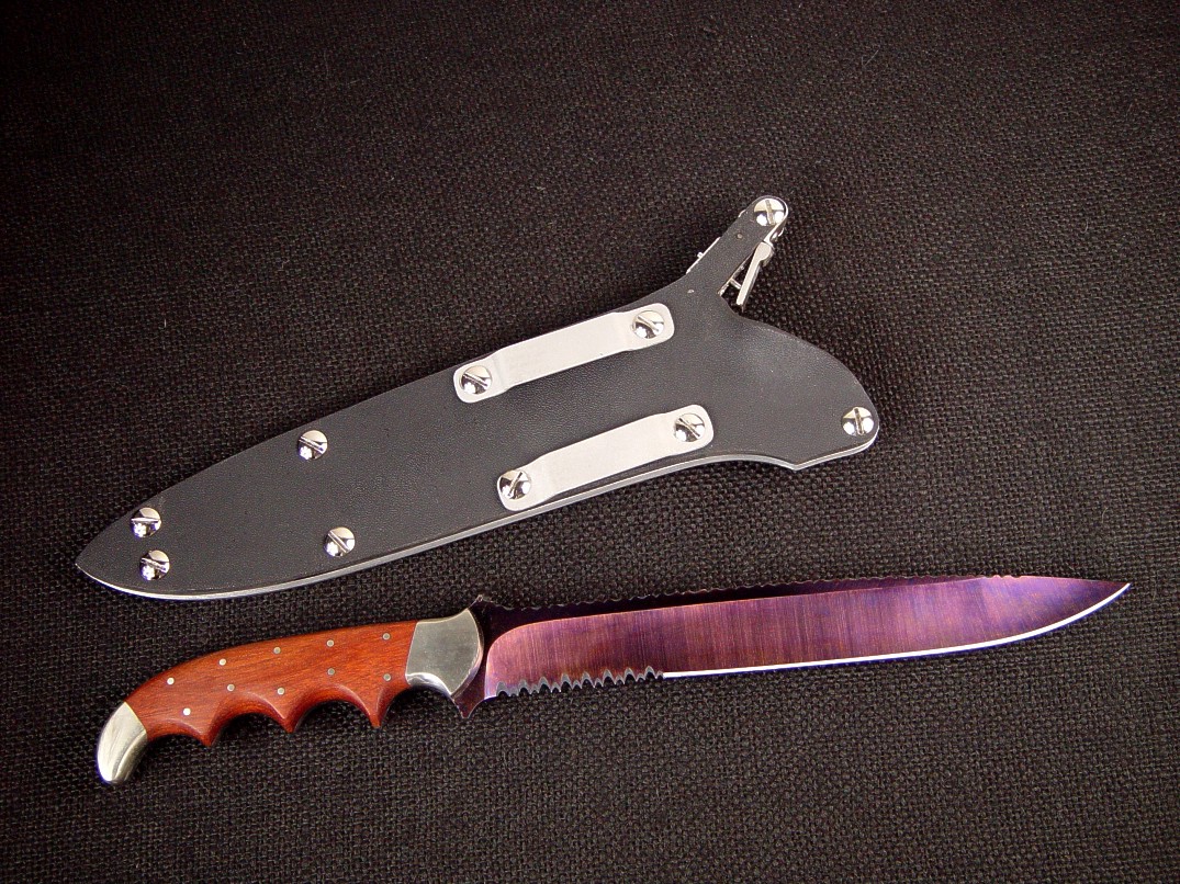 combat knife. The blade is vermillion-peacock blued O-1 high carbon