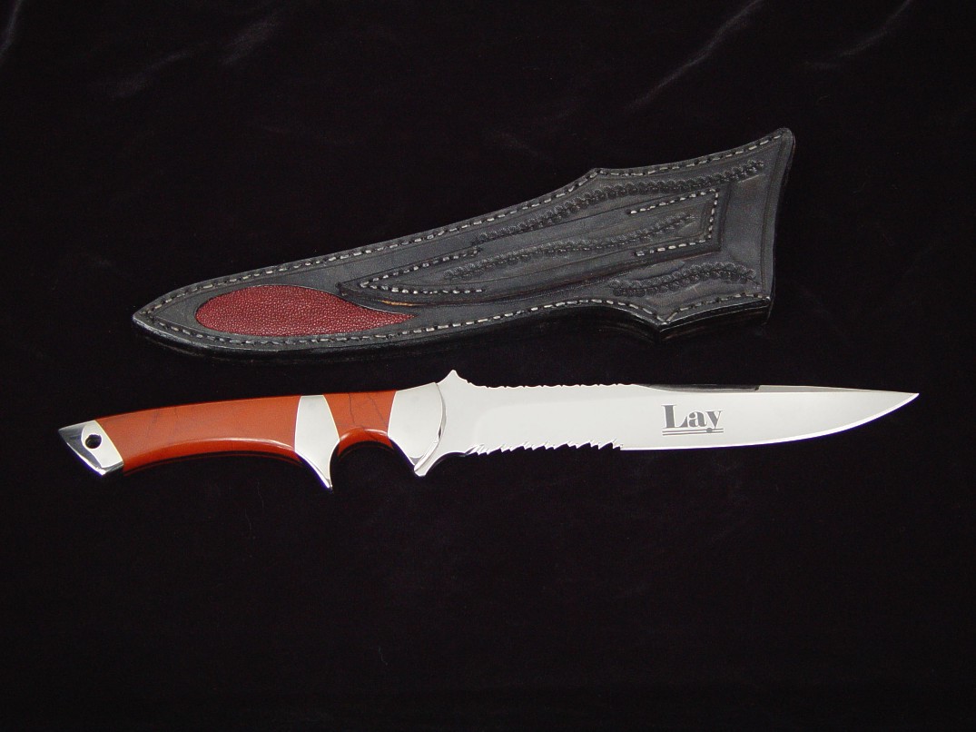 My Patriot design was originally created for a Special Forces combat grade weapon, and this particular model has an extended blade length. The blade has a full hollow grind, with a half- length top swage that adds an aggressive, profile-reducing geometry without sacrificing spine strength. The knife has spine filework in front of the thumb rise, and the tang is fully tapered for weight balance. The knife is bolstered with 304 austenitic high chromium, high nickel stainless steel, and the three bolster sets are dovetailed to bed two pairs of rich and bright Red River Jasper gemstone handle scales. This jasper is as red as red can be, and is very tough and durable, taking and holding a lusterous finish indefinitely. The rear bolster has a through-tang lanyard hole for extra security. The blade is also custom etched with the owner's name.