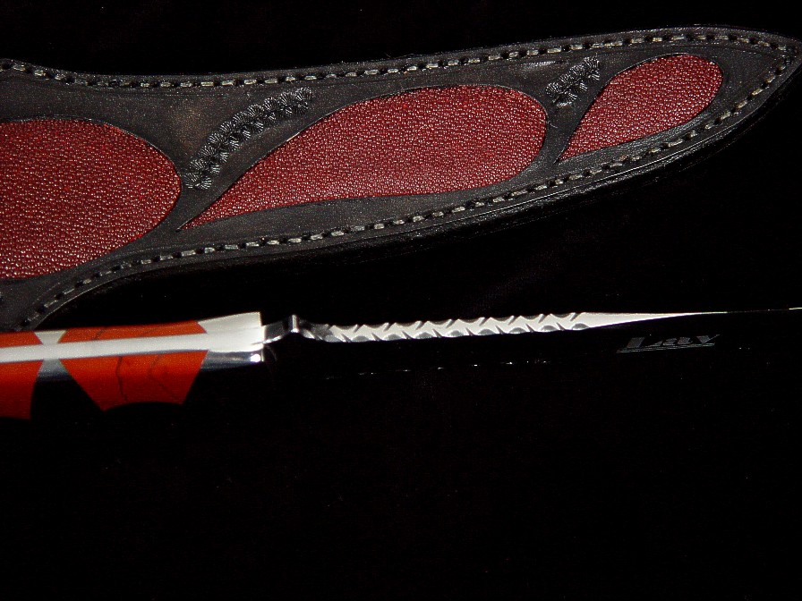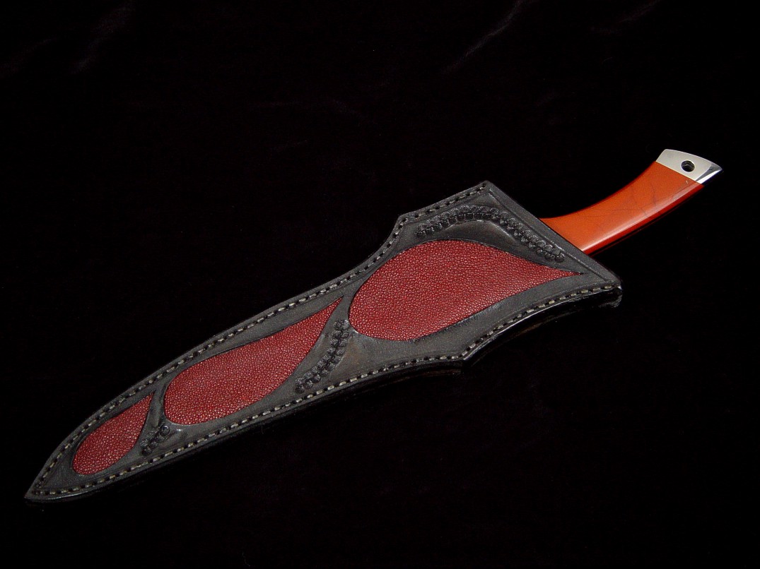 The sheath for this knife is hand-carved 9-10 oz. leather shoulder, dyed black, lacquered and sealed. It is hand-carved and has inlays of red Stingray skin and is hand-stitched with polyester sinew for longevity.