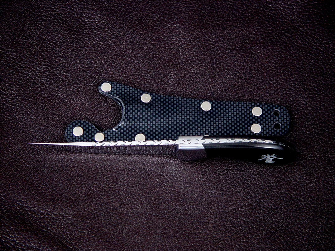 This Pecos II is a palm knife design, and this individual knife was custom ordered to be a neck knife, a knife worn on a breakaway chain or cord around the neck. The client liked the small design of the palm handle, just large enough to be held in the palm of the hand. This knife has a slightly upswept trailing point blade, a nice hollow grind, and is thin and sharp in mirror polished ATS-34 high molybdenum martensitic stainless steel for great toughness. The blade has full filework with a square punctuated pattern, and is bolstered by 304 austenitic stainless steel bolsters. The tang is tapered, and the bolsters are dovetailed and bed a pair of Black Jade gemstone handle scales. The jade is custom engraved deeply with the clients personal Kanji.