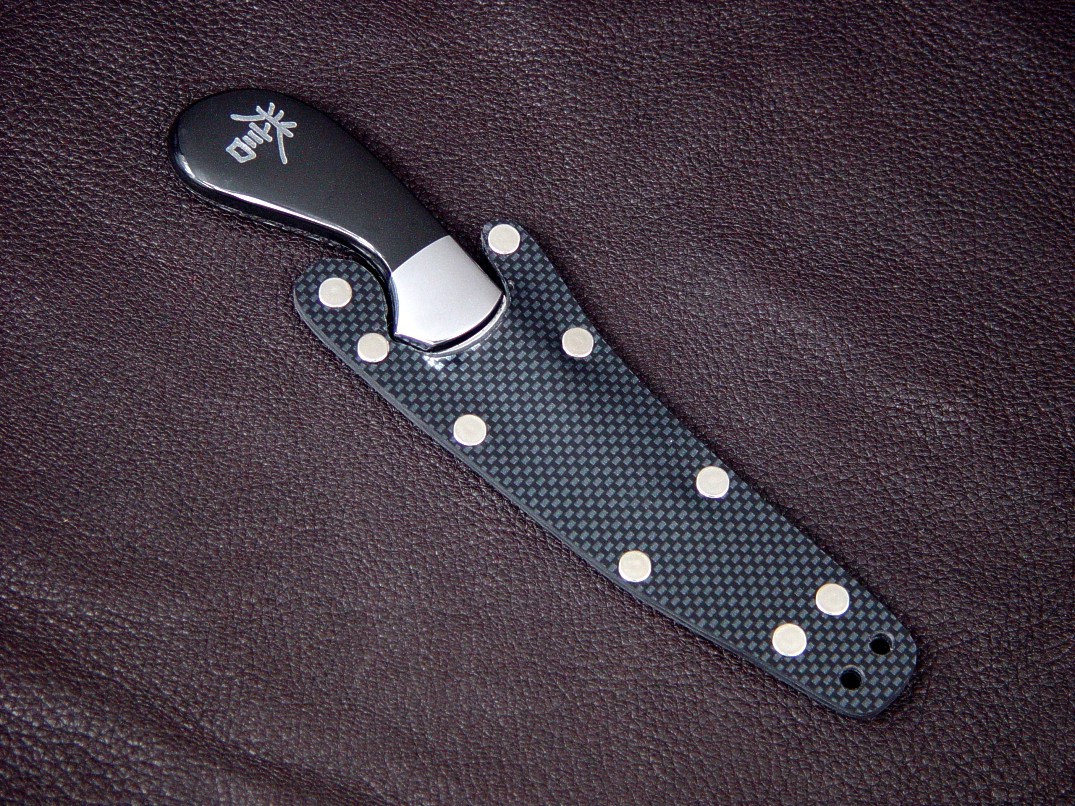 The sheath for this knife is an unusual one, designed to be worn around the neck, handle down. I made this one out of thin and light Concealex thermoforming acrylic/PVC and it is adhesively bonded and mechanically reinforced with steel rivets. Not my usual fare, the sheath is lightweight and secure, and the knife is locked in the sheath with a tab that is flexed sideways to allow the knife to be extracted.