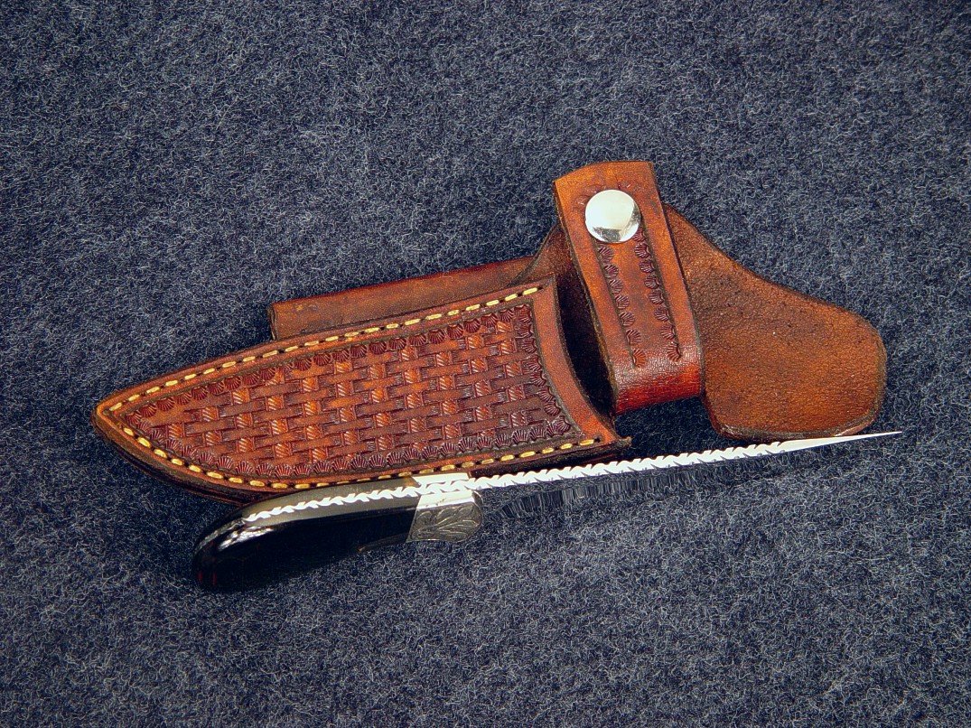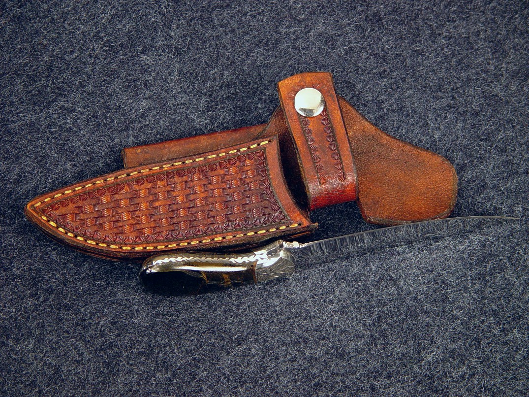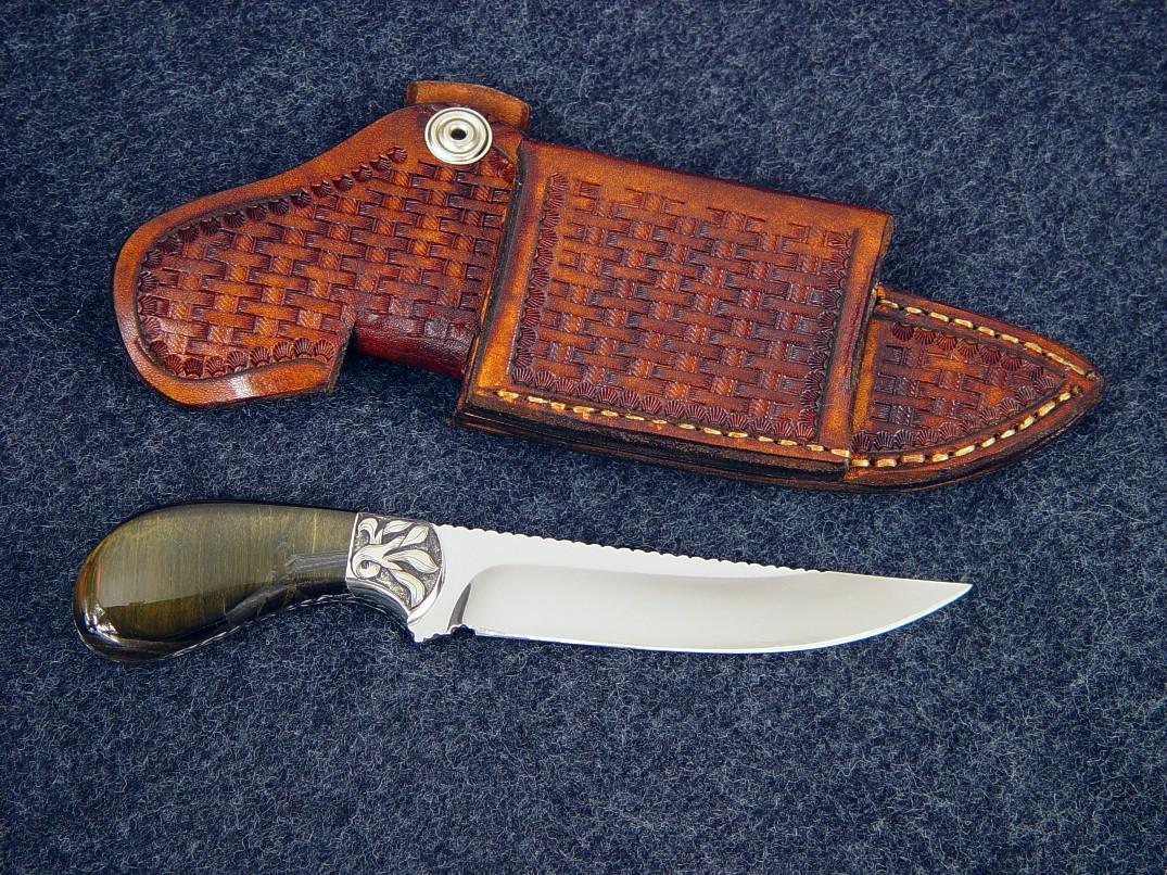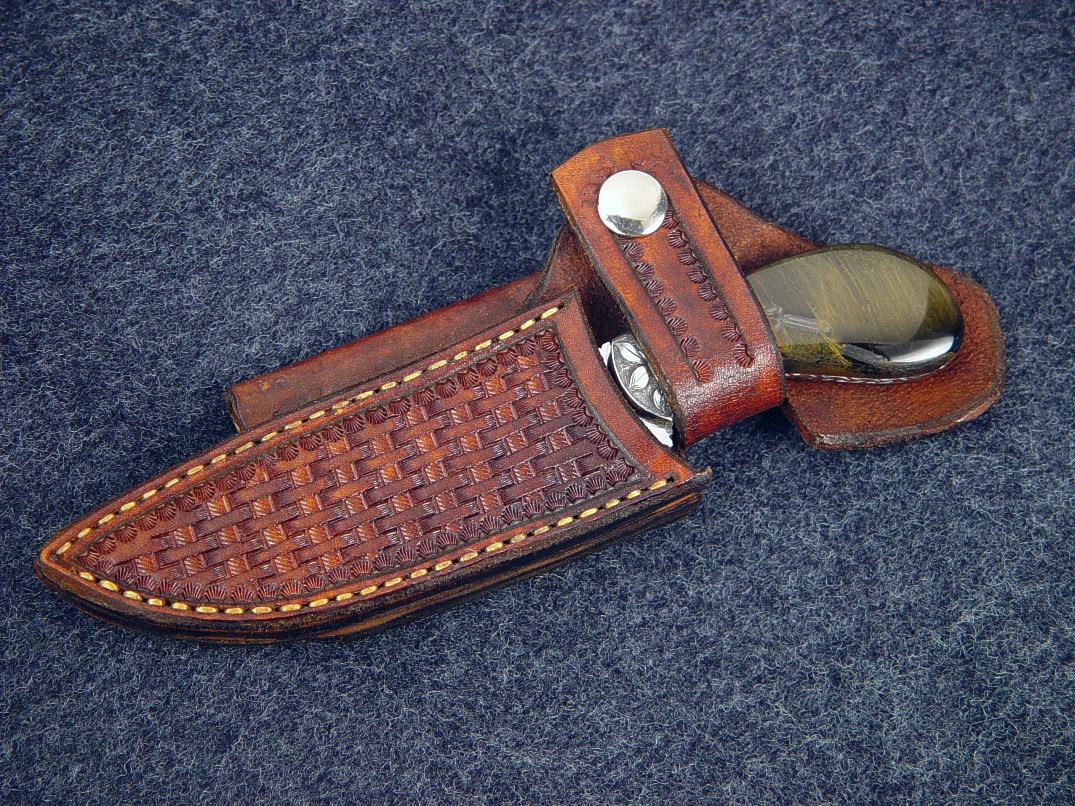 The Pecos design has several variations on my patterns page, and this one is named Pecos II. This is a palm handled knife, which means that the handle is just the right size to be nested in the palm of the hand, giving a comfortable, tight grip for this type of small knife. The blade has a slight trailing point for fine work and is made of hollow ground and mirror polished 440C high chromium stainless steel. The blade has a fully tapered tang with full filework, even in the small choil. The knife is bolstered with hand-engraved nickel silver bolsters that are dovetailed and bed a pair of glassy smooth and beautiful dark Blue Tiger Eye gemstone. This gem is called blue because of the dark color, and is Crocidolite and quartz, with striking chatoyancy (cat's eye) light play effects throughout. The knife has an unusual horizontal oriented sheath, which can be worn along the belt line, and the knife is secured with a tightly formed snap flap retention. The sheath is hand-stamped and tooled in basket weave pattern, dyed tan, hand-stitched, lacquered, and sealed.