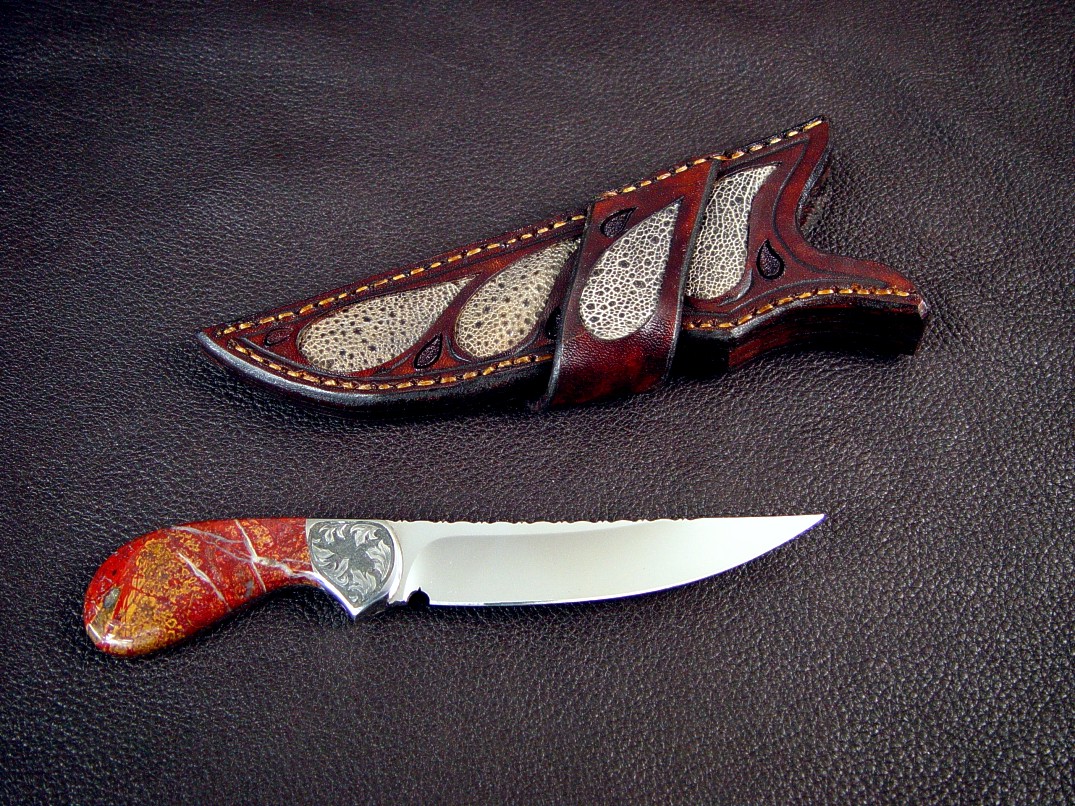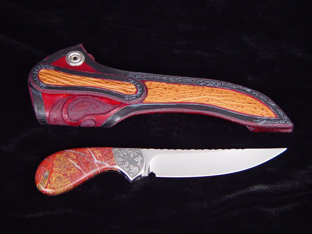background with inward swept leaves. The handle is an unusual hard jasper,
