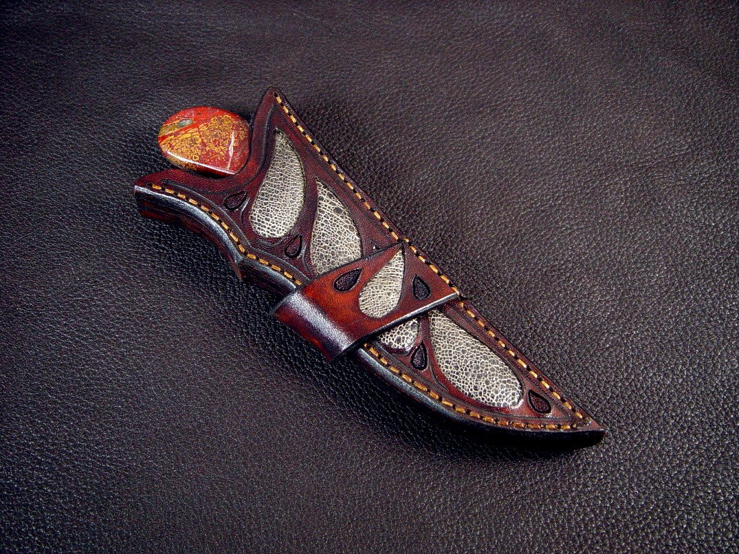- Sheath 1: Open/Display style, Sharkskin Inlaid in Hand-Tooled 9-10 oz. Leather Shoulder