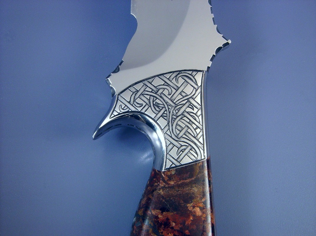 deeply carved quillons. The knife is bolstered with full, stout 304