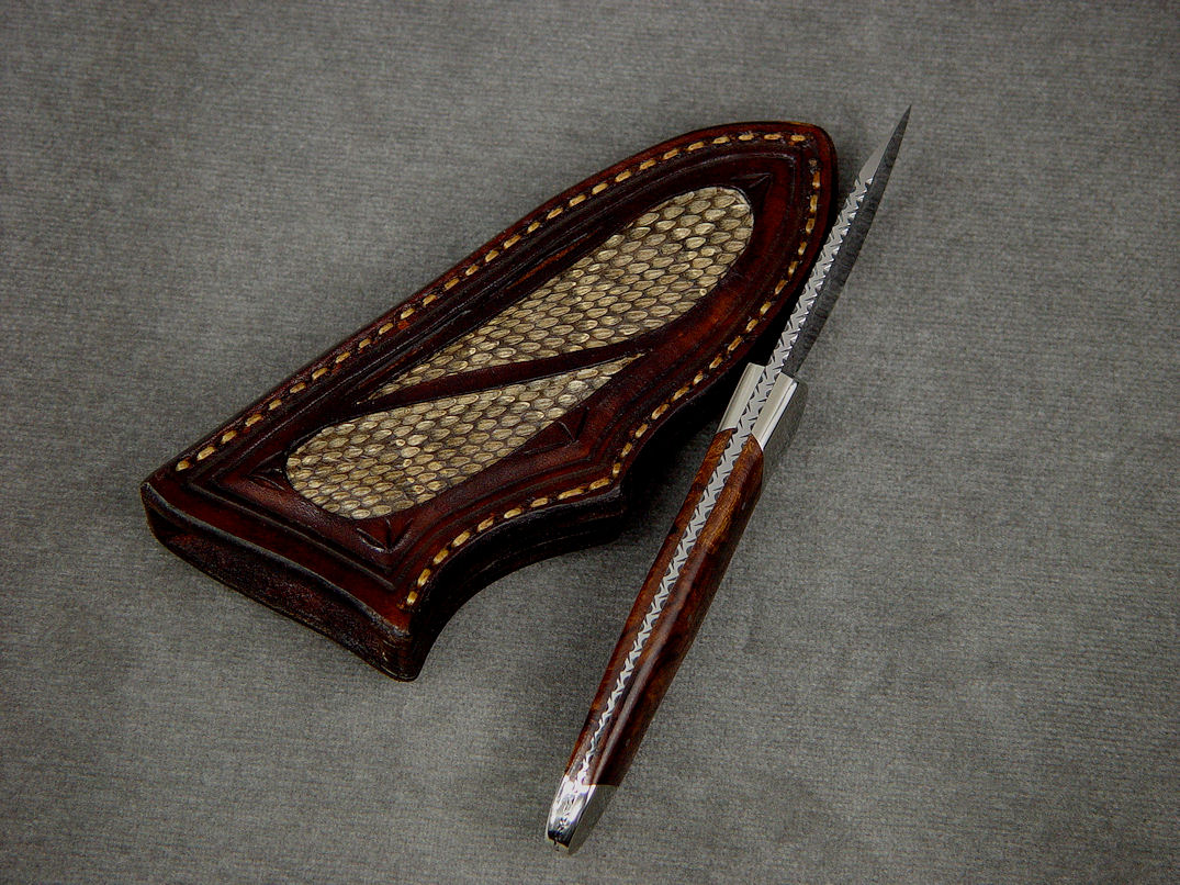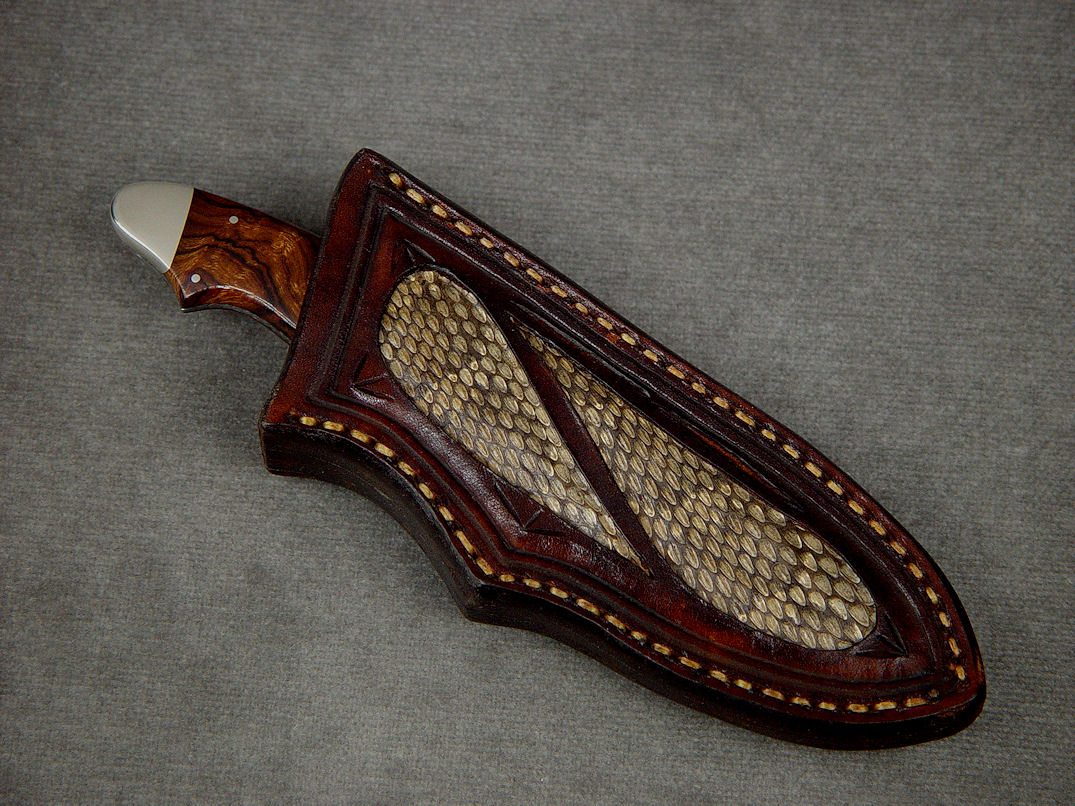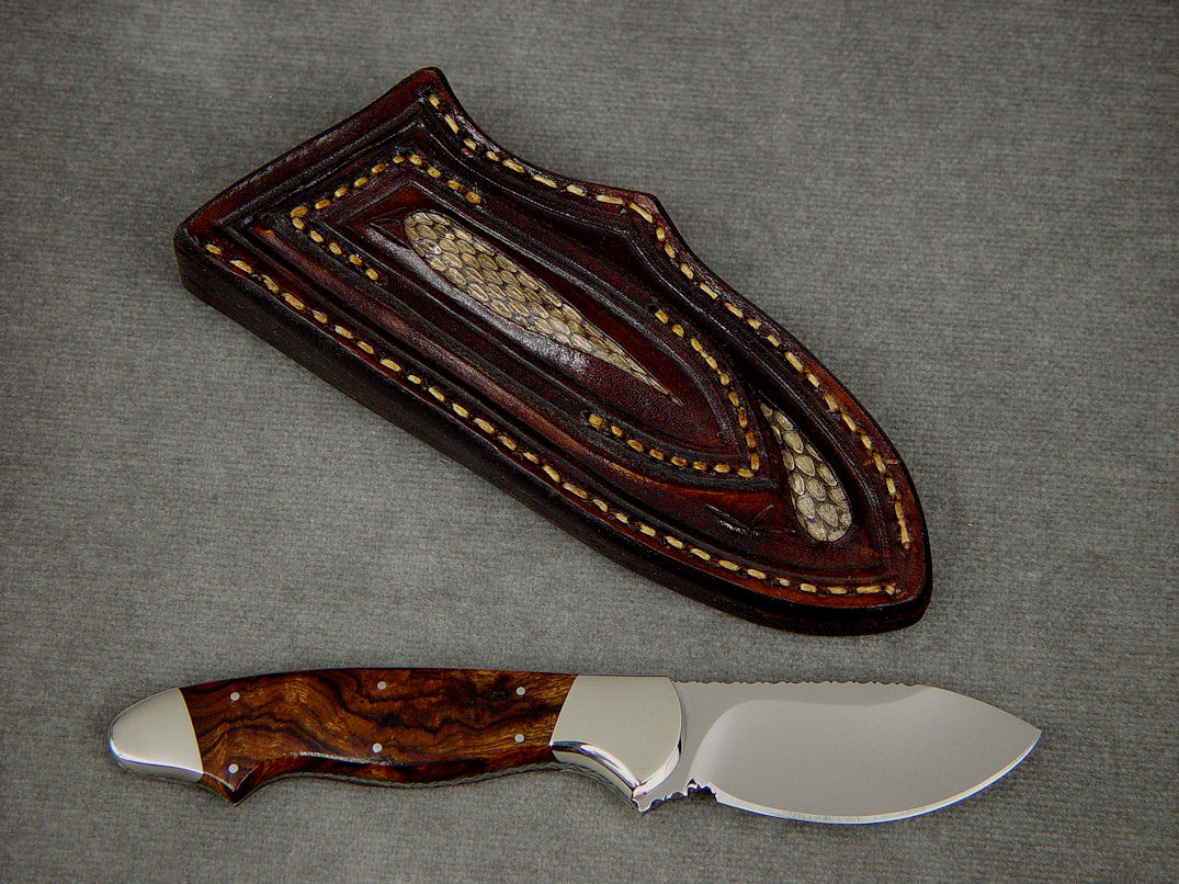 The Pluto is a great skinning and utility design, with plenty of belly and curve suitable for a variety of utility tasks as well. The deeply hollow ground blade is 440C high chromium martensitic stainless tool steel for high hardness, toughness, and corrosion resistance. This Pluto has a very meticulous and tight vine filework pattern completely around the spine and handle tang. With an overall length of about 6.75" and a cutting edge length of 2.5", the Pluto is comfortable in the hand with the three finger handle style that nestles in the palm. The knife is bolstered with nickel silver bolsters, dovetailed to bed a pair of Desert Ironwood hardwood handle scales. The knife is sheathed in a hand-carved sheath of leather shoulder, inlaid with panels of Prairie Rattlesnake skin, hand-stitched with polyester sinew, lacquered and sealed.