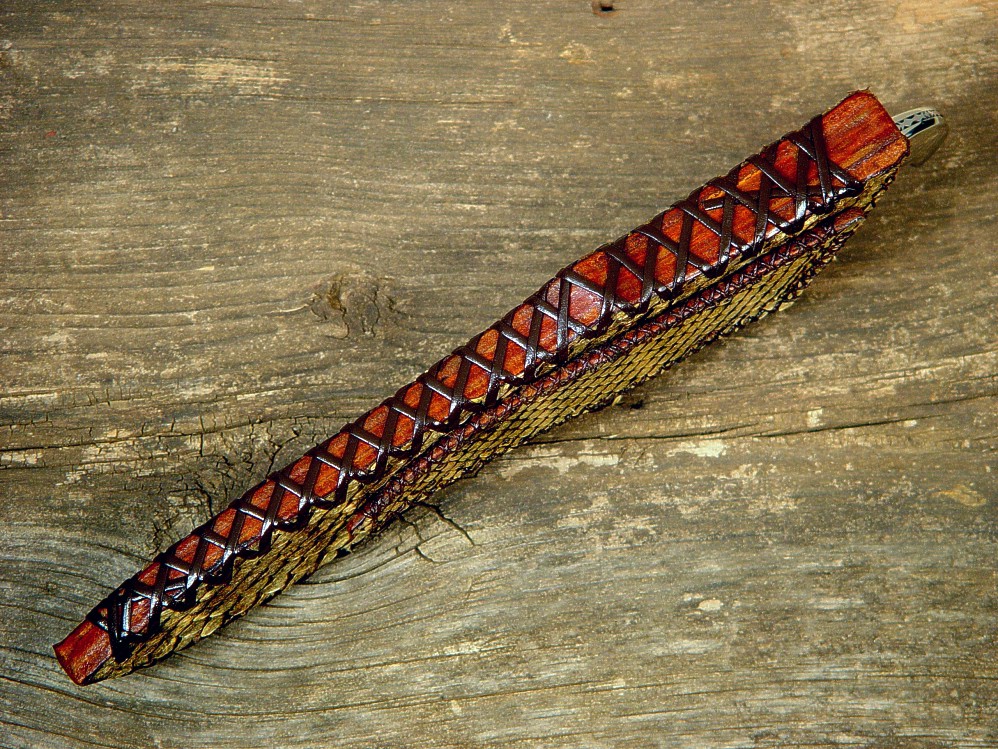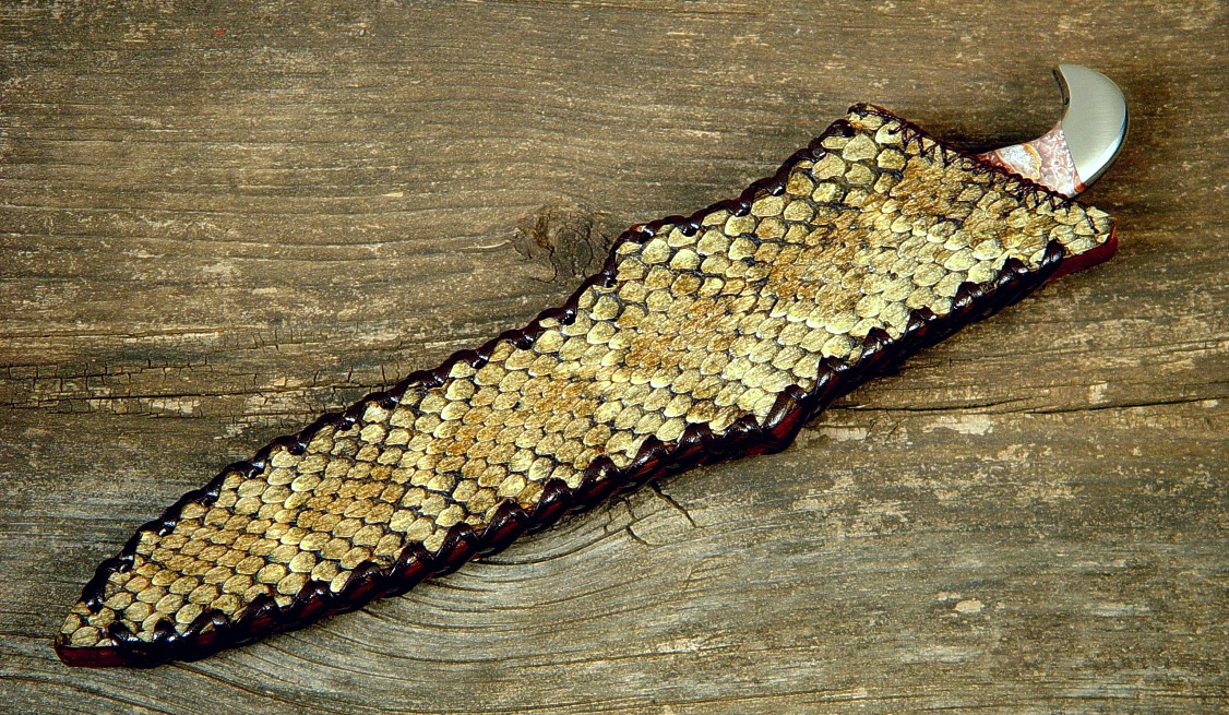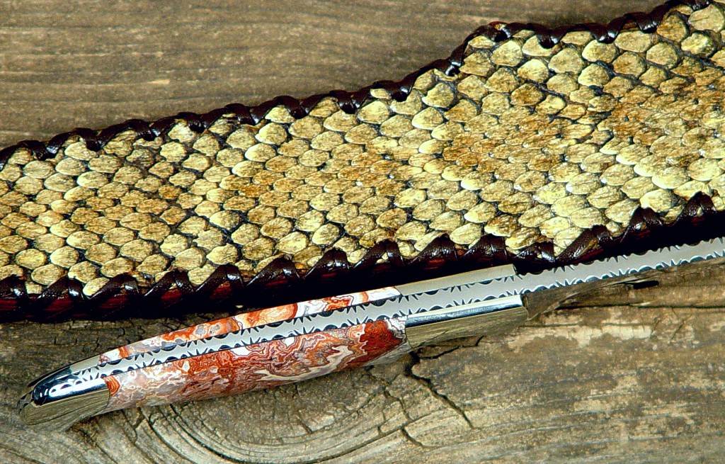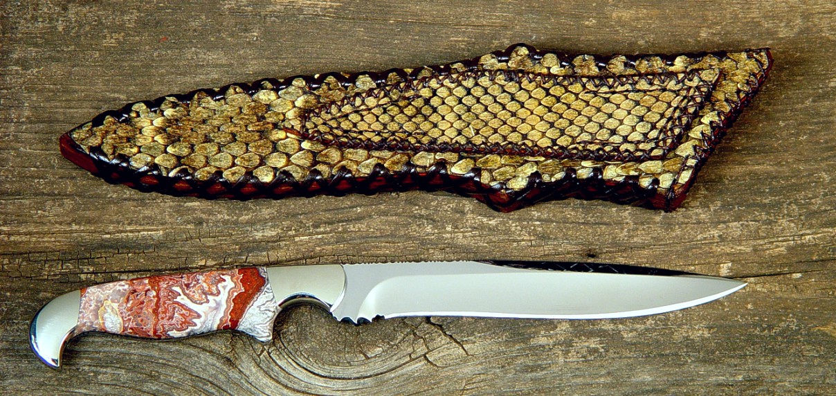 The Prairie Falcon is a common and beautiful Raptor here in the southwest, and this pattern of knife is a very early one of mine, named for the graceful and elegant creature. The blade design is narrow and feather-like, with a slight recurve and a nice top half-length swage. I made the blade of 440C high chromium martensitic stainless steel for great durability, high wear resistance, and low care in a mirror polish. This knife has full filework from swage to choil, and a fully tapered tang. The knife is bolstered with zero-care 304 high nickel, high chromium austenitic stainless steel bolsters, which are dovetailed to bed a pair of striking Crazy Lace Agate gemstone handle scales. This agate is very hard and tough, with fascinating areas of pattern and crystal throughout. The handle shape is very comfortable in the hand and the balance of the knife is excellent. The knife is sheathed in a 9-10 oz. leather shoulder sheath, hand-laced, with an overlay of Western Diamondback Rattlesnake skin.