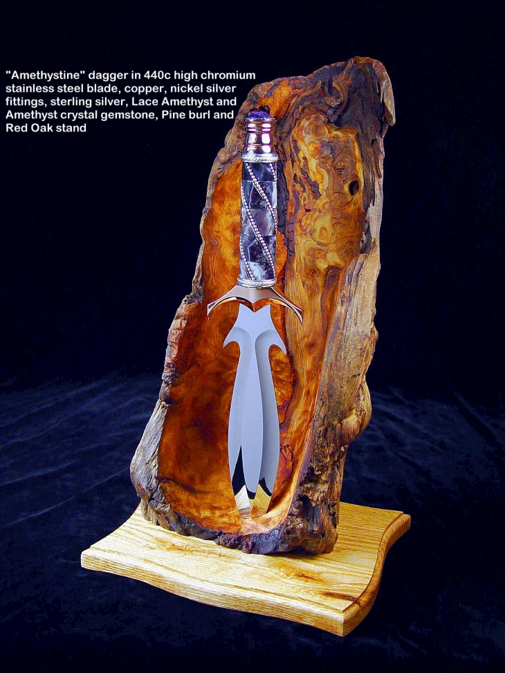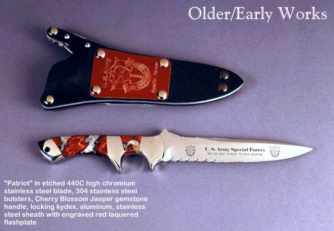 Bud Lang, the editor of Knives Illustrated magazine, approached me at a knife show and asked about my gemstone handled knives. He requested information about stone handled knives, and I gave him a good deal of info. He used the info in the article, detailing my use of gemstone in knife handles, and calling me one of the most prolific makers of gemstone handled knives. He quoted me quite a bit, and included works by some of my contemporaries at the time, friends like Norm Levine.
