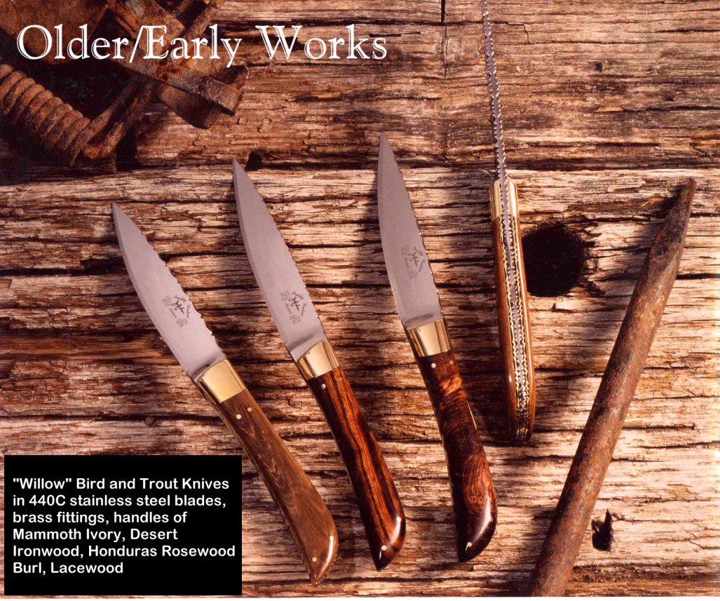 One of the earliest featured articles of my work was done by Roger Combs back in 1992. He did a two page article on me titled "Jay Fisher Knives - Built To Last." This was written when I lived in Farmington, New Mexico, along with several other well-known makers of the time. Roger had interviewed me at the California Knife Collector's Club show in Pasadena, one of the best annual shows I ever attended. He used much information from my brochure of the time, and inserted four photos of my knives: Willow Bird and Trout knives, a Desert Storm Commemorative, a New Orleans dagger, and a Bowie. It's interesting to note that I had been making knives for over ten years before anyone noticed... this is why one old maker told me that I'd have to be making a decade before anyone took me seriously! Below are three of the four photos that were in the article.