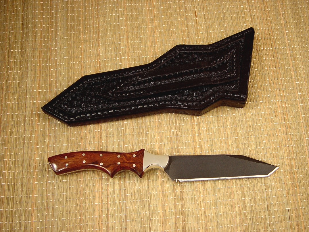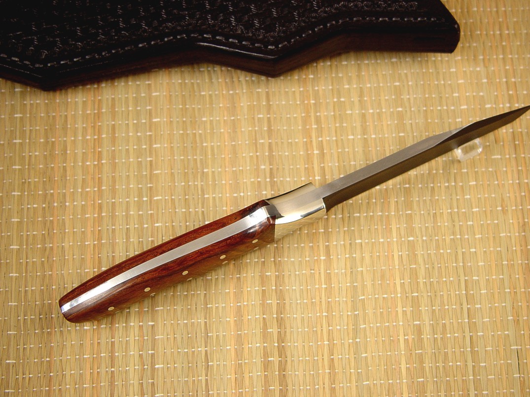 Named for a fundamental base particle in the realm of physics, the Quark is a great small utility knife, with a very sturdy blade and point. I made this one in bead blasted and hot blued O1 high carbon tungsten-vanadium tool steel blade, a knife steel that is tough, wear resistant, durable, and easy to sharpen. O1 can quickly achieve a formidable razor keen edge with just a few strokes on a sharpening stone. The blade design has a steep swage at the point to create a very tough tanto point and the straight edges are simple and useful. The knife is bolstered with nickel silver bolsters and the handle is Honduras Rosewood bedded and pinned with ten nickel silver pins for trustworthy mounting. Honduras Rosewood is a zero care hardwood, keeping its appearance for many years. The handle has a great and comfortable shape, and locks well in the first two fingers.