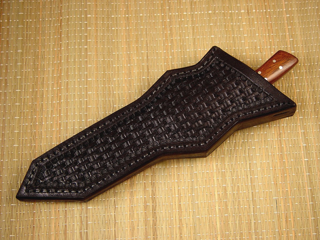 The deep and dependable sheath for the Quark is made in black dyed 9 - 10 oz. leather shoulder, hand-tooled in black basket weave pattern, hand-stitched with polyester sinew, lacquered and sealed.