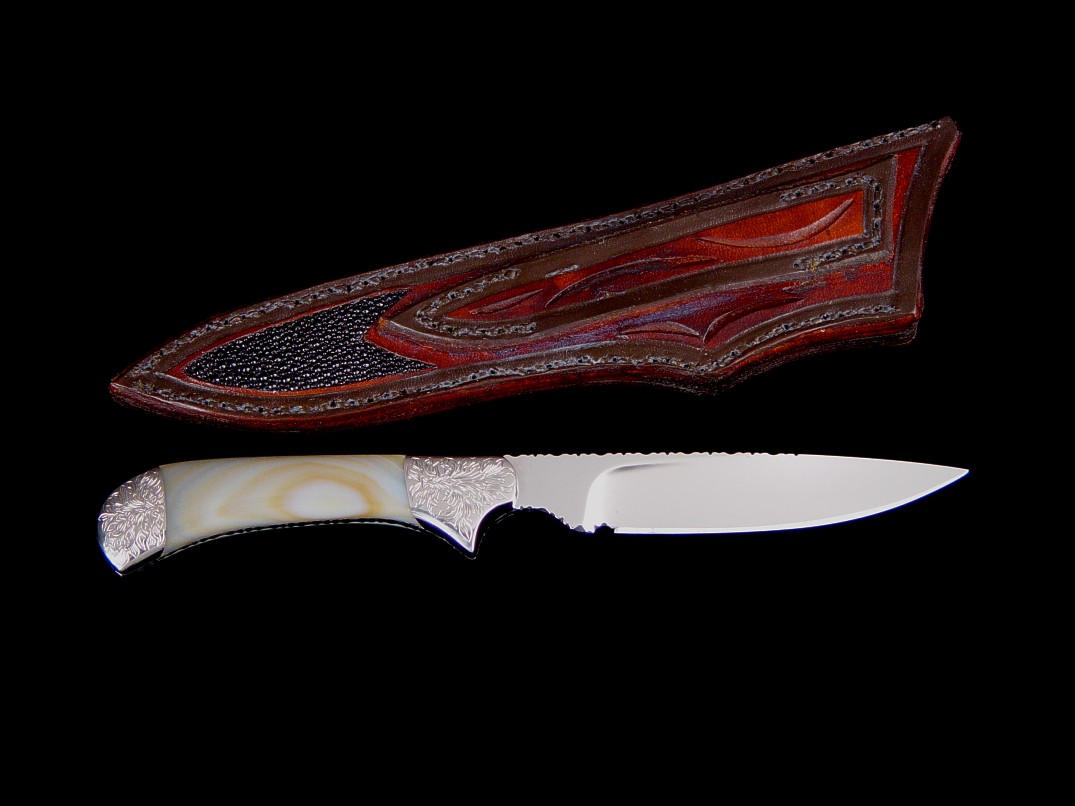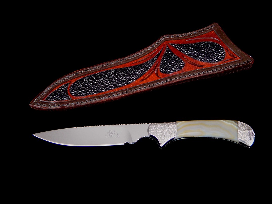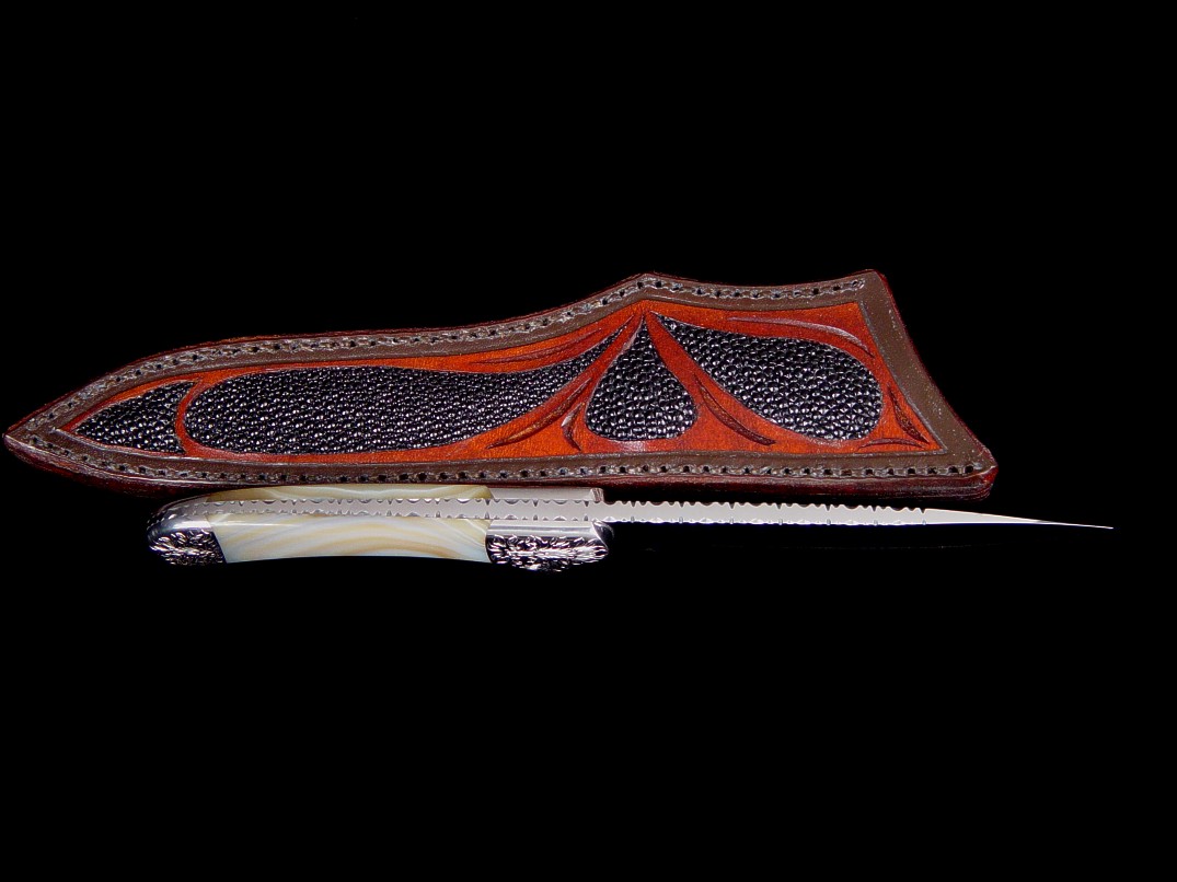 Sheath: Black Stingray Skin Inlaid in Hand-Tooled 9-10 oz. Leather Shoulder