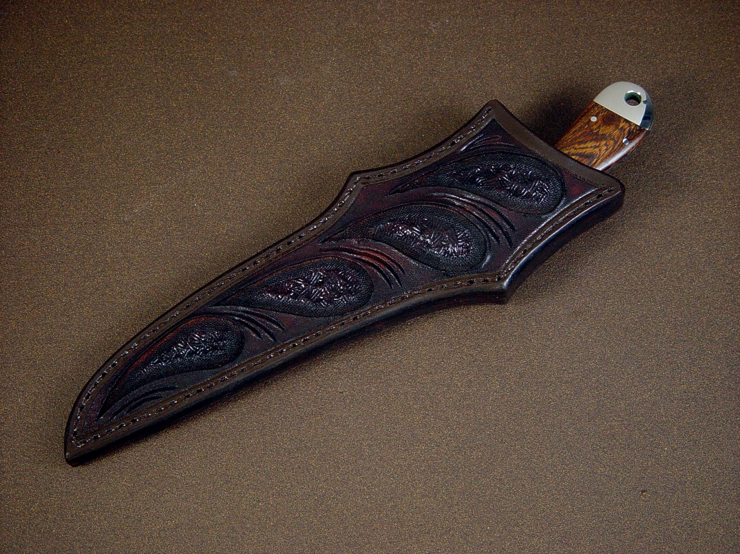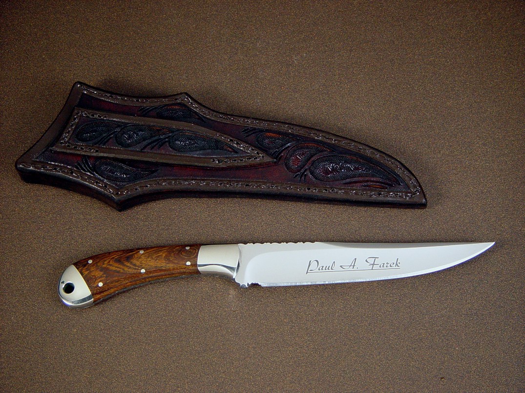 A great knife with clean lines, this Sanchez was custom made as a boning and utility knife for hunting and multiple chores. The long, slender blade is useful and keen, and this one is hollow ground and mirror finished ATS-34 high molybdenum martensitic stainless steel for great toughness and high wear resistance. The personalized and etched blade has a fully tapered tang, with full and dramatic filework, and is bolstered with high nickel, high chromium 304 austenitic stainless steel for zero care. The dovetailed bolsters bed a pair of book-matched Desert Ironwood hardwood handle scales, smoothly polished. The sheath is hand-carved and tooled 9 - 10 oz. leather shoulder, dyed black and brown, hand-stitched, lacquered, and sealed.