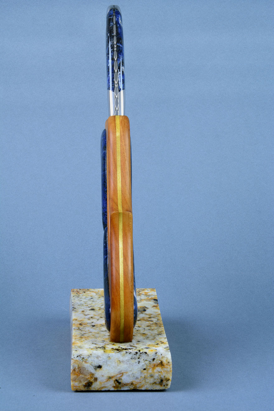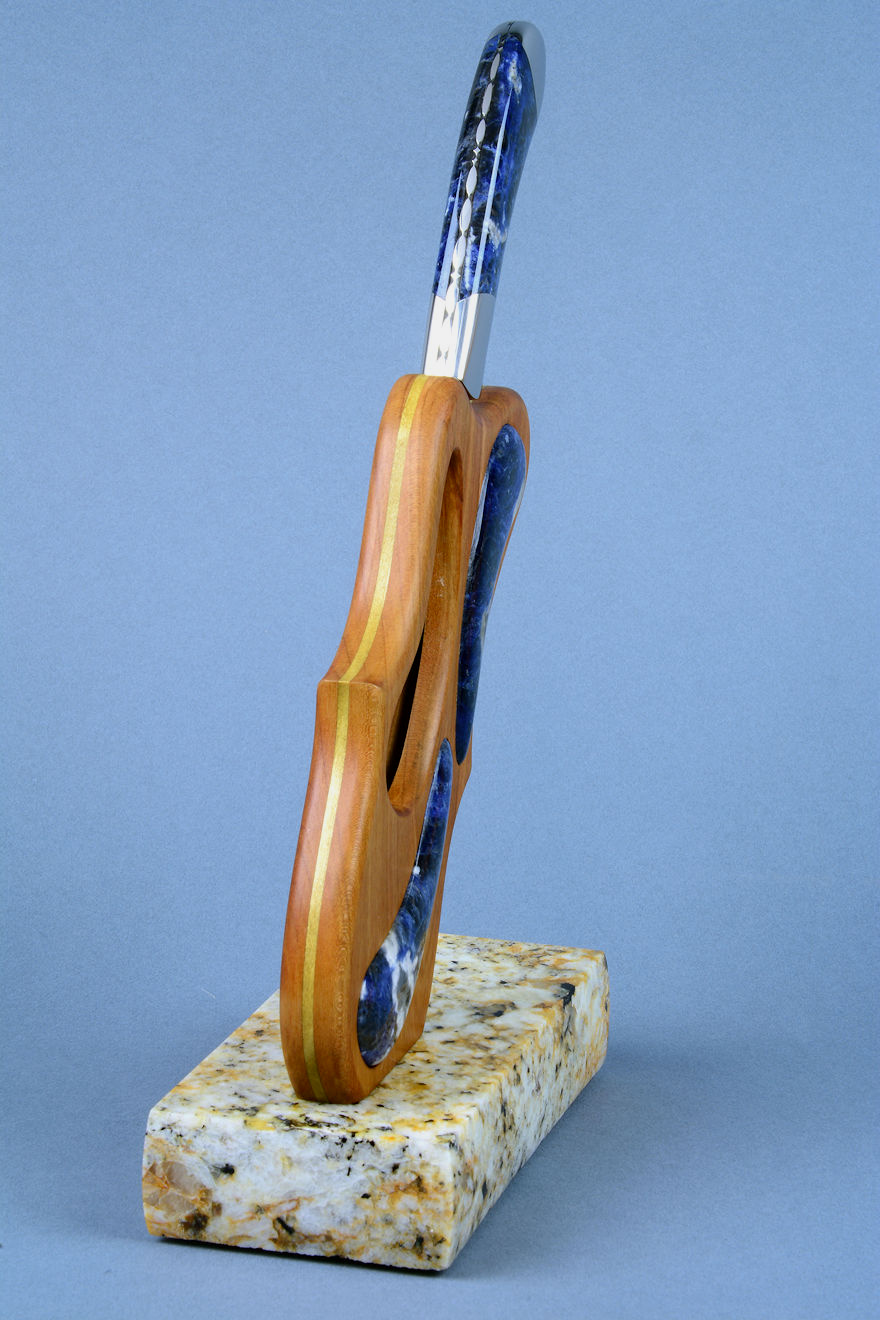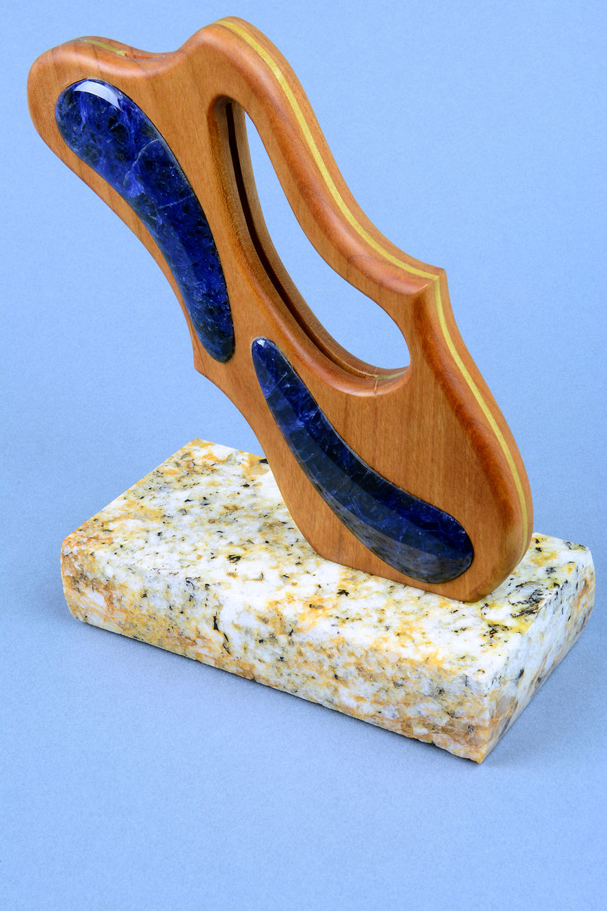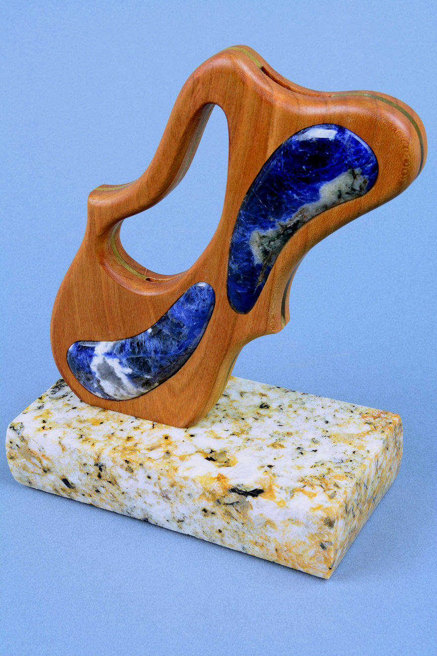 shapes of the sculpted stand, cutouts, and inlays. The sodalite is