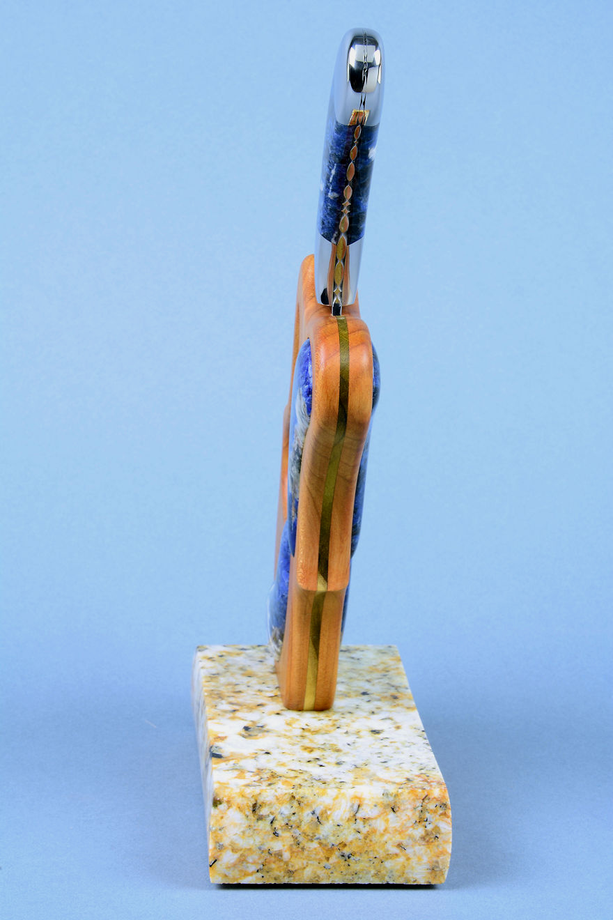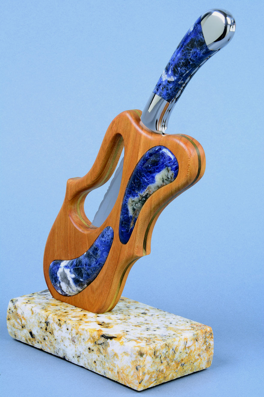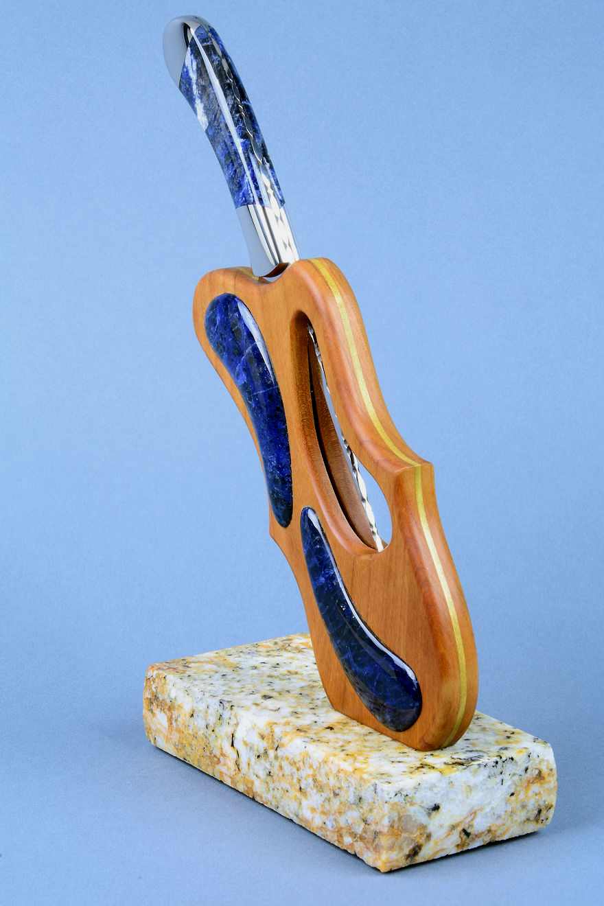 shapes of the sculpted stand, cutouts, and inlays. The sodalite is