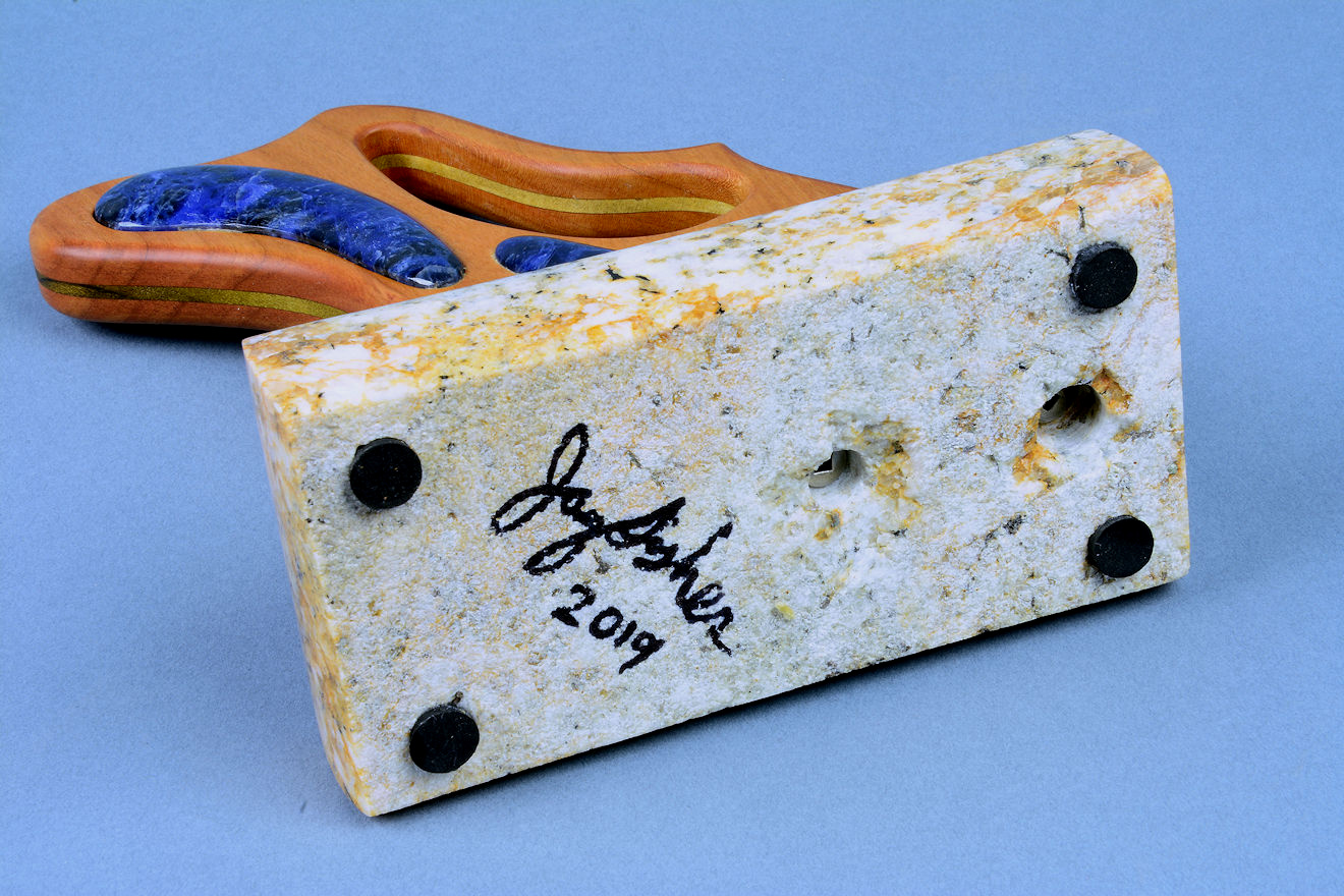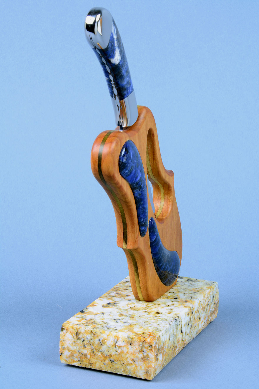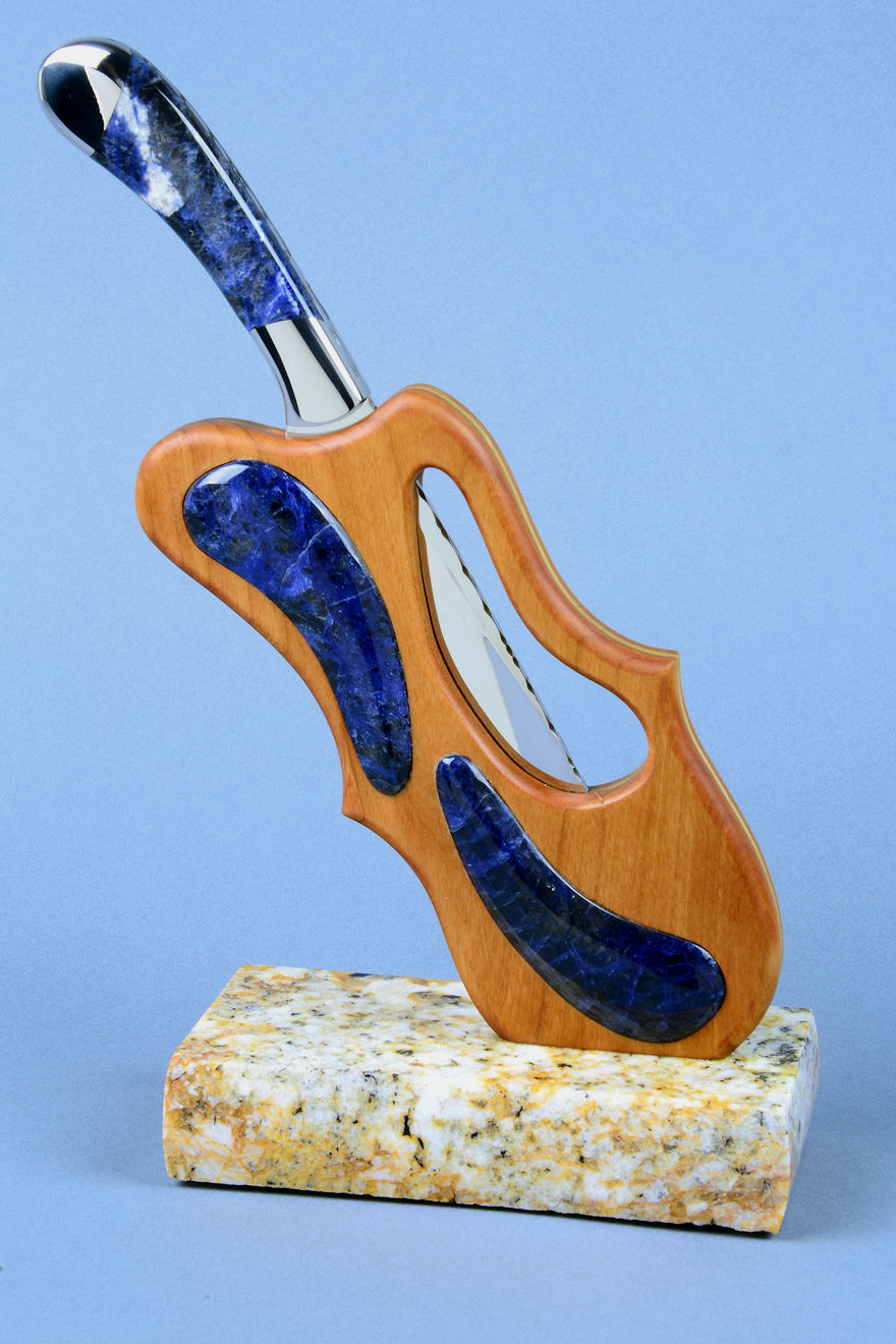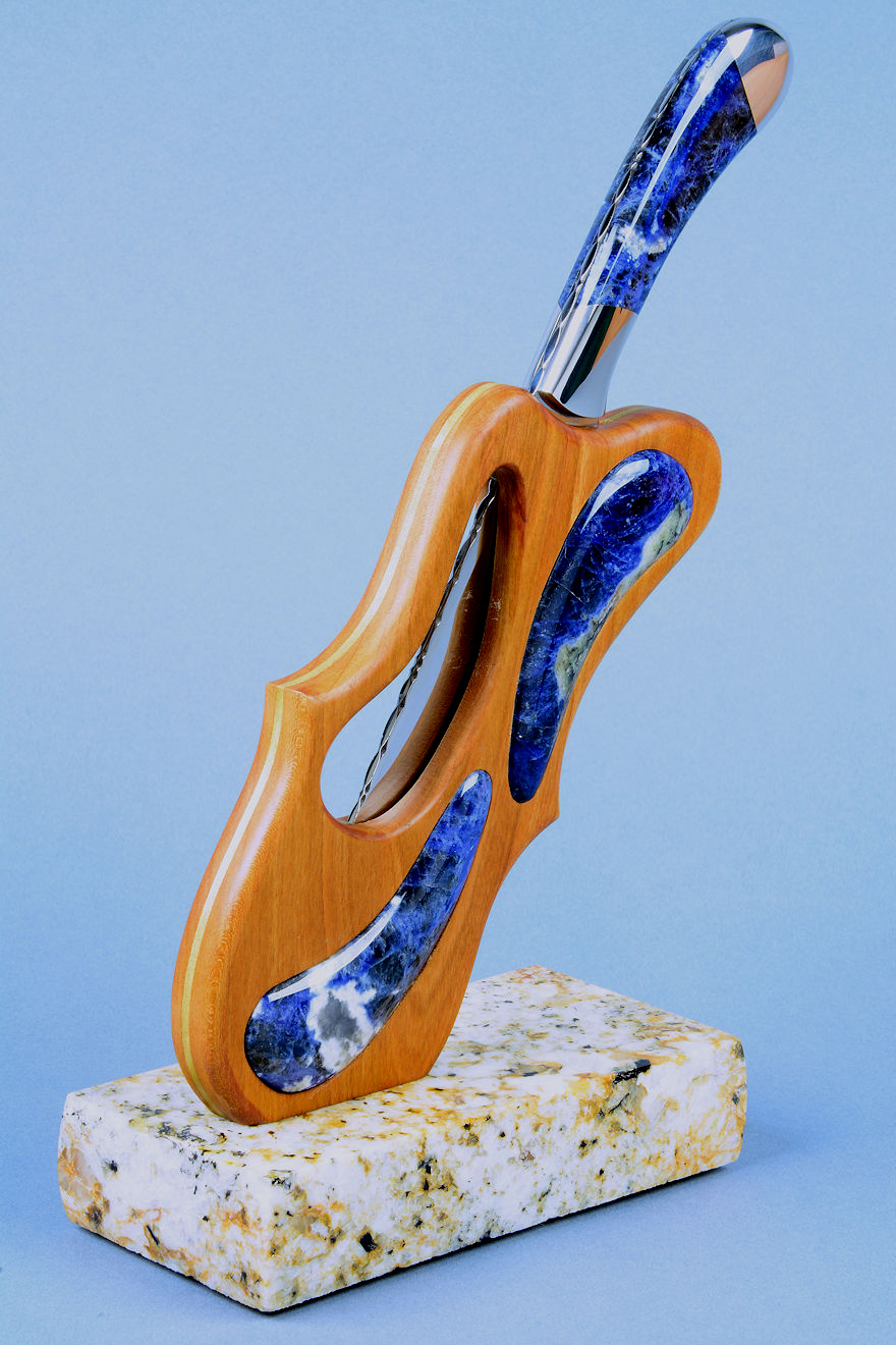 shapes of the sculpted stand, cutouts, and inlays. The sodalite is