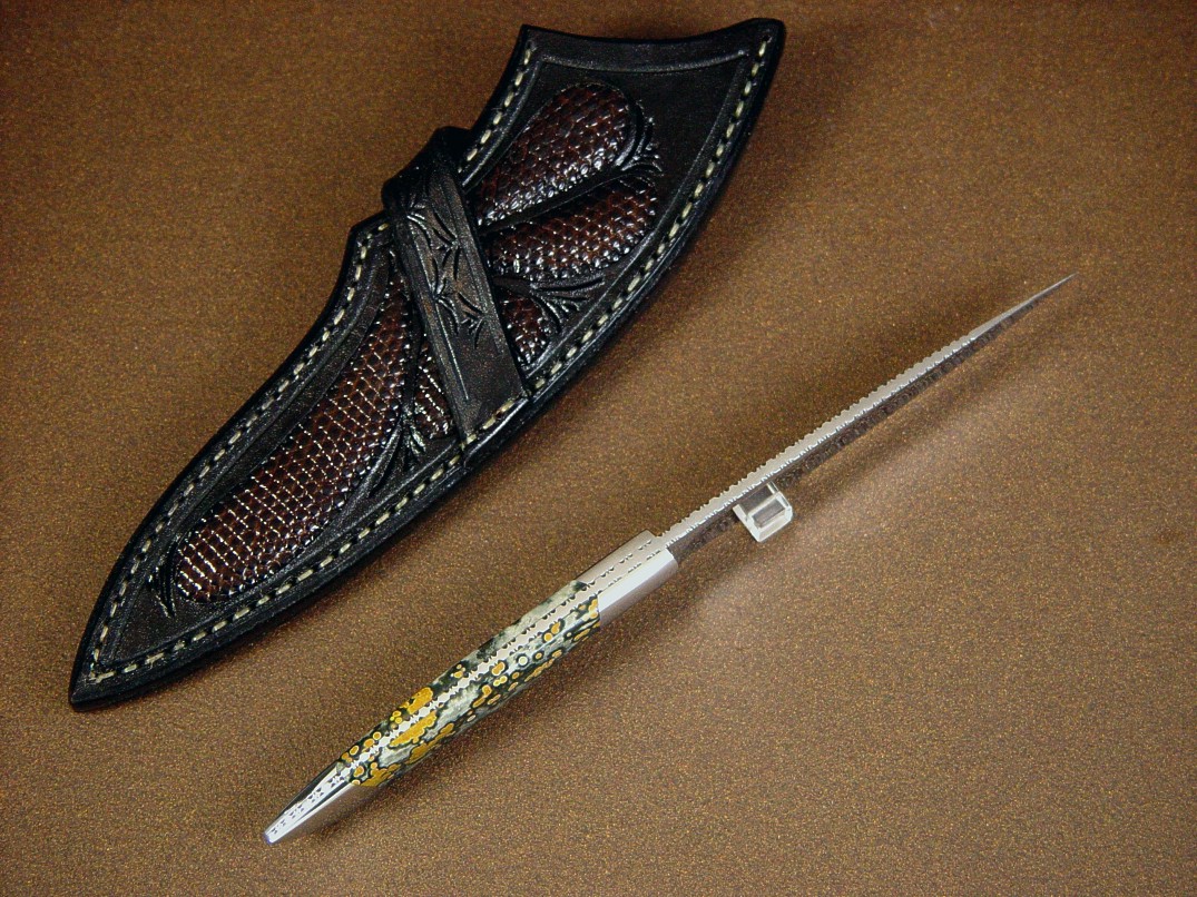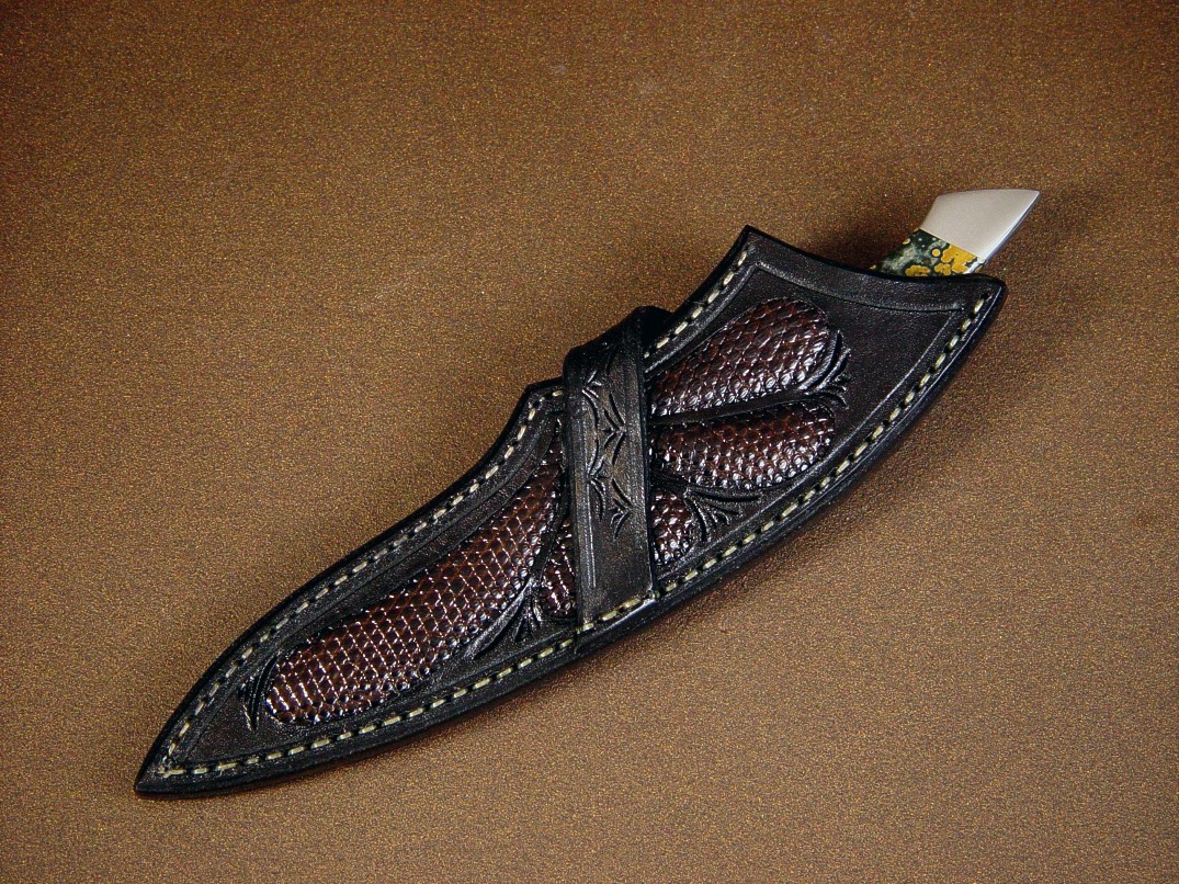 The Santa Fe design is a very old style and pattern of mine, originally based in what we called a boot knife in the early 1980s. The description is of a knife that is slender enough to wear inside a western boot, and the name for any small to medium sized knife with a slender blade and profile seems to carry on. The knife is not necessarily a defensive weapon, and this medium sized blade is elegant and useful for many cutting chores. This knife has a 440C high chromium martensitic stainless steel blade, hollow ground and mirror polished, with full and intricate filework and a tapered full tang handle. The knife is bolstered with high nickel, high chromium 304 austenitic stainless steel for absolute corrosion resistance and handled with rare yellow and green Orbicular Jasper (Ocean Jasper) gemstone. This stone has beautiful pattern and is very hard and takes and keeps a very high lustrous polish. The knife has a commensurate sheath with Teju (Tegu) Lizard skin inlays in hand-carved leather shoulder, and is designed for a left side wear, cross draw position. A beautiful ensemble.