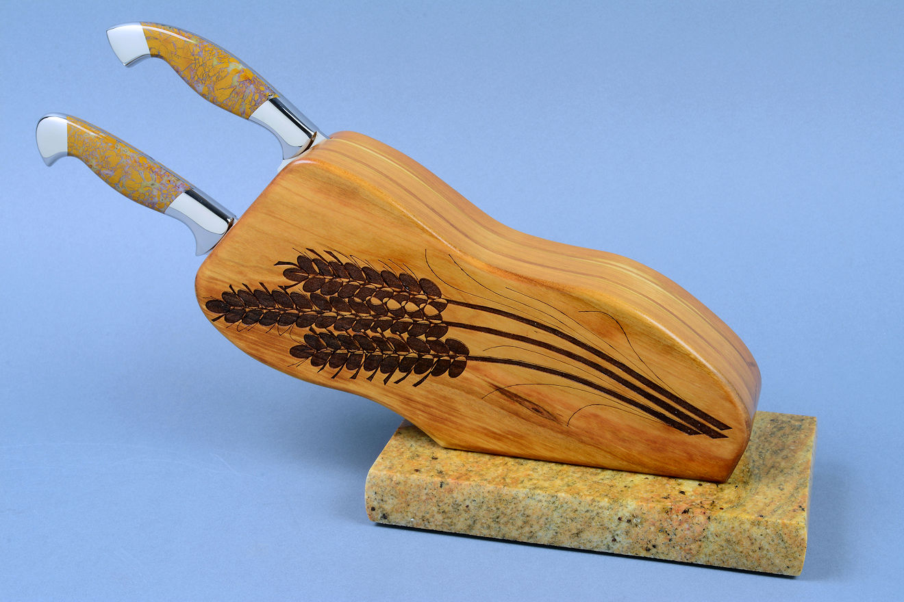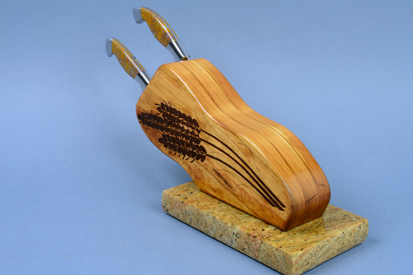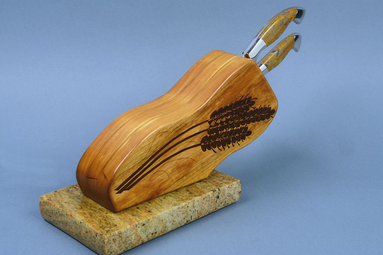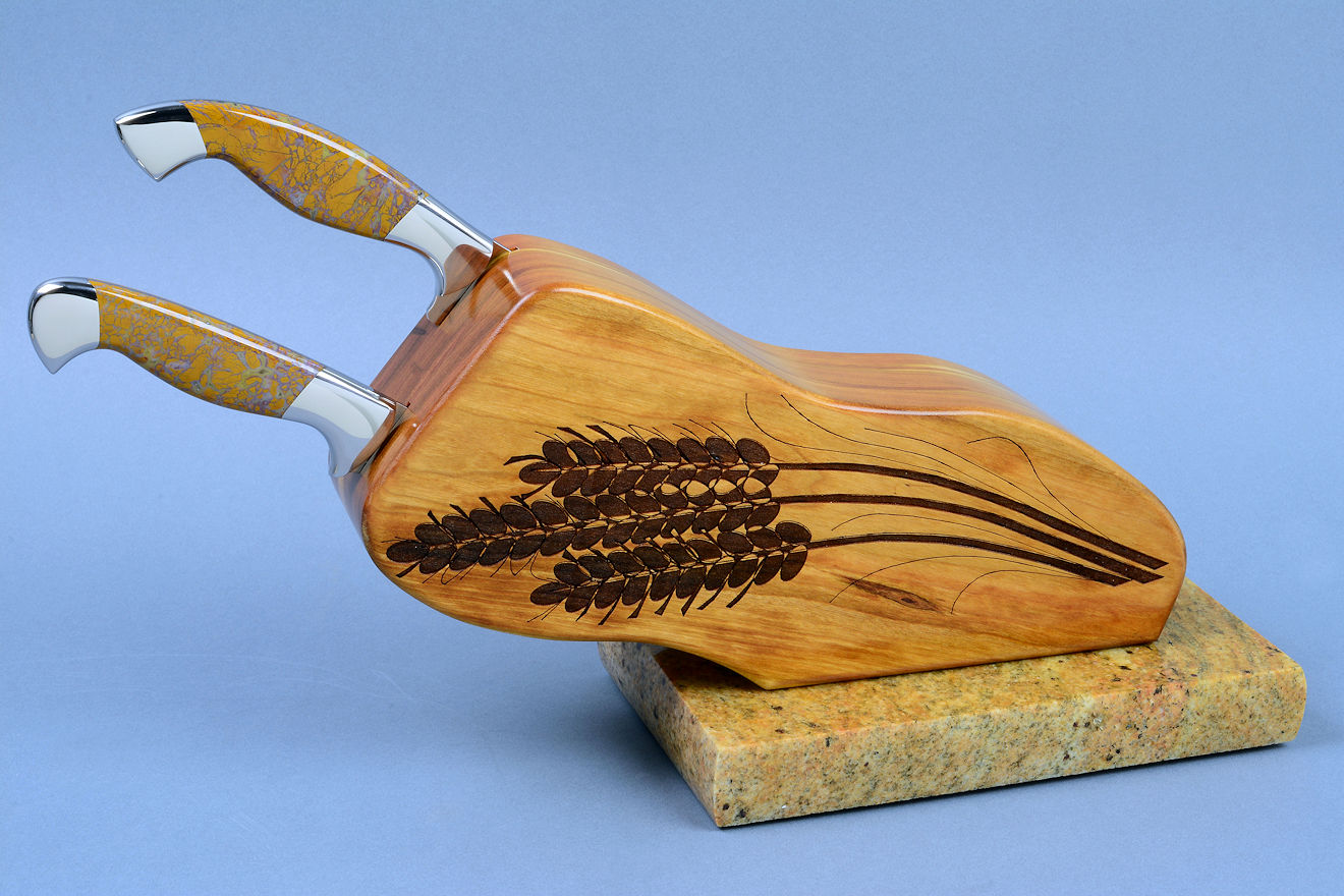 The block for the bread knives had to be complimentary, safe, sturdy, and bold, and it absolutely had to work with the knives. I made this one in American Black Cherry hardwood, commonly called American Cherry, one of our country's most valuable hardwoods. The color of the wood was perfect for the theme, and I built the block around the knives to offer stability and protection, with balance and a great form. Breads are mostly made from wheat grains, so I laser-engraved heavy, full, and bending wheat stalks on the sides of the Cherry, honoring the full harvest that for all of mankind's stay on this earth means so much to be thankful for. How many generations saw stalks heavy with grain and thanked the Almighty for the harvest?
