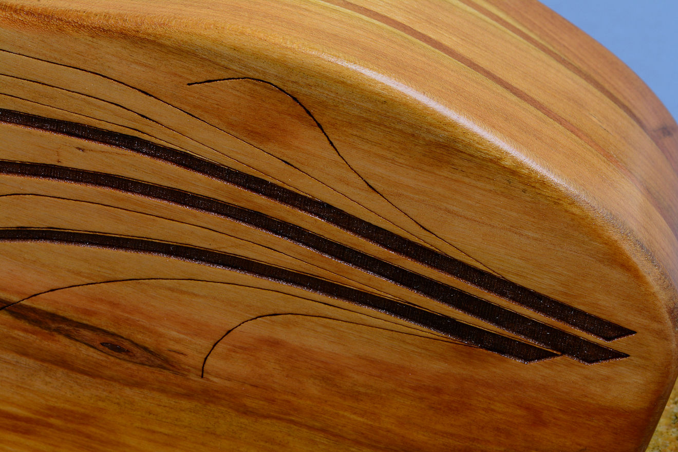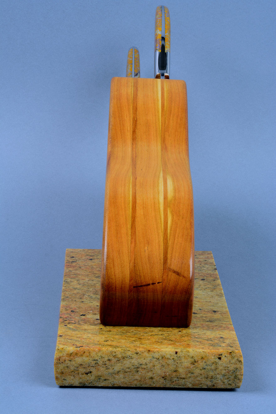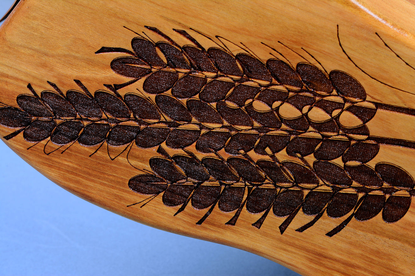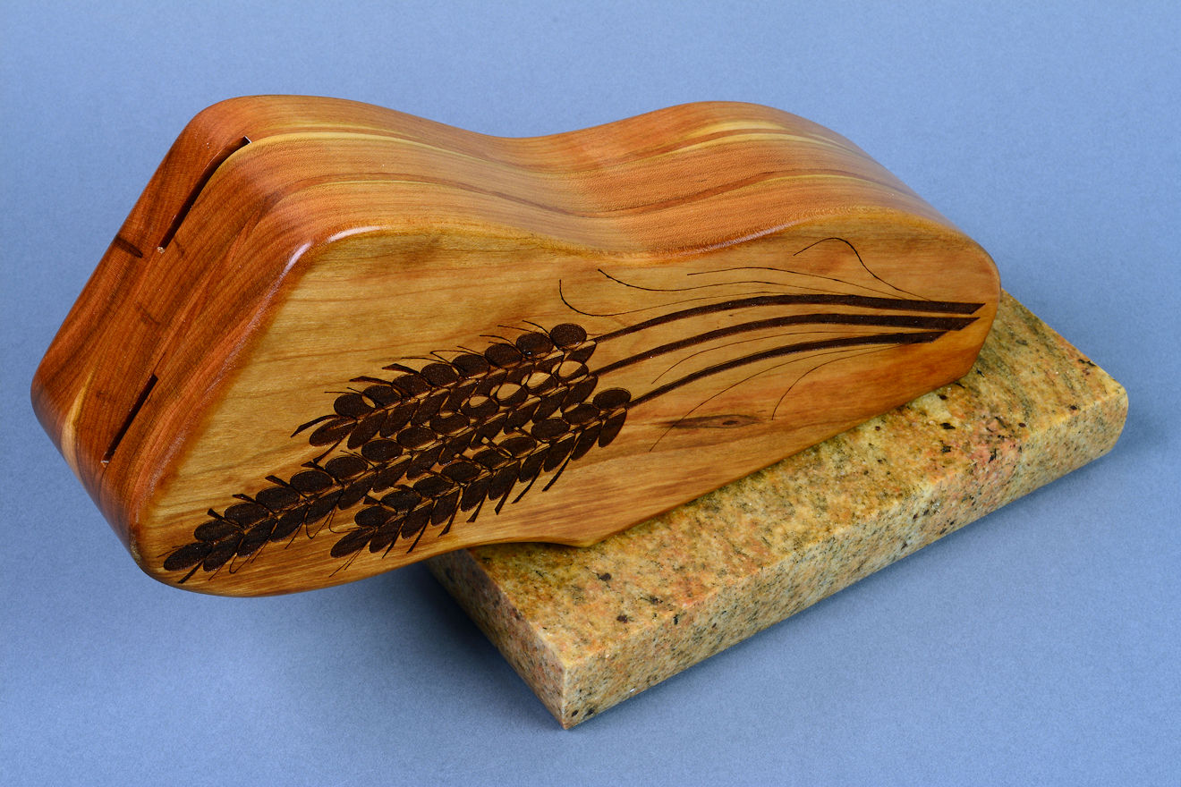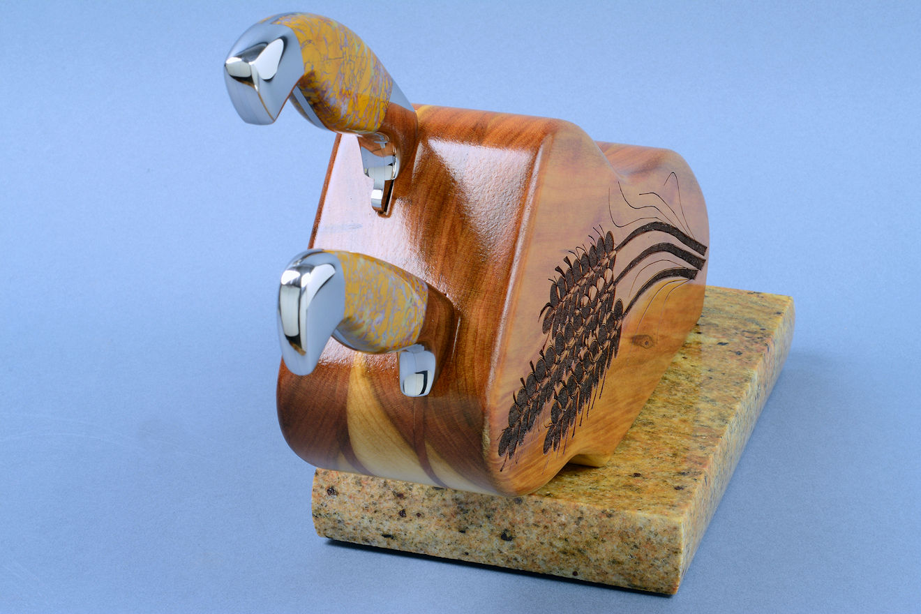 The block for the bread knives had to be complimentary, safe, sturdy, and bold, and it absolutely had to work with the knives. I made this one in American Black Cherry hardwood, commonly called American Cherry, one of our country's most valuable hardwoods. The color of the wood was perfect for the theme, and I built the block around the knives to offer stability and protection, with balance and a great form. Breads are mostly made from wheat grains, so I laser-engraved heavy, full, and bending wheat stalks on the sides of the Cherry, honoring the full harvest that for all of mankind's stay on this earth means so much to be thankful for. How many generations saw stalks heavy with grain and thanked the Almighty for the harvest?