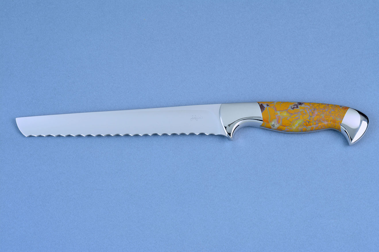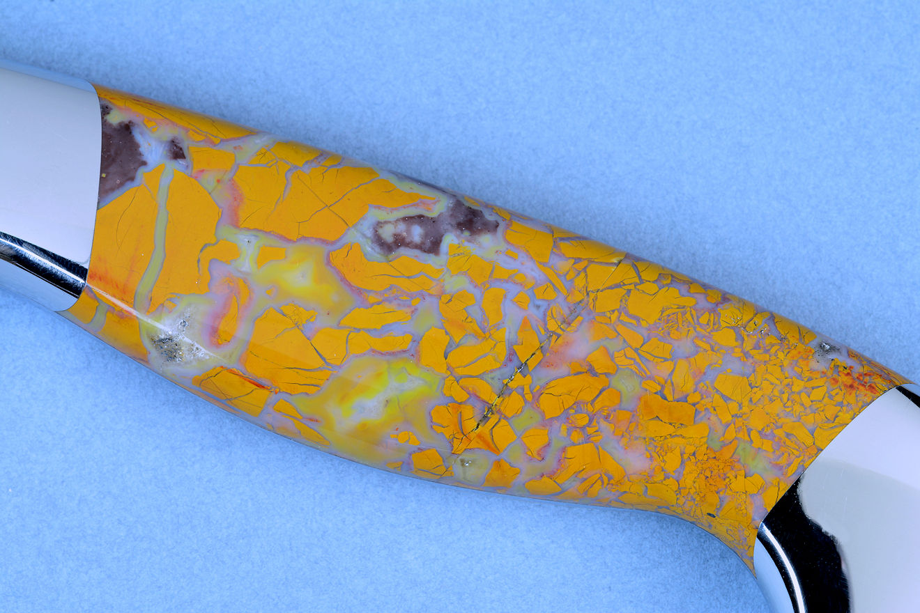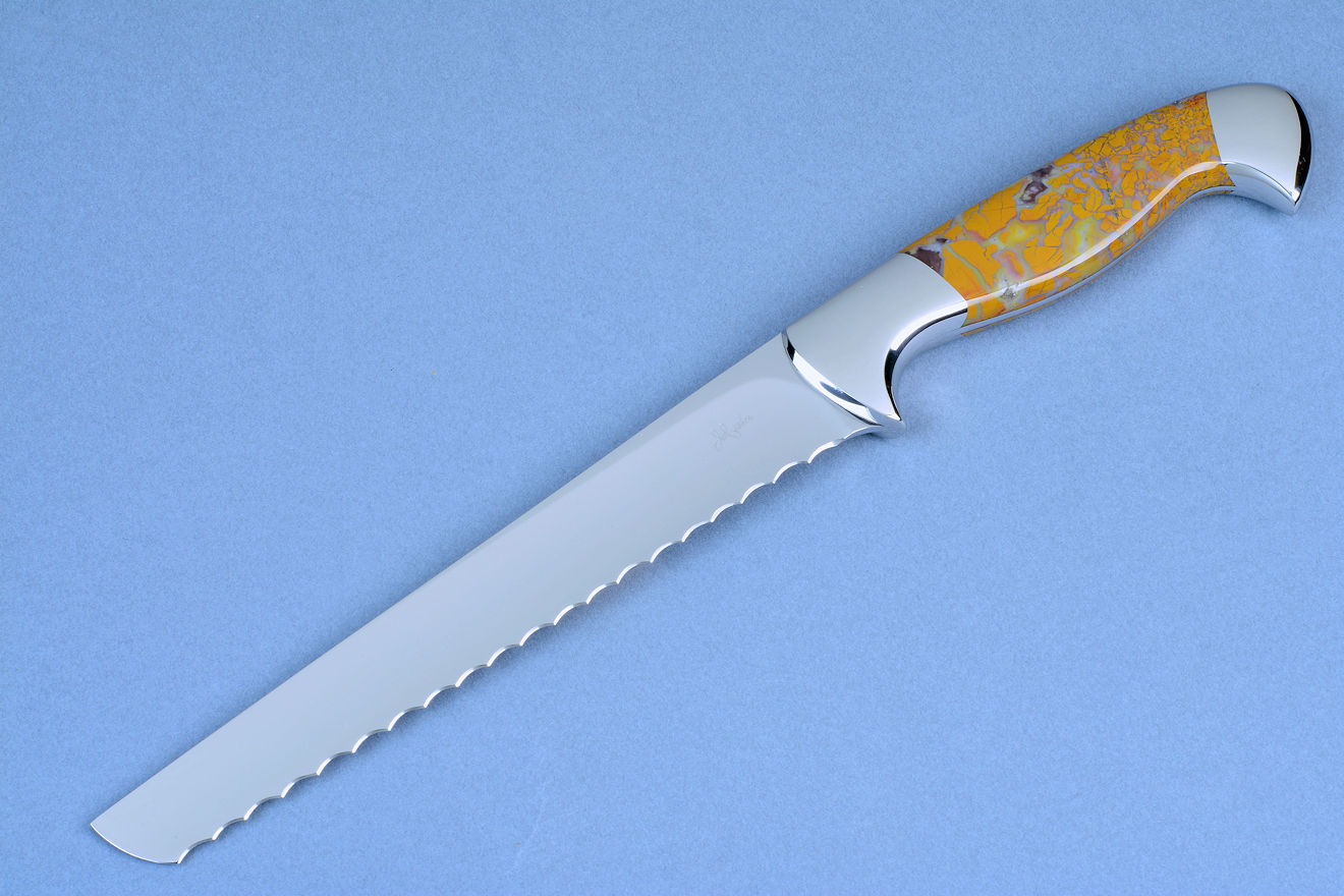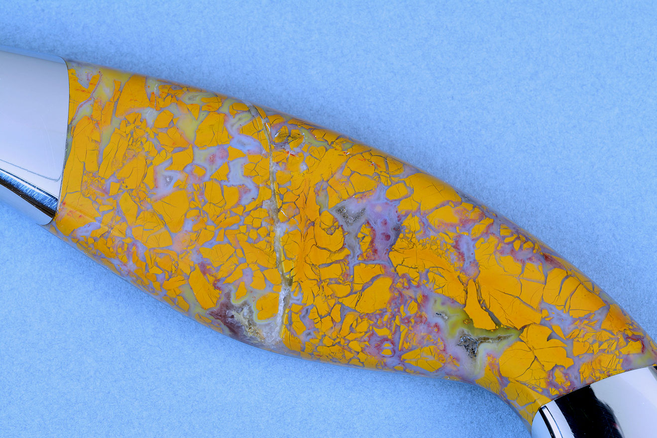 In keeping with the theme and memories of bread: the color, the texture, the feel of warmth, I chose a very distinctive and specific gemstone handle material. This is Stone Canyon Jasper gemstone from the coastal mountains of Monterey County in California. This is a classic lapidary material, used on jewelry and adornment. Seldom does one get to see a large, substantial piece of this magnificent stone, since jewelry is so small overall. More stunning is to pick it up and hold it, cool and dense, and incredibly smooth: it's wonderful to hold.