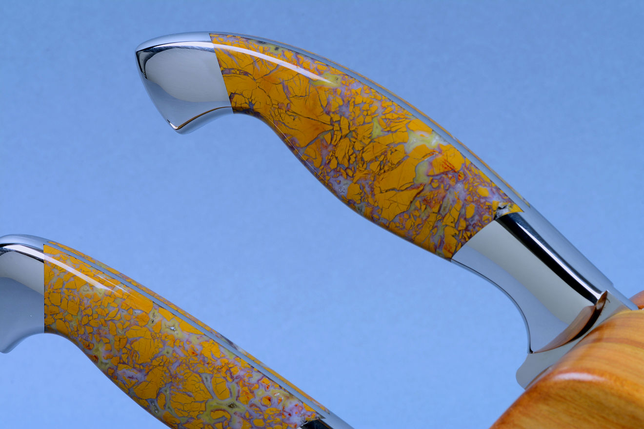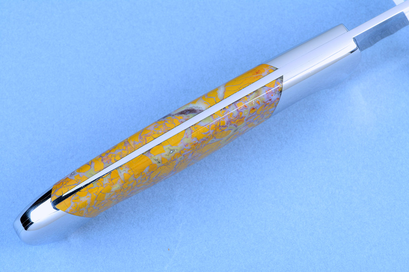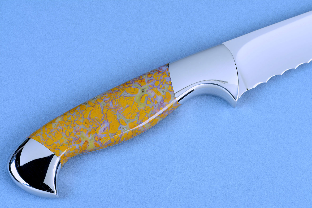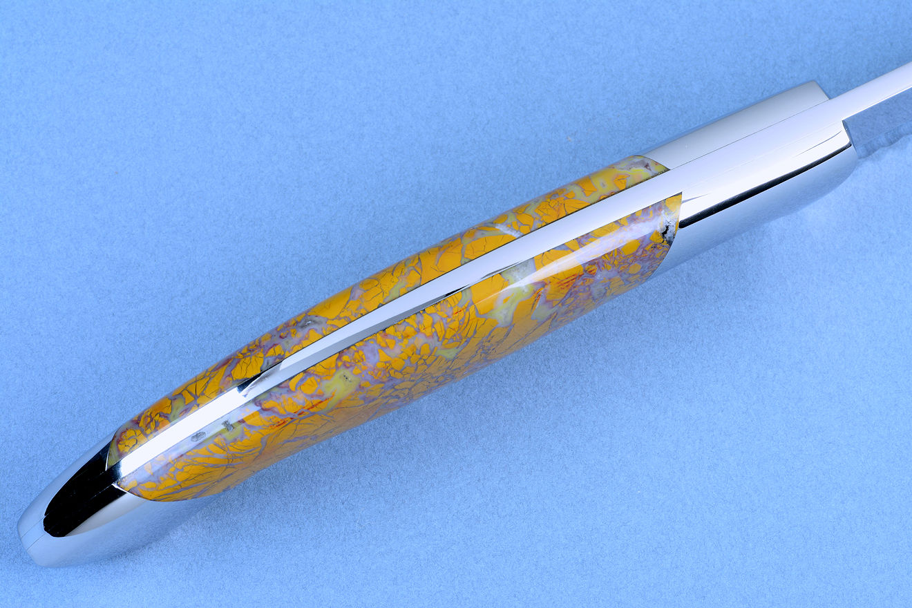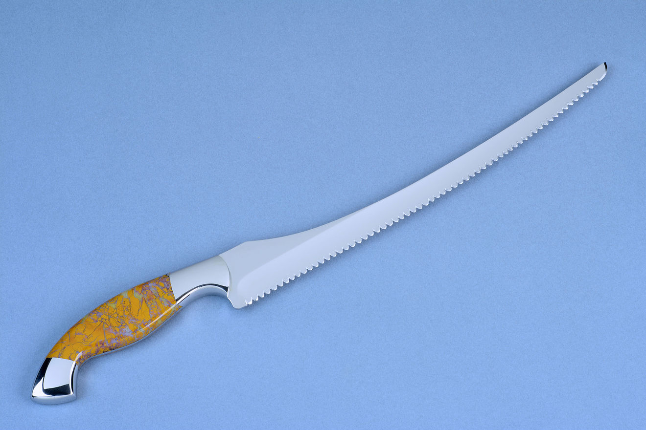 In keeping with the theme and memories of bread: the color, the texture, the feel of warmth, I chose a very distinctive and specific gemstone handle material. This is Stone Canyon Jasper gemstone from the coastal mountains of Monterey County in California. This is a classic lapidary material, used on jewelry and adornment. Seldom does one get to see a large, substantial piece of this magnificent stone, since jewelry is so small overall. More stunning is to pick it up and hold it, cool and dense, and incredibly smooth: it's wonderful to hold.