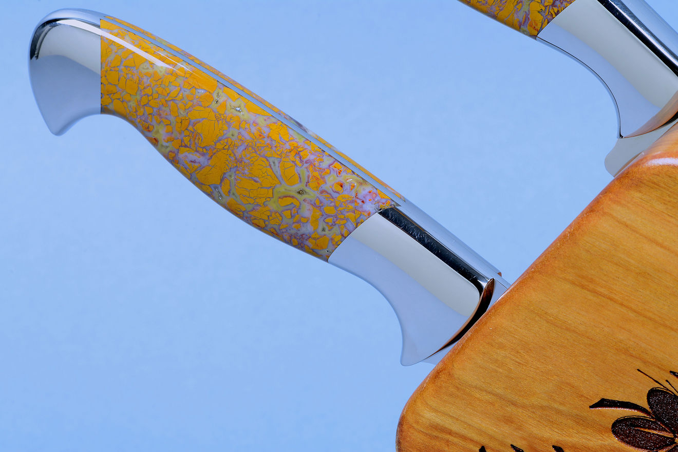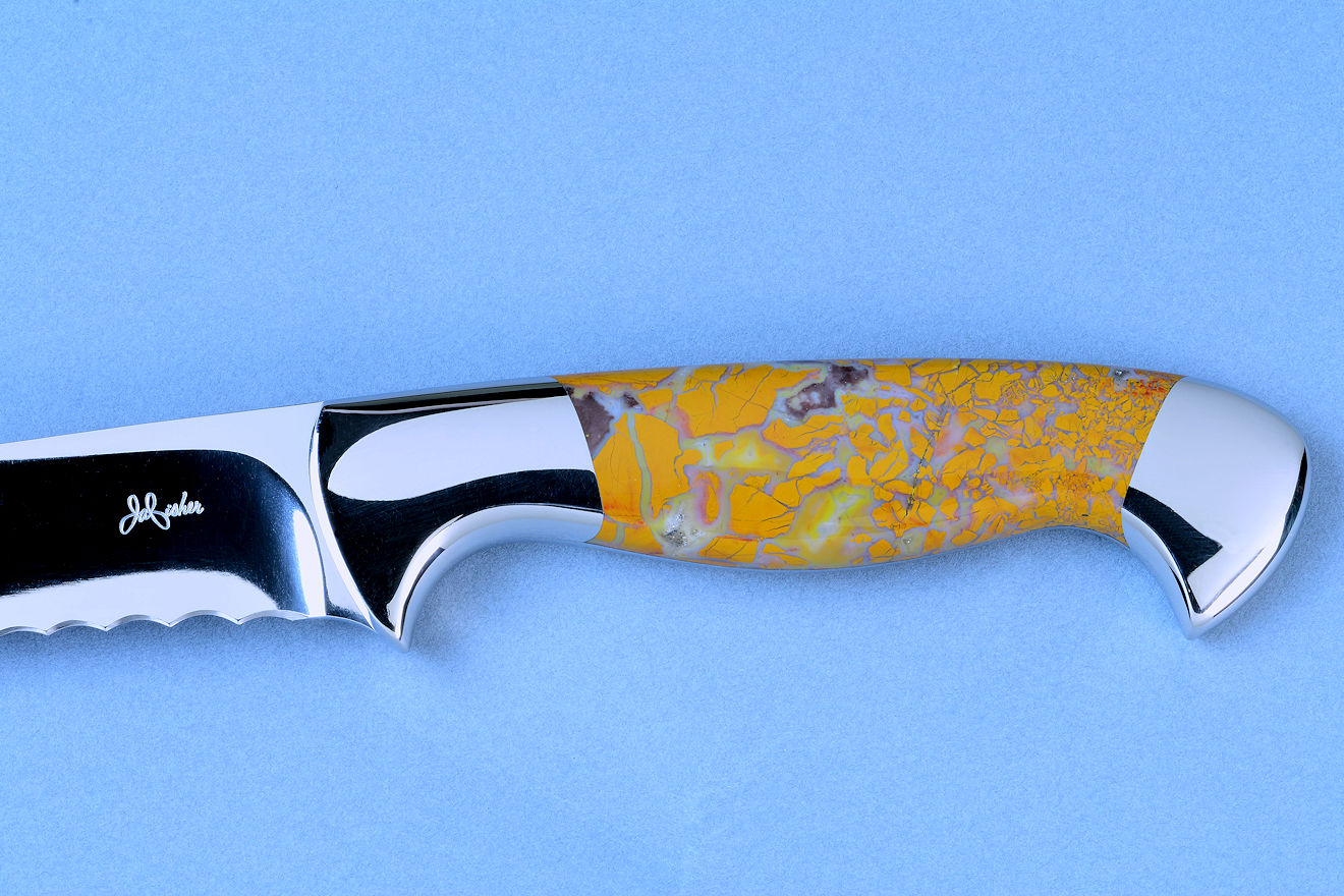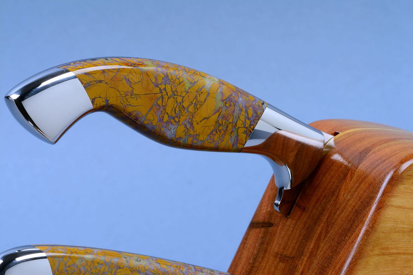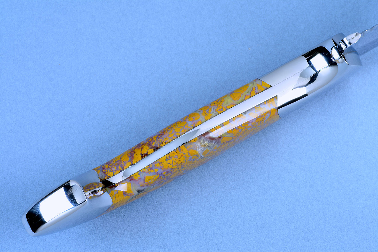 In keeping with the theme and memories of bread: the color, the texture, the feel of warmth, I chose a very distinctive and specific gemstone handle material. This is Stone Canyon Jasper gemstone from the coastal mountains of Monterey County in California. This is a classic lapidary material, used on jewelry and adornment. Seldom does one get to see a large, substantial piece of this magnificent stone, since jewelry is so small overall. More stunning is to pick it up and hold it, cool and dense, and incredibly smooth: it's wonderful to hold.