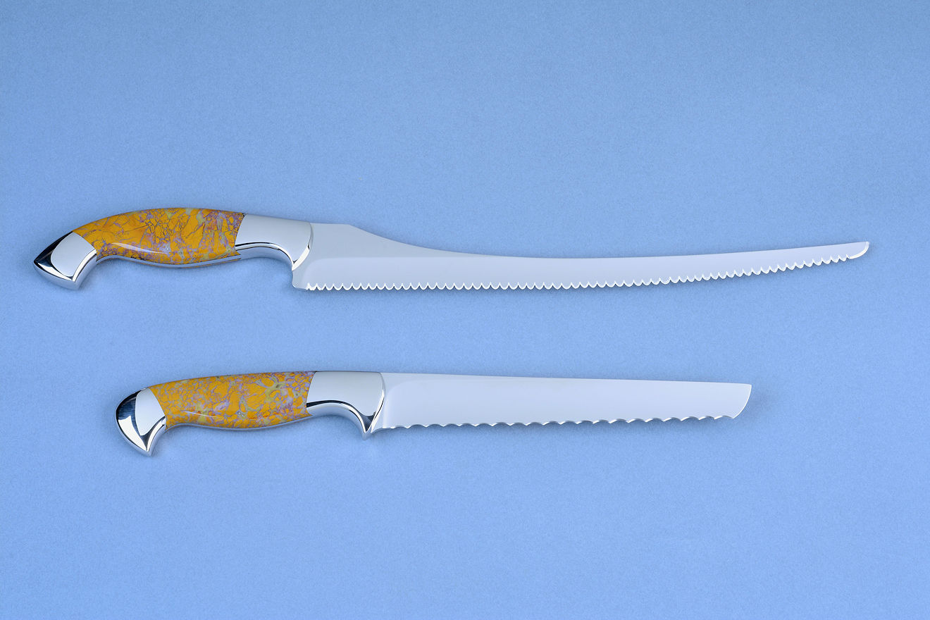 This is a pair of bread knives that begs to be used, enjoyed, and cherished by a family in a setting of warmth and comfort. It was an honor for me to make this fine set, and I hope you enjoy the photos as much as I enjoyed making the piece!