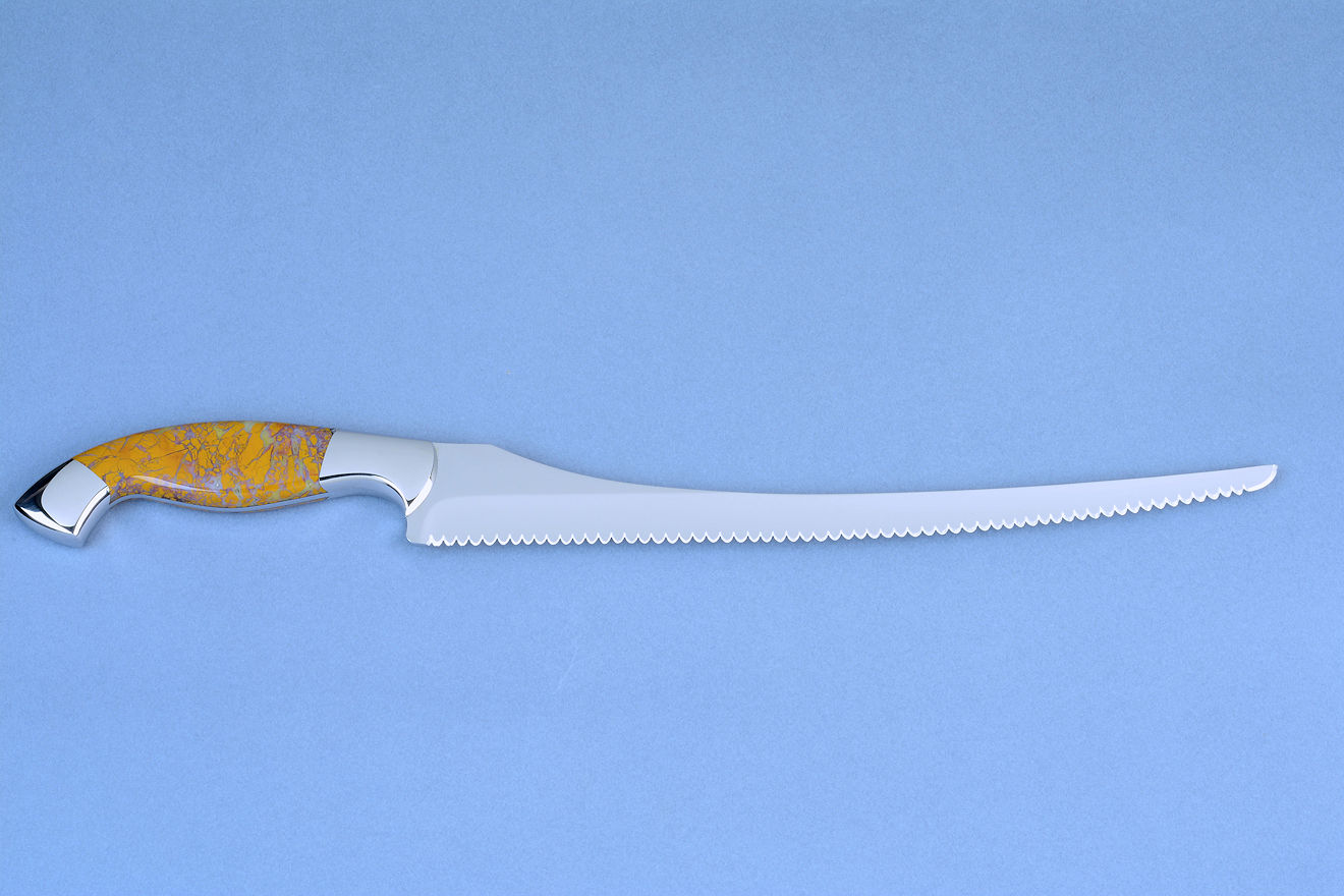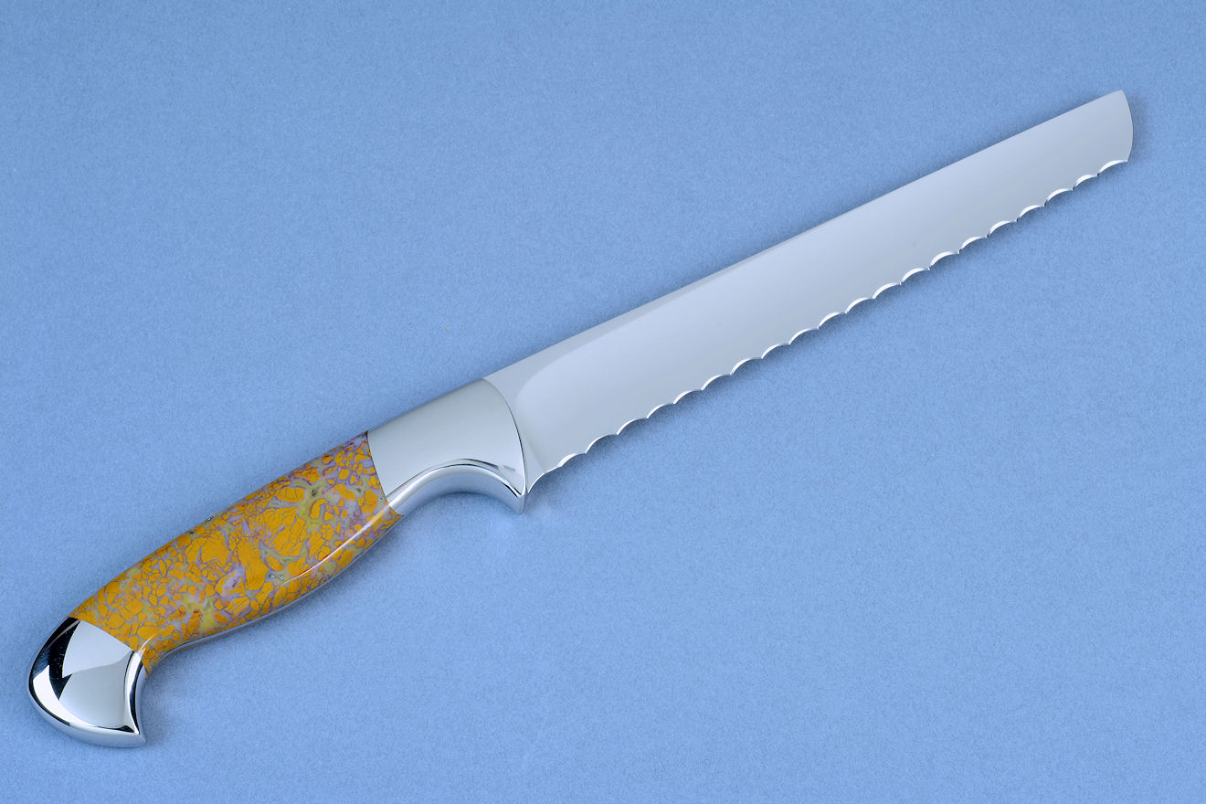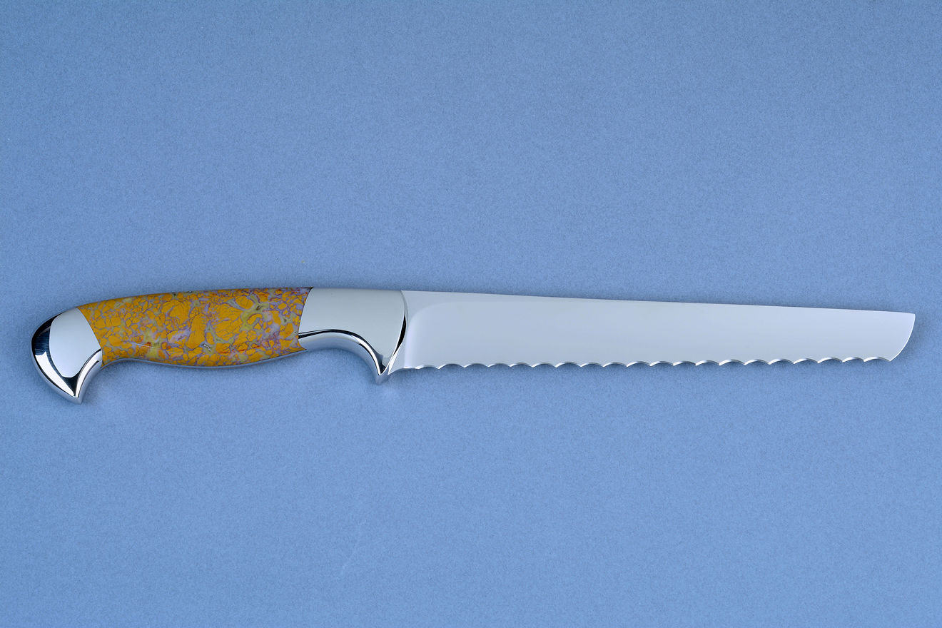 The Sasserides is a popular pattern of mine for bread knives, because the blade is long, elegant, and lean. Since the steel is very tough, and since the grind is hollow, the blade has very little flexing in use. The graceful lines are eclipsed by the tight, continuous "mini-curtain" serrations I've made on the blade, each one meticulously hand-cut and hand-sharpened for the correct geometry. This allows an aggressive cutting of hard, large, crusty loaves, like roundbreads, boules, sourdough pans, braided breads, and challahs. The serration profile slices with little tearing, and the sharpened tip and blade curvature will allow complete cutting through the bottom of the hardened loaf crusts.
