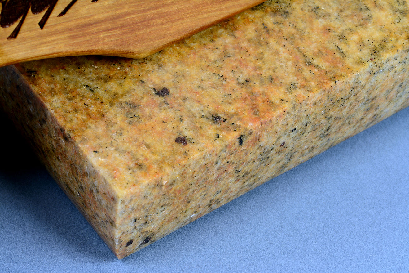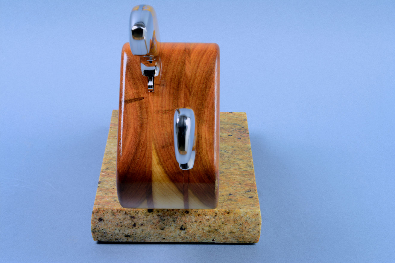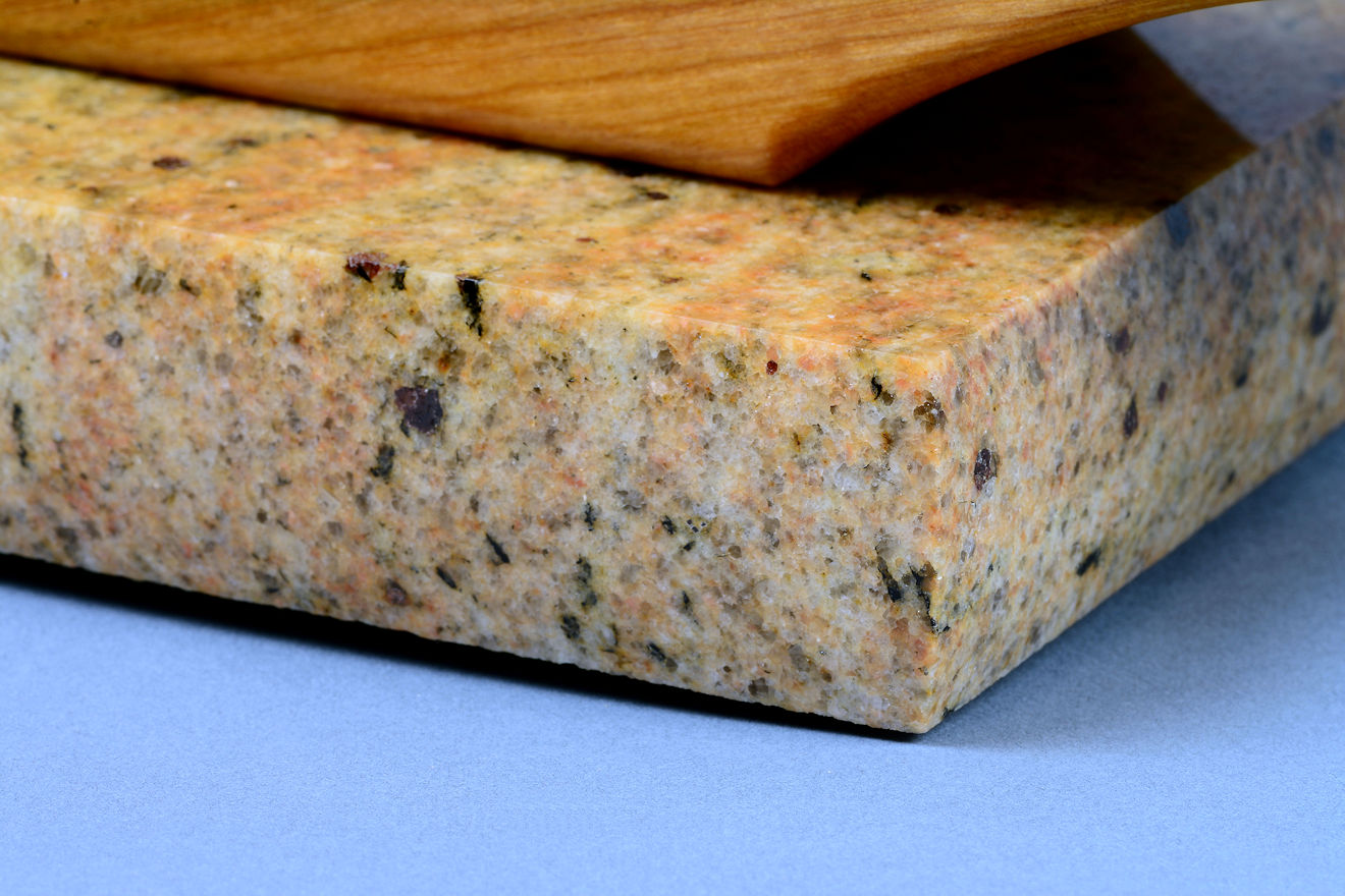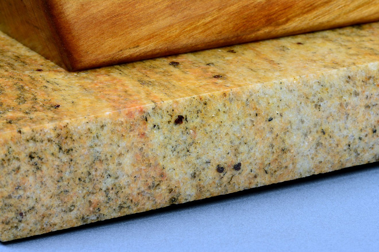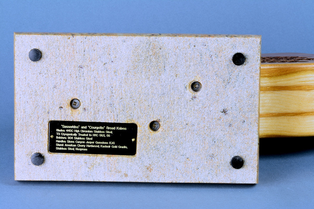 The Granite had to match the project and the theme completely, so I searched for just the right color, tone, and accents. I found it in Kashmir Granite with Garnets, from India. This is a rich, golden granite with hints of reddish highlights, just like the Stone Canyon Jasper, and just like bread, all warm and golden and toasty. This particular granite has Garnets throughout, bits of rich red precious gemstone to accent the thick stone. I cut, carved, and polished the granite, and attached the block so that the piece is extremely stable and solid. Into the bottom of the Kashmir Granite, I inset neoprene feet for a stable, shock-resisting, non-sliding grip on the countertop, allowing air to circulate underneath to keep things dry and hygienic. One of my engraved black lacquered brass legend plates is set into a routed pocket in the base, so that the provenance and materials are always identifiable and clear. It's permanently sealed for longevity and protection against splashes.