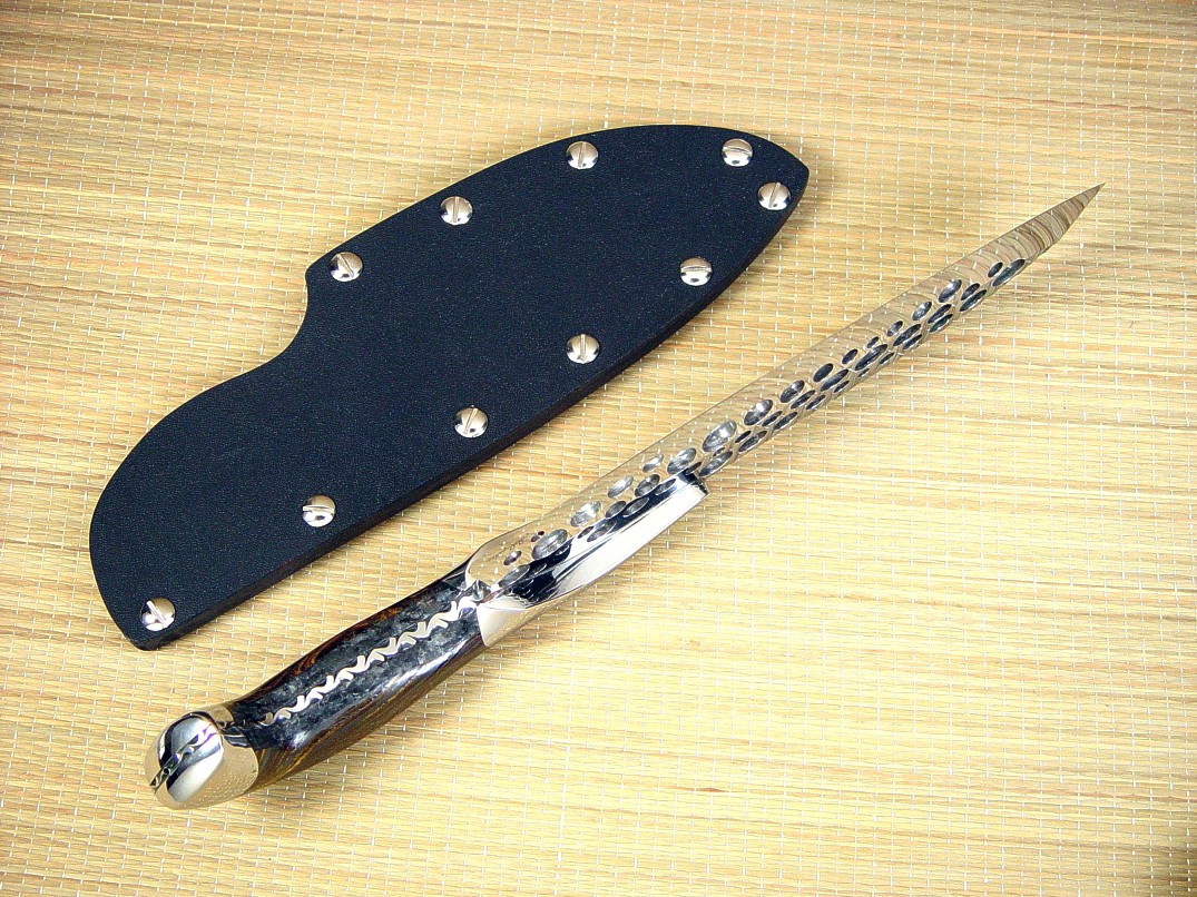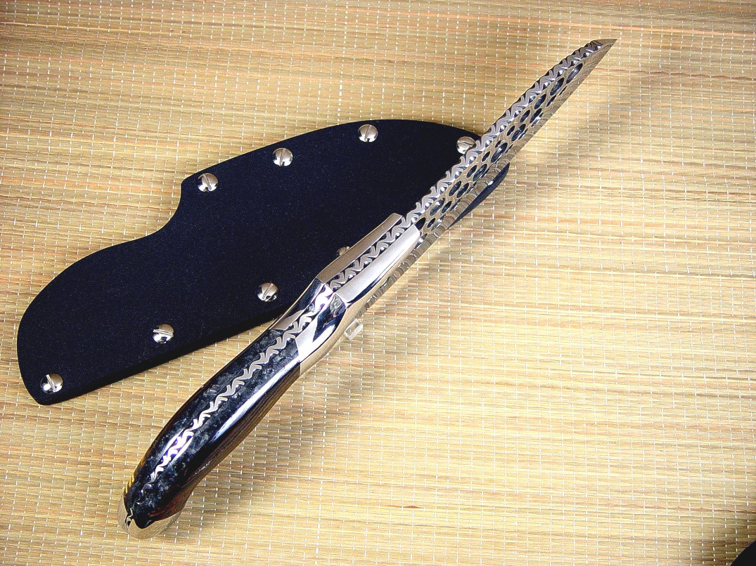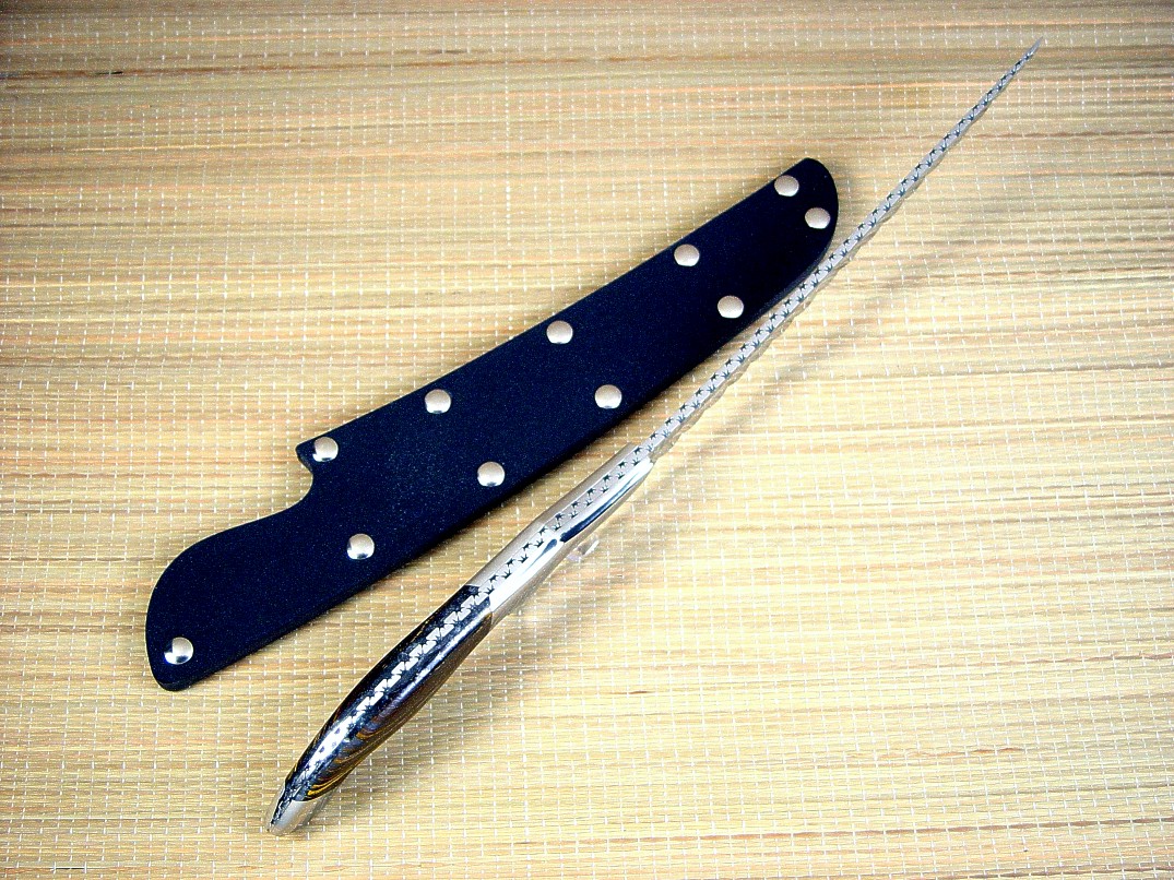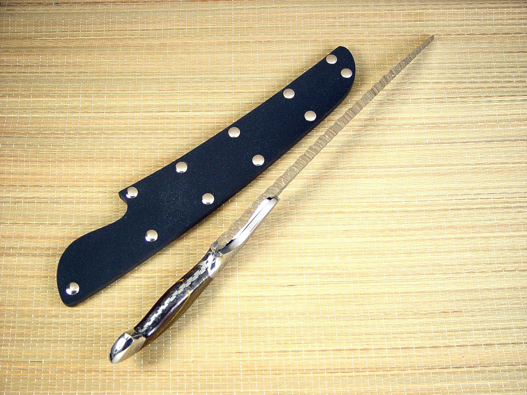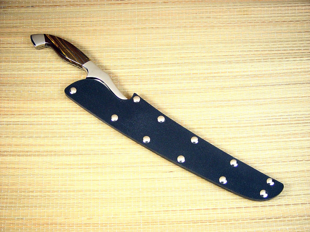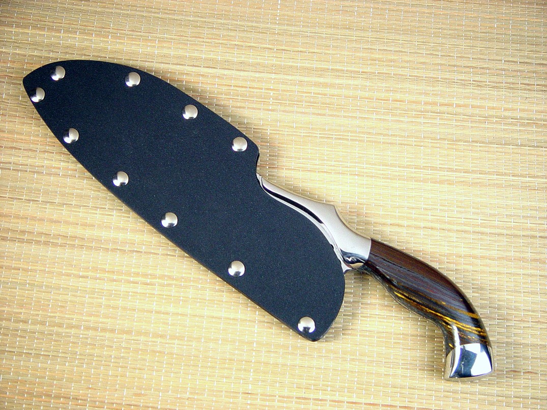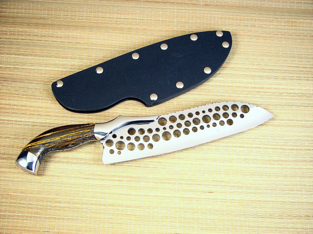 Saussure is a masterpiece of blade evolution. What started out as the Vega group design has evolved into this master chef's knife made for the serious chef. This is a massive knife, made from .250" thick stock, and nine inches of cutting edge lengths is definitely not a dainty Japanese sushi knife! Don't let the meaty blade fool you, it's got one of the thinnest, most aggressive hollow grinds I've ever executed, and is super-razor-keen at the cutting edge. The weight of the blade will help it glide through most cutting chores, and the entire knife is remarkably well balanced. The curvature of the edge allows comfortable cuts and mincing, and the multitude of artistic milled holes will help with food release from the polished stainless steel. The front bolster extends along the spine, creating a convenient purchase for a top pinch-style grip. The handle is massive, full, and round, designed to reduce fatigue and provide a comfortable angled grip that allows the wrist a relaxed angle. This is a fantastic, full, and gorgeous master's knife.
